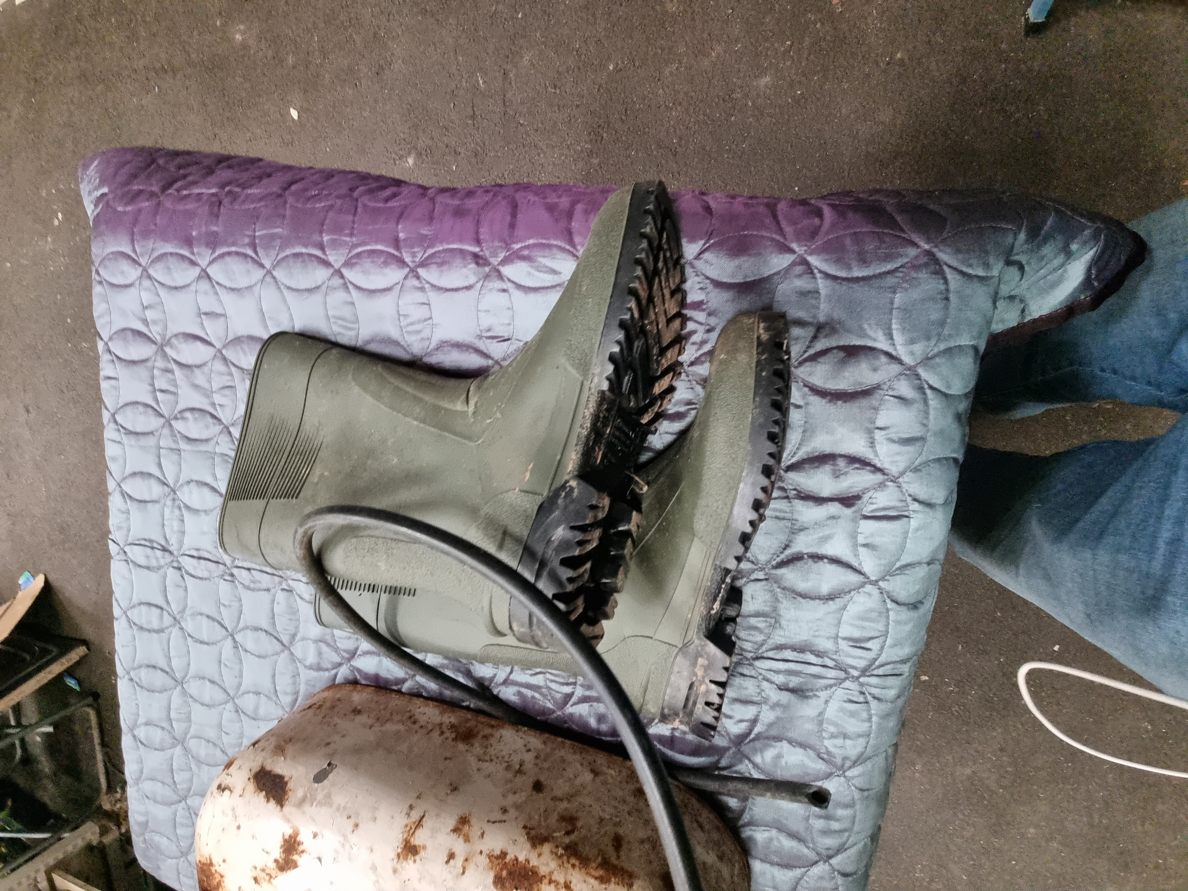A collection comprising a portable metal fuel tank and a pair of rubber boots. The fuel tank is of a horizontal, rounded rectangular form with a cream-painted finish. It is constructed from metal and features a central fixed carrying handle, a threaded filler cap, and an attached black rubber fuel line equipped with a manual squeeze primer bulb. Two small paper adhesive labels are affixed to the tank body, bearing the numbers 694 and 5766. The pair of Wellington-style boots are fashioned from olive green rubber with heavy black synthetic treaded soles. The boots feature ribbed detailing to the upper calf and reinforced sections at the heel and toe. No manufacturer or maker marks are clearly legible on either item.