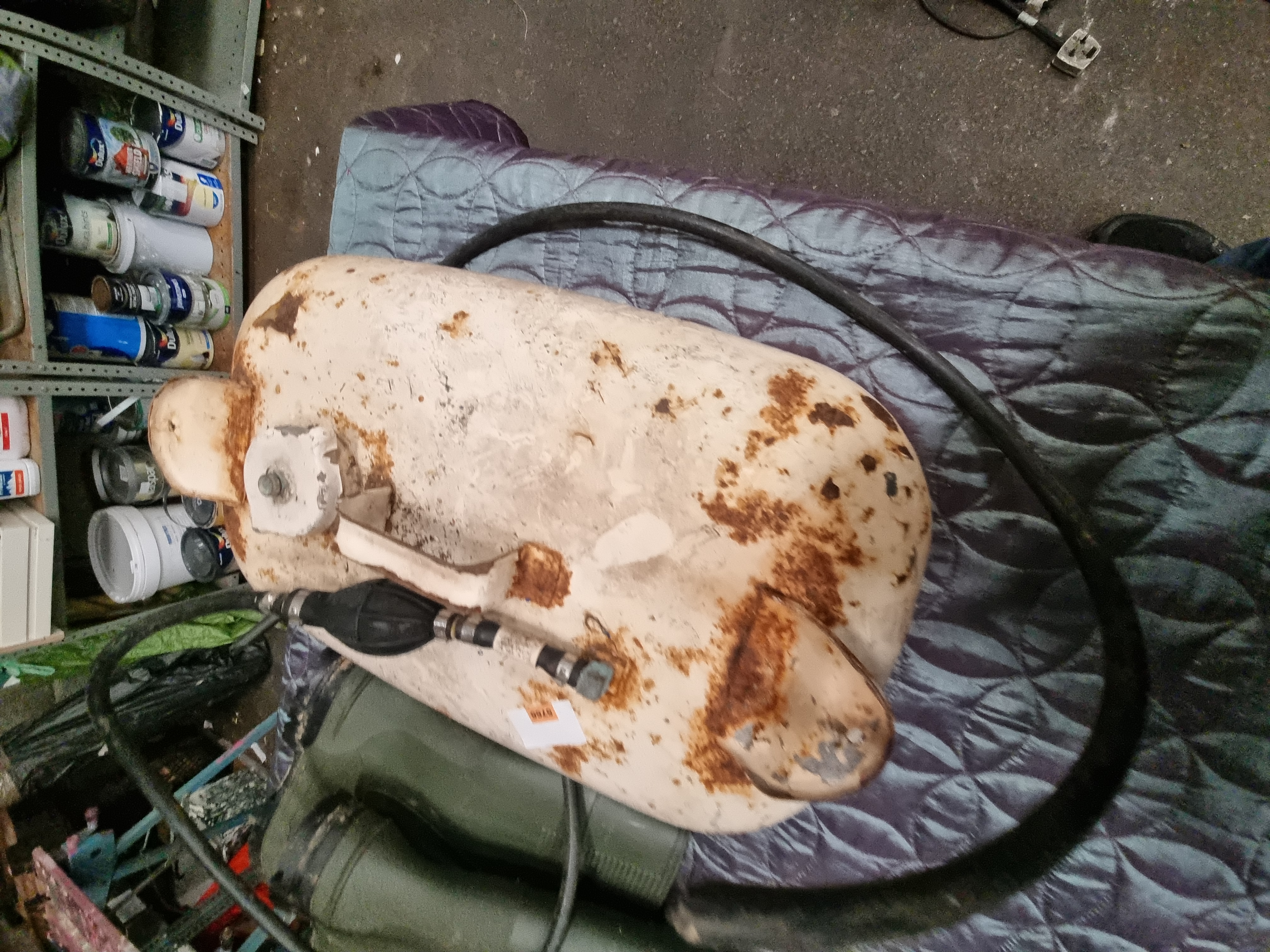 The fuel tank is in a heavily used state, exhibiting significant surface rust, atmospheric corrosion, and widespread paint loss across the exterior. The interior condition is unknown. The rubber hose and primer bulb show signs of age-related wear but remain flexible. The boots show evidence of previous use, including soil deposits on the soles and light abrasions to the rubber surfaces.