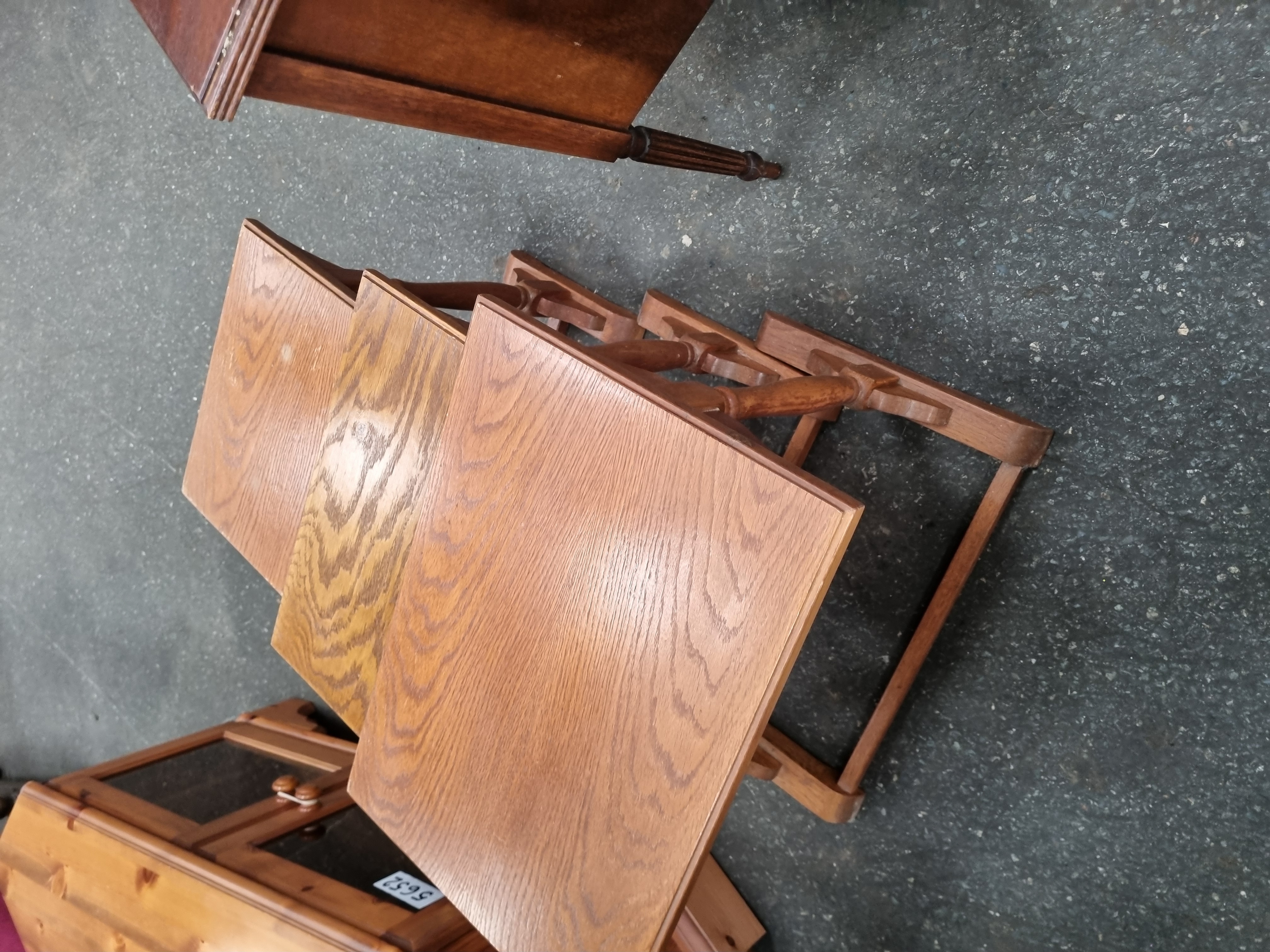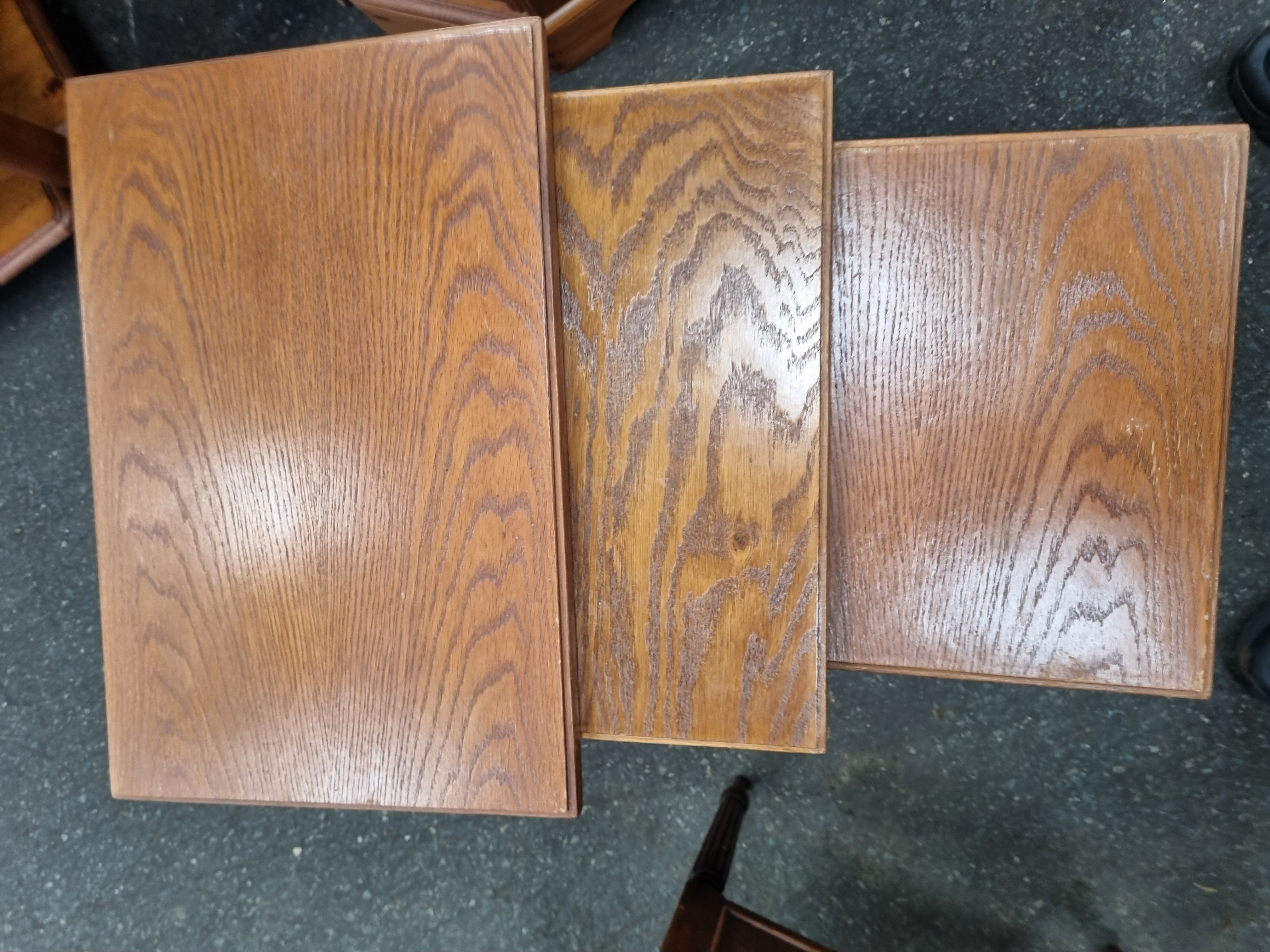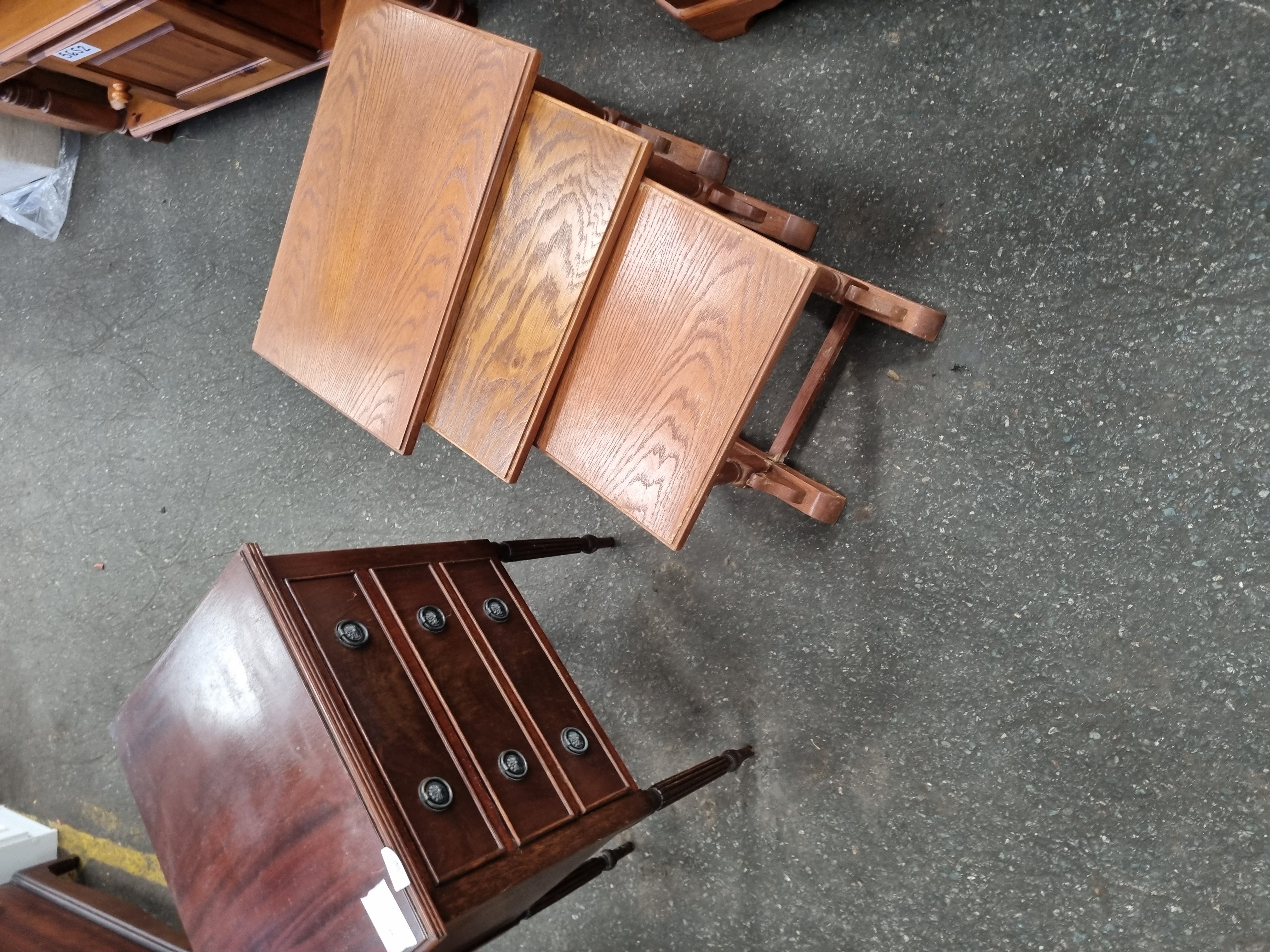 A Regency style reproduction side chest and a nest of three oak occasional tables. The side chest is constructed from mahogany and mahogany veneers, featuring a rectangular top with a moulded edge. It contains three drawers, each fitted with twin circular decorative ring pulls with a foliate motif. The piece is supported by four fluted and ring-turned tapering legs. The nest of three tables is made from solid oak in a traditional style. Each table has a rectangular top with bevelled edges, supported by a trestle-style base with turned uprights and sledge feet. No maker’s marks are present. The items bear auction house labels, one handwritten reading SMALL CHEST 3 DRAWER and OAK NEST OF TABLES and another marked with the number 940.