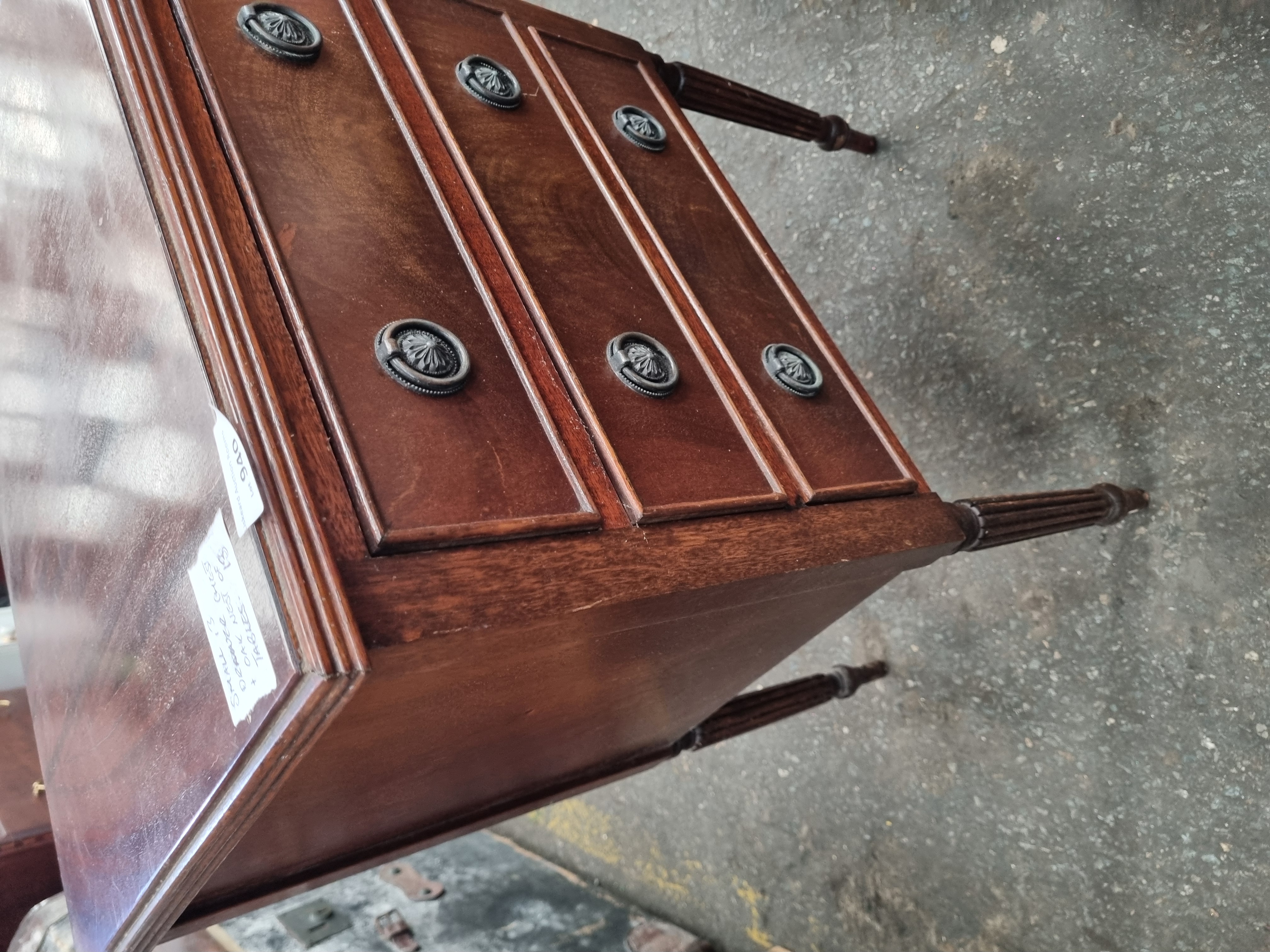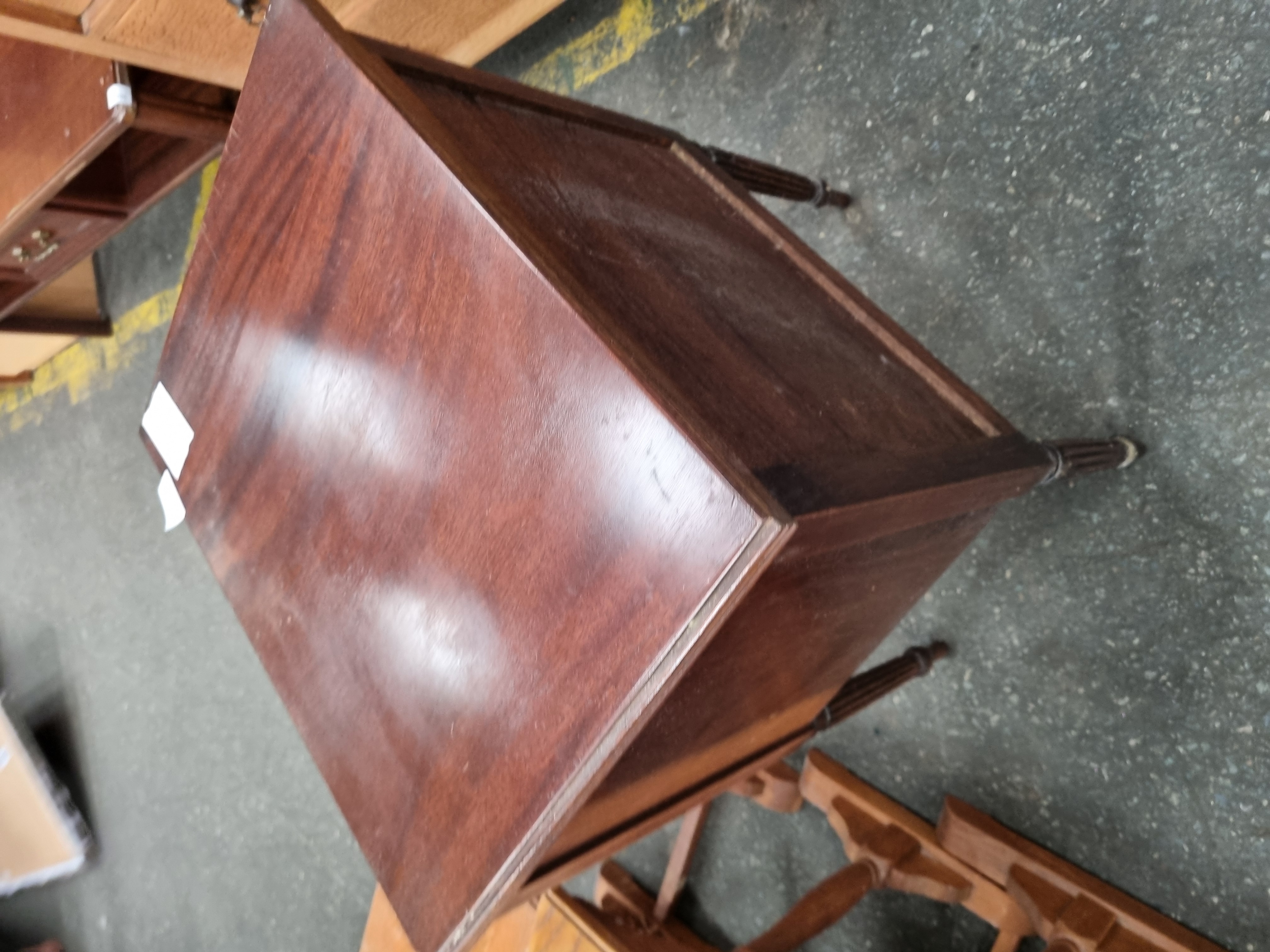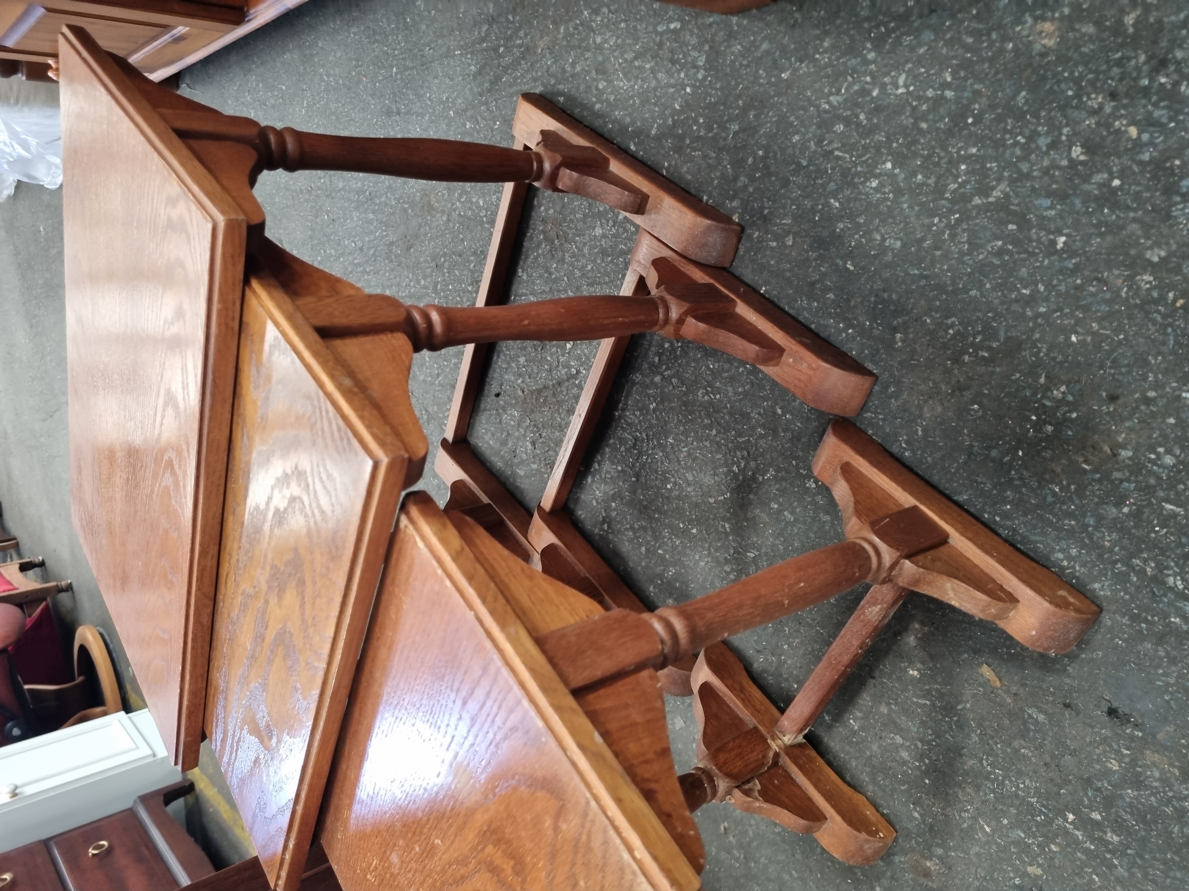 A Regency style reproduction side chest and a nest of three oak occasional tables. The side chest is constructed from mahogany and mahogany veneers, featuring a rectangular top with a moulded edge. It contains three drawers, each fitted with twin circular decorative ring pulls with a foliate motif. The piece is supported by four fluted and ring-turned tapering legs. The nest of three tables is made from solid oak in a traditional style. Each table has a rectangular top with bevelled edges, supported by a trestle-style base with turned uprights and sledge feet. No maker’s marks are present. The items bear auction house labels, one handwritten reading SMALL CHEST 3 DRAWER and OAK NEST OF TABLES and another marked with the number 940.