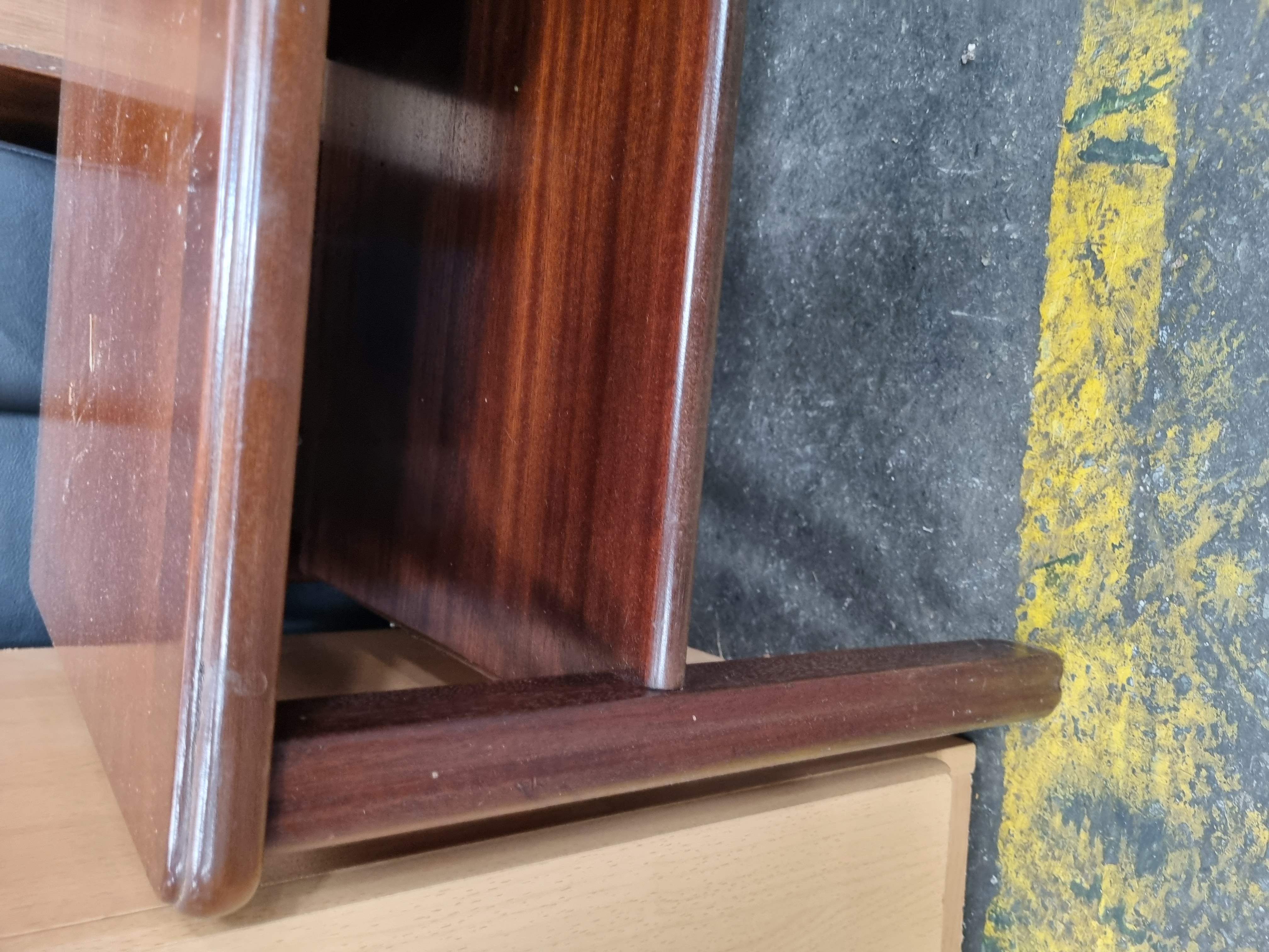 The table is in fair to good condition. The top surface and edges exhibit visible scratches and minor scuffs consistent with age and use. A faint circular ring mark is present on the top surface. The brass-effect drawer handle shows signs of age-related tarnishing.