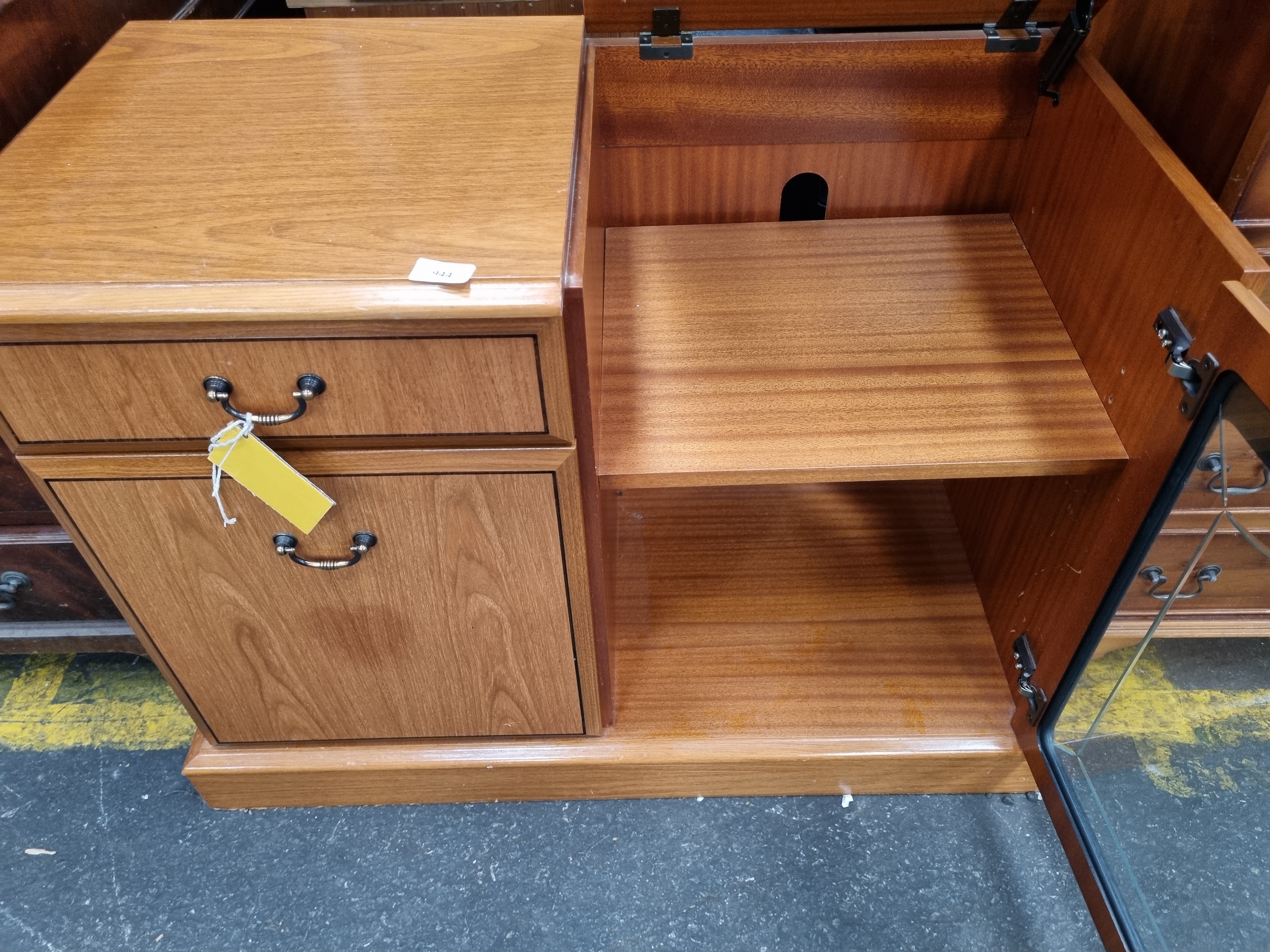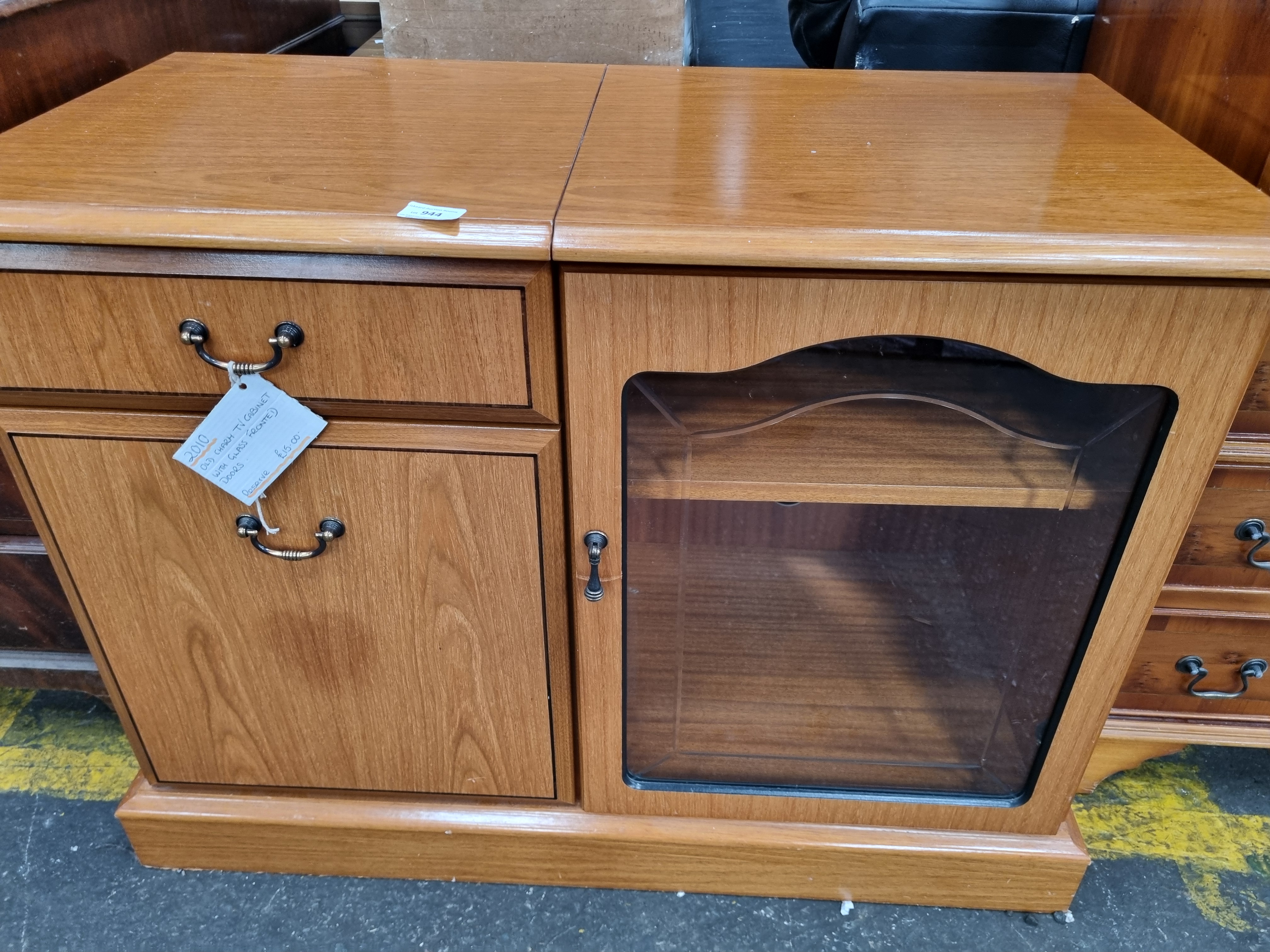 This media and television cabinet is from the Old Charm range by Wood Bros, designed in the Tudor-revival style. The single-piece unit is constructed with light oak-coloured wood veneers over an engineered wood core. The right-hand section is configured for media equipment, featuring a lift-up top lid for access to top-loading devices, an arched leaded-glass door, a central shelf, and a circular cable management aperture in the rear panel. The left-hand section consists of a single frieze drawer over a cupboard door. The cupboard interior is fitted with vertical wooden dividers and plastic slotted racks designed for CD or cassette storage. The cabinet is finished with patinated antiqued metal drop-loop handles on circular backplates and modern concealed hinges, all supported by a continuous plinth base.