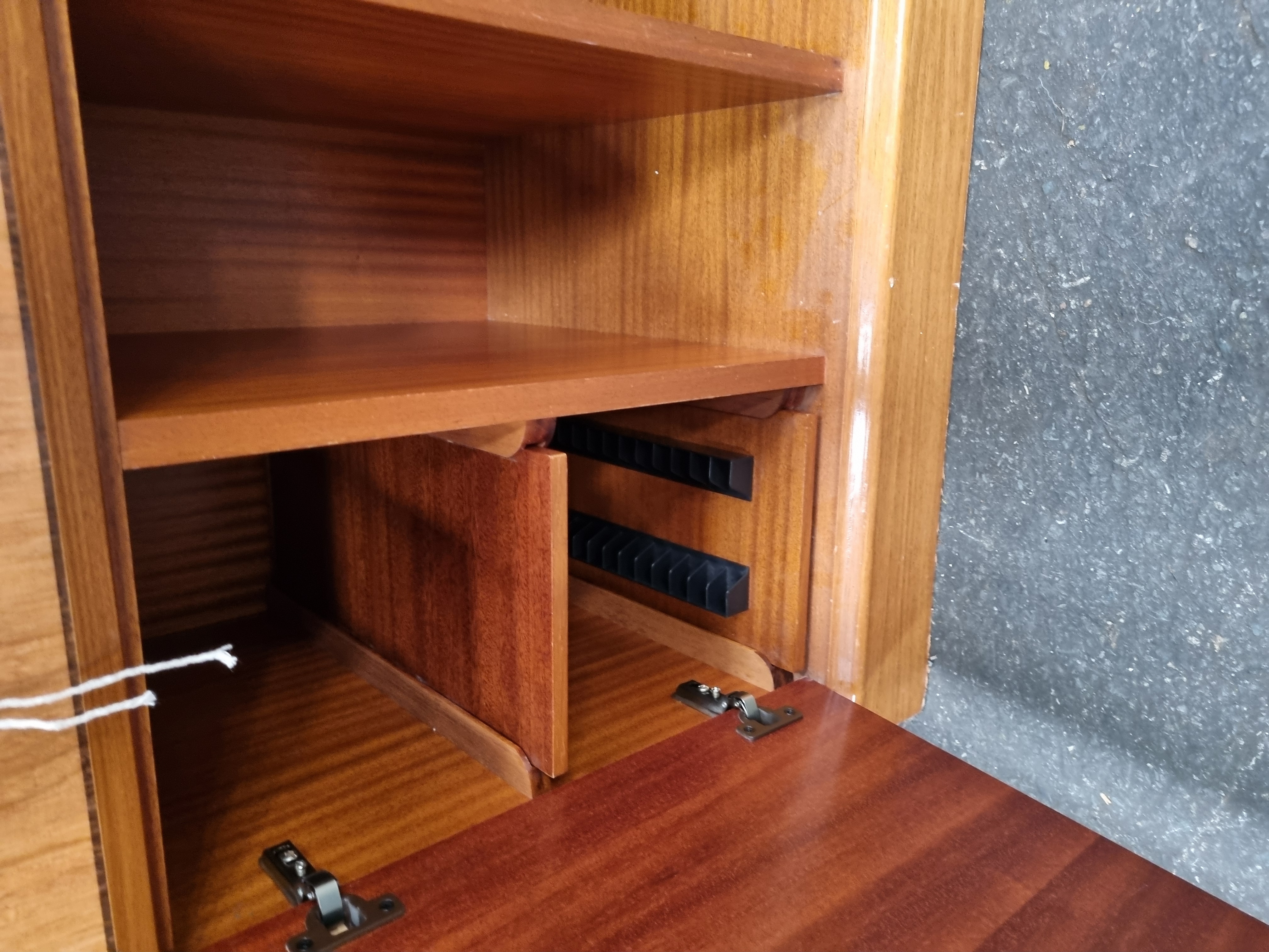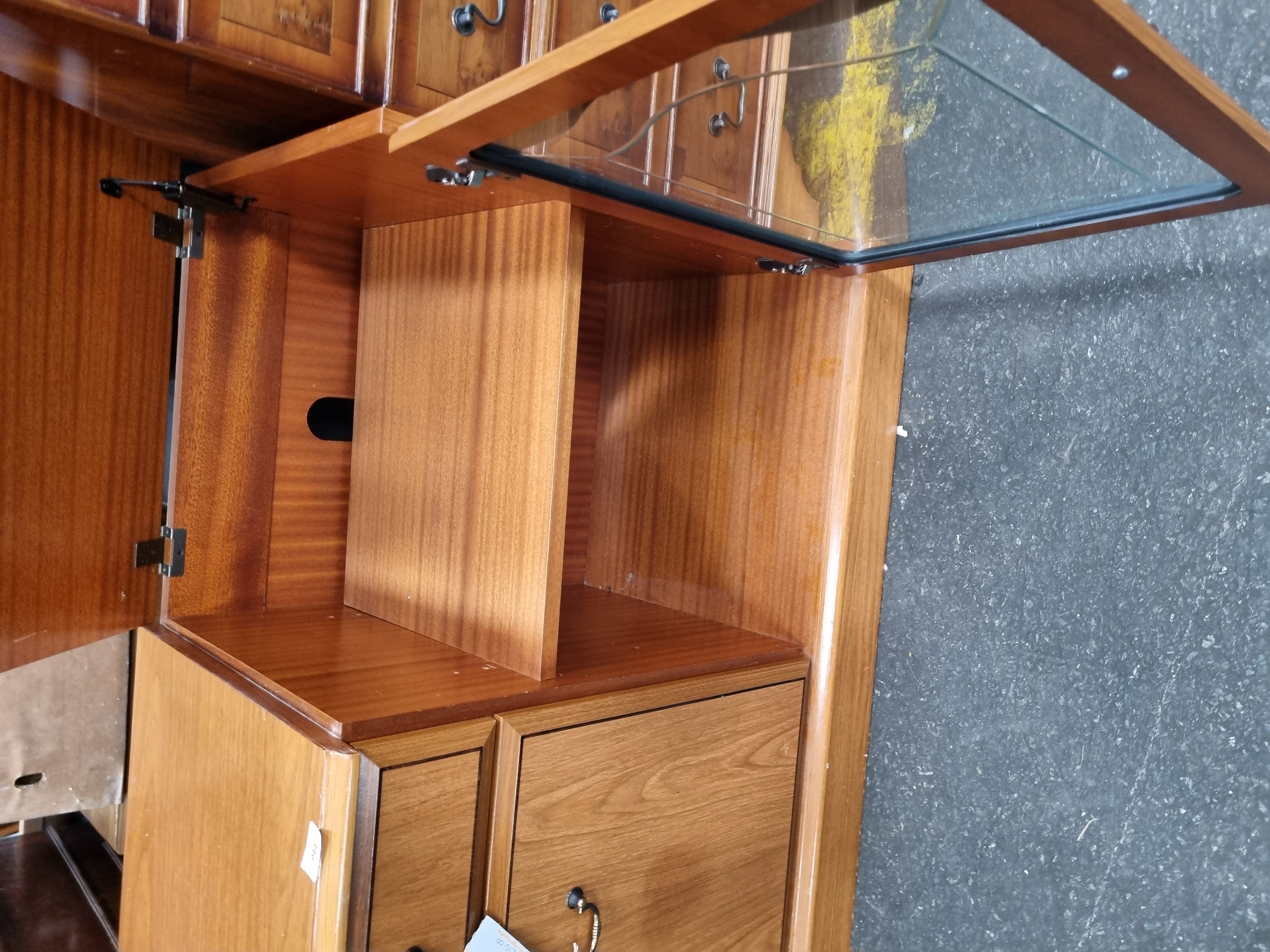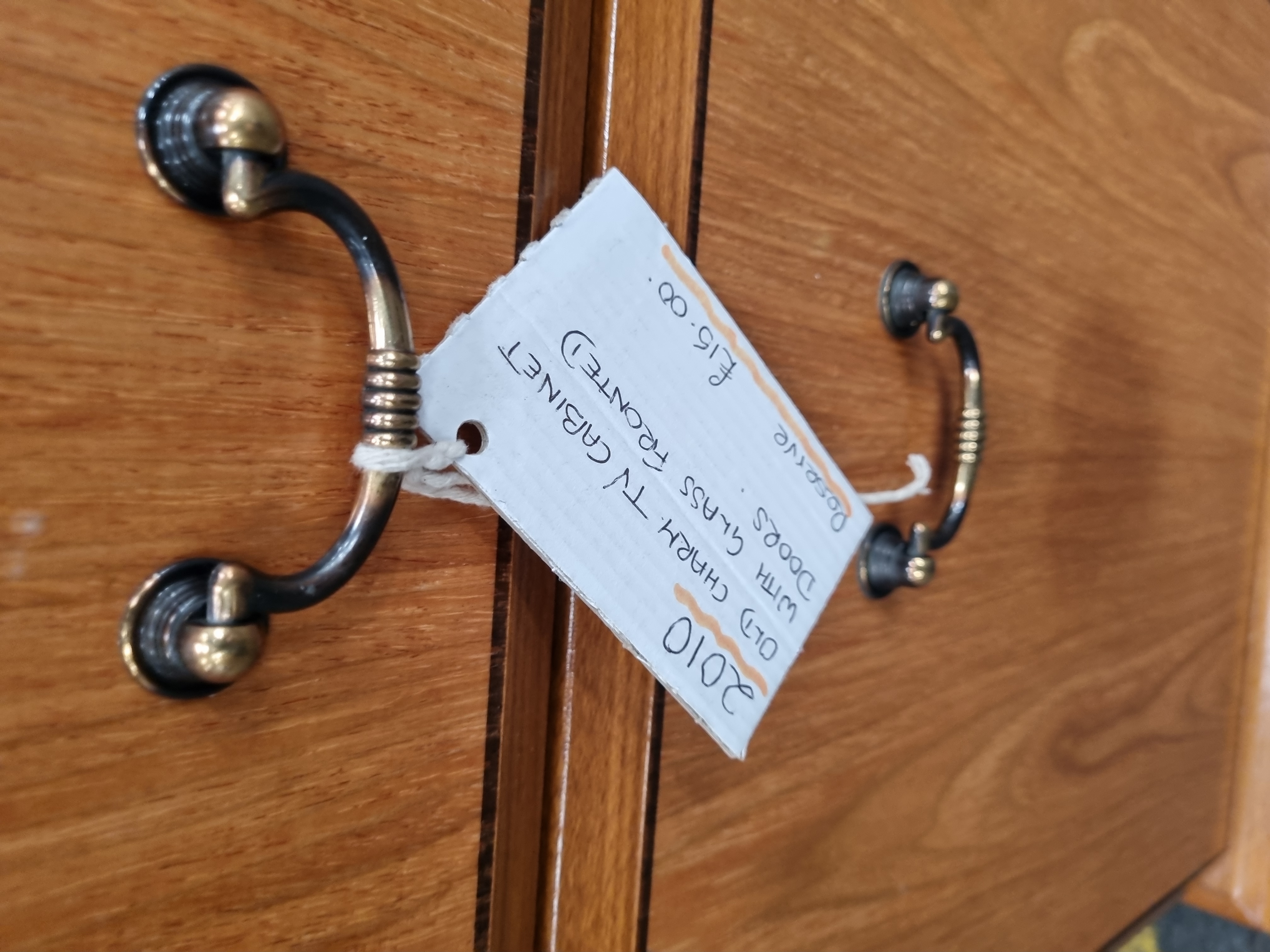 The cabinet exhibits minor surface wear and light scratches consistent with age and domestic use. The leaded glazing is intact and the hardware appears original.