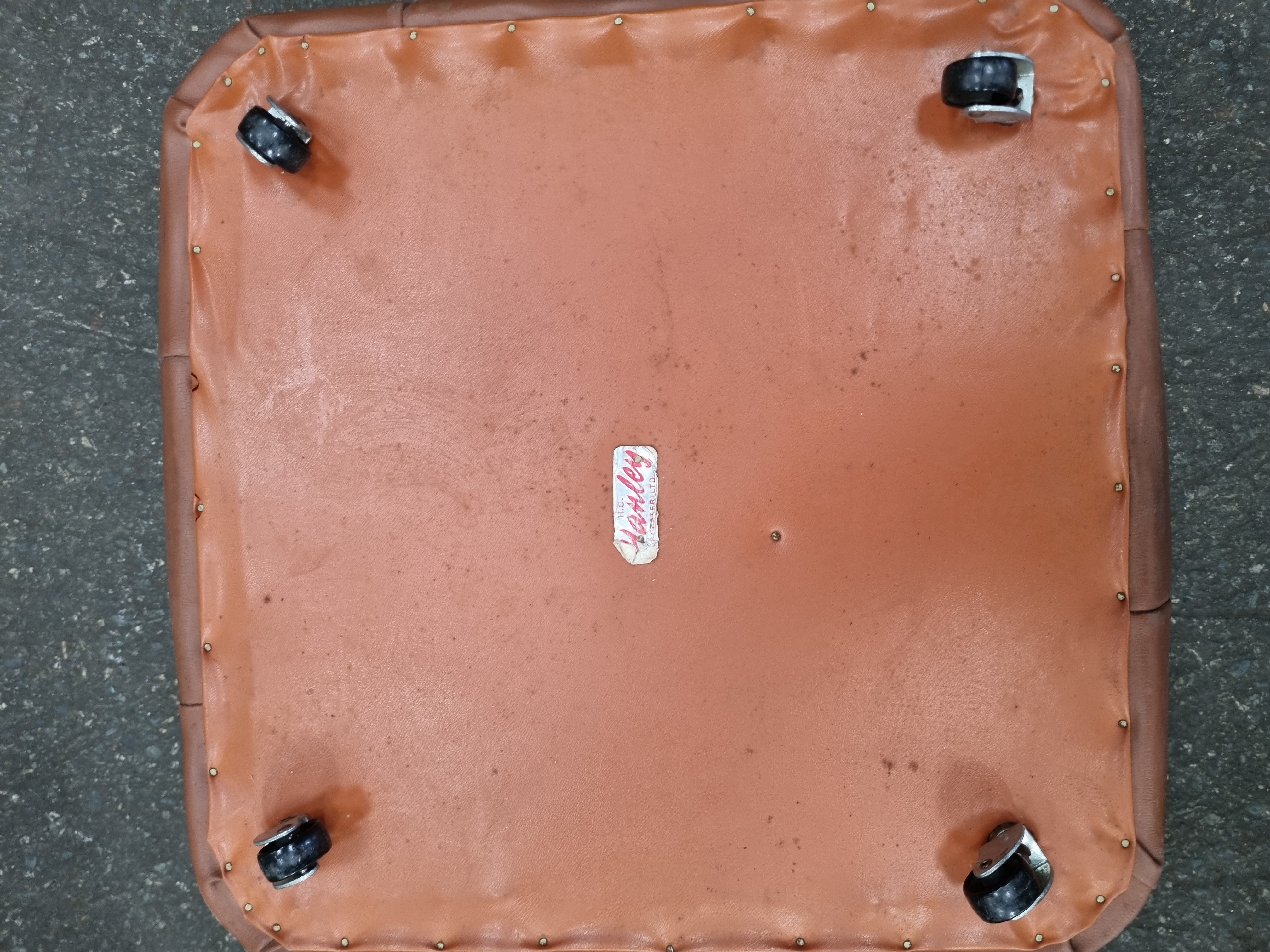 A mid-century modern square upholstered footstool or ottoman finished in tan leather. The top features a four-button tufted surface and piped edges. The piece is supported by four black twin-wheel castors. To the underside, the item retains a manufacturer’s label for H.C. Hanley Colchester Ltd. The underside lining is secured with metal tacks. An auction lot tag for Liskeard Auction Rooms is present on one side.