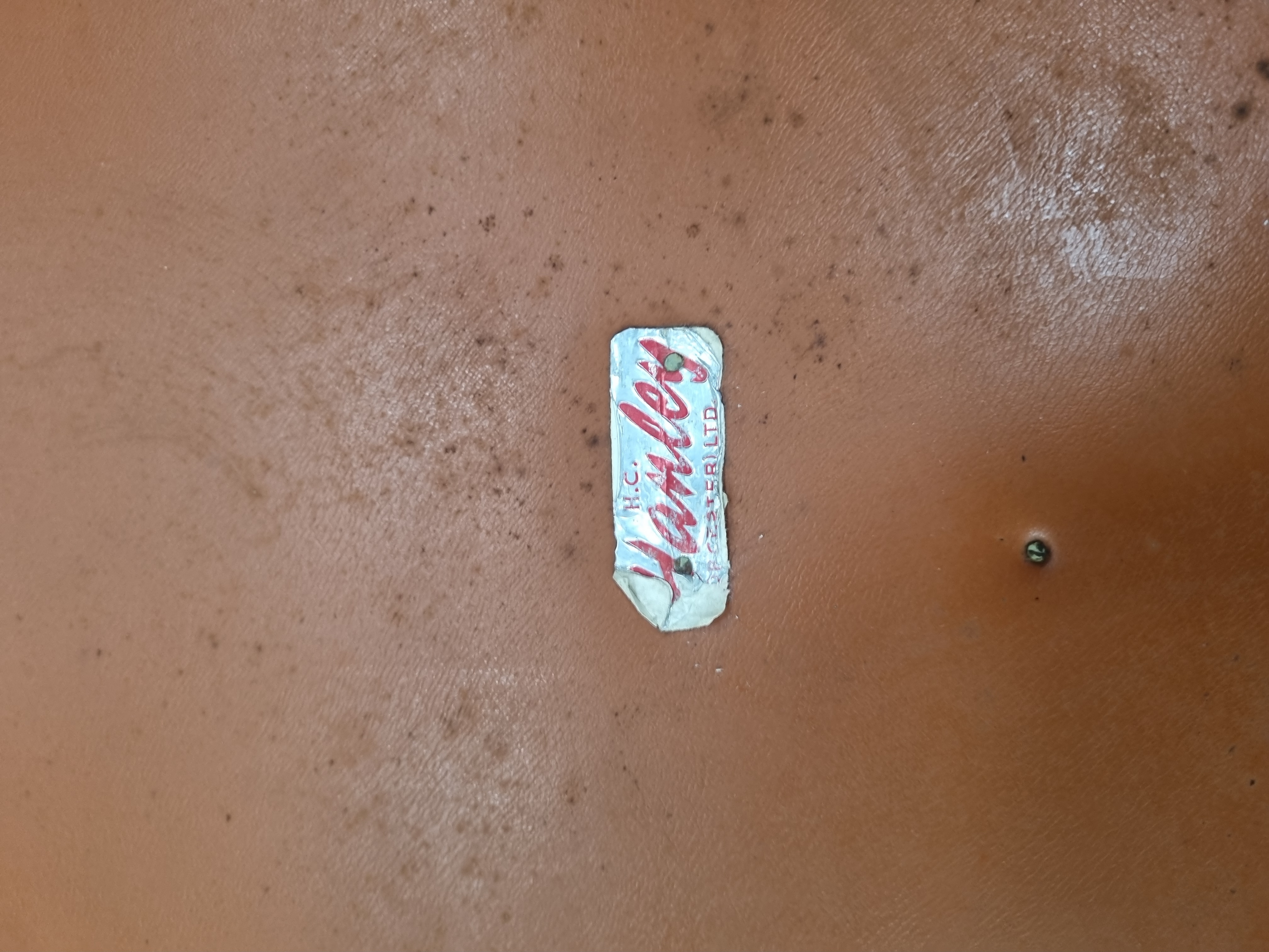 The leather shows signs of age-related wear, including scuffing and minor finish loss at the corners and along the piped edges. The underside lining exhibits mottled staining and spotting. The manufacturer\'s label is present with some lifting to the edges.
