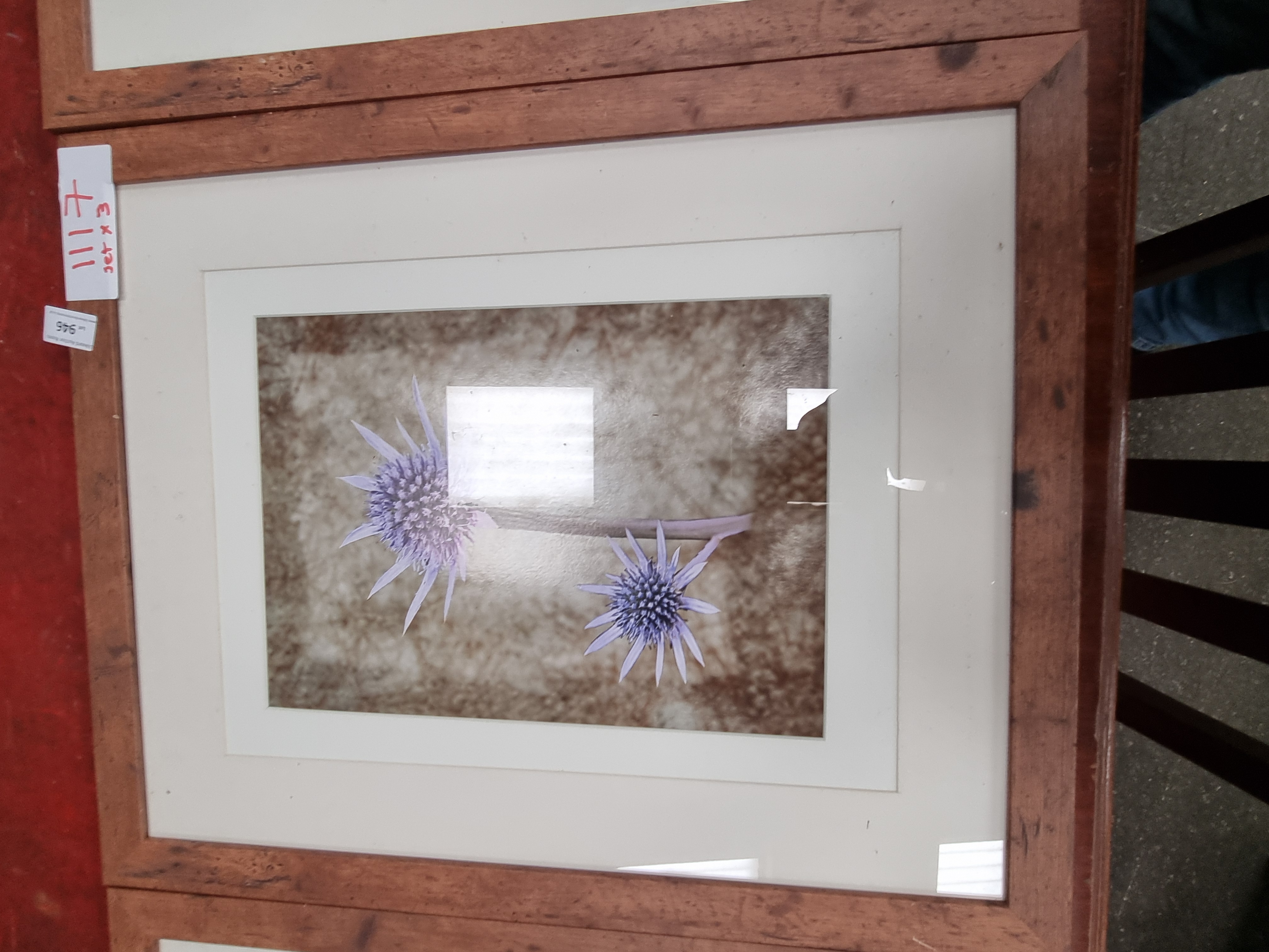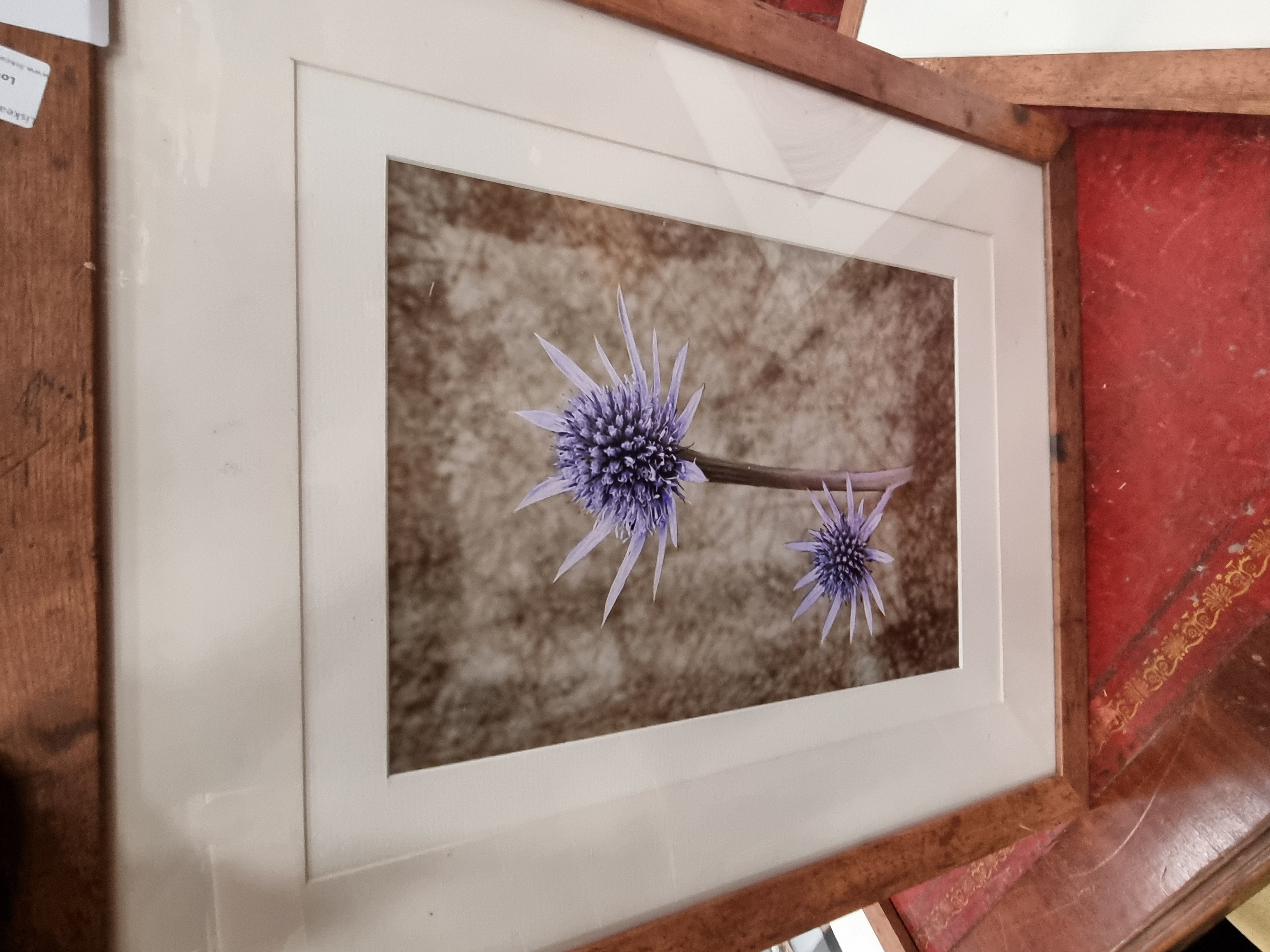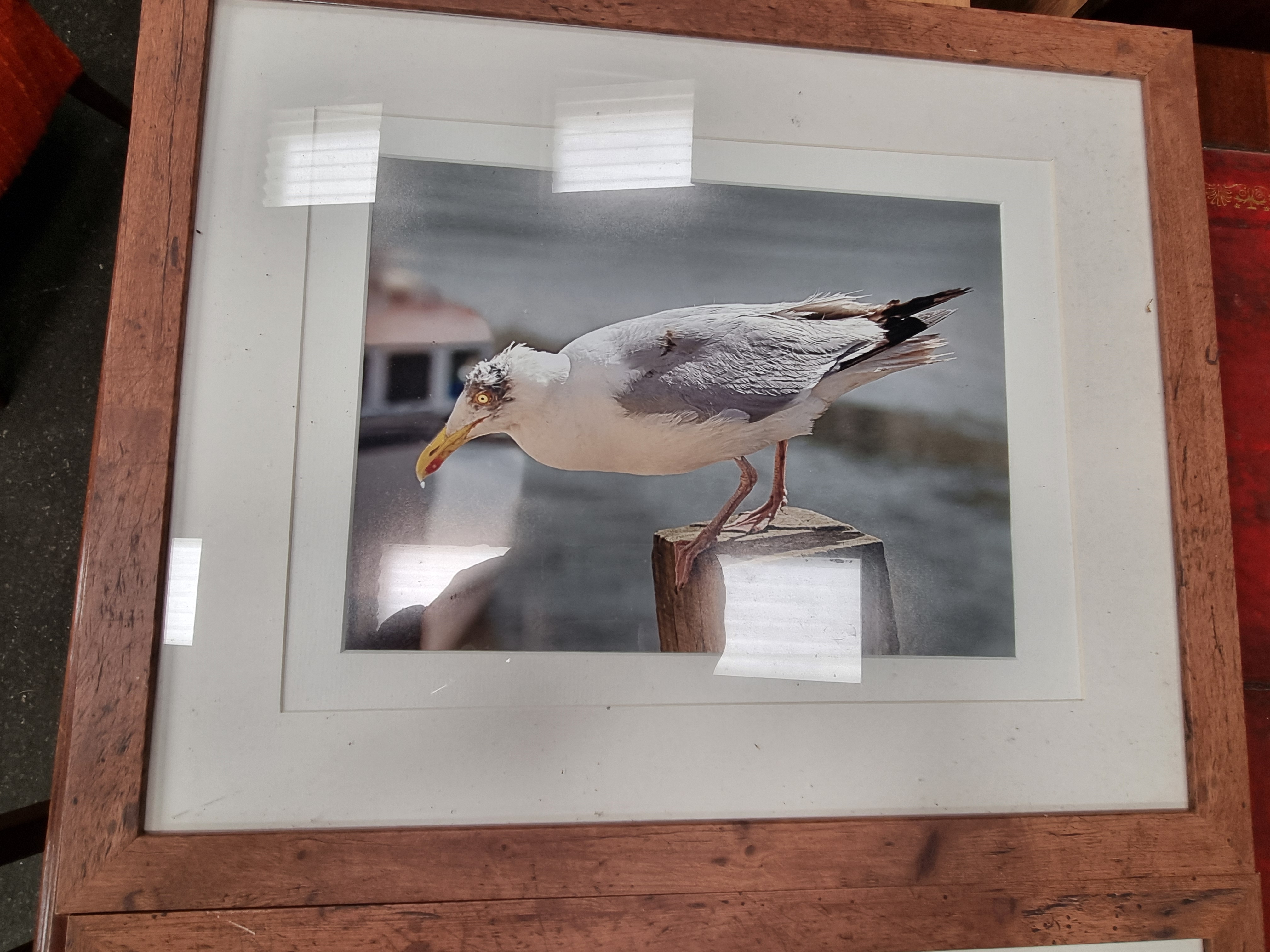 A trio of contemporary colour prints, likely digital pigment or giclée prints on paper. The collection includes a photographic study of a seagull perched on a wooden post against a coastal backdrop, a botanical study of two purple sea holly (Eryngium) flower heads on a textured neutral ground, and a stylised digital illustration of a purple rose with water droplets, overlaid with geometric frames and concentric circles. Each work is housed in a white card mount and a matching rustic-finish wooden frame under glazing. No signatures, edition numbers, or maker marks are visible on the prints or mounts.