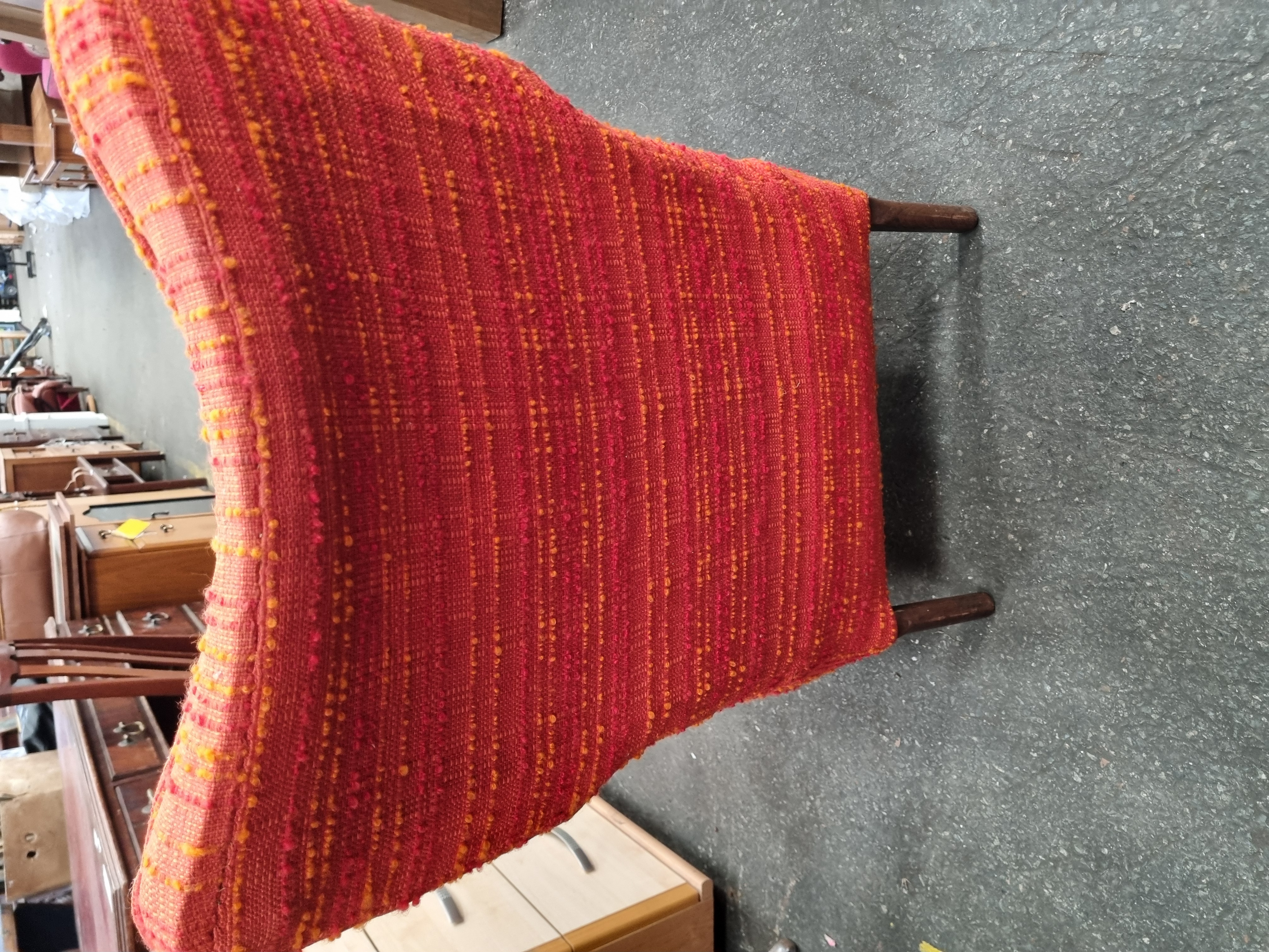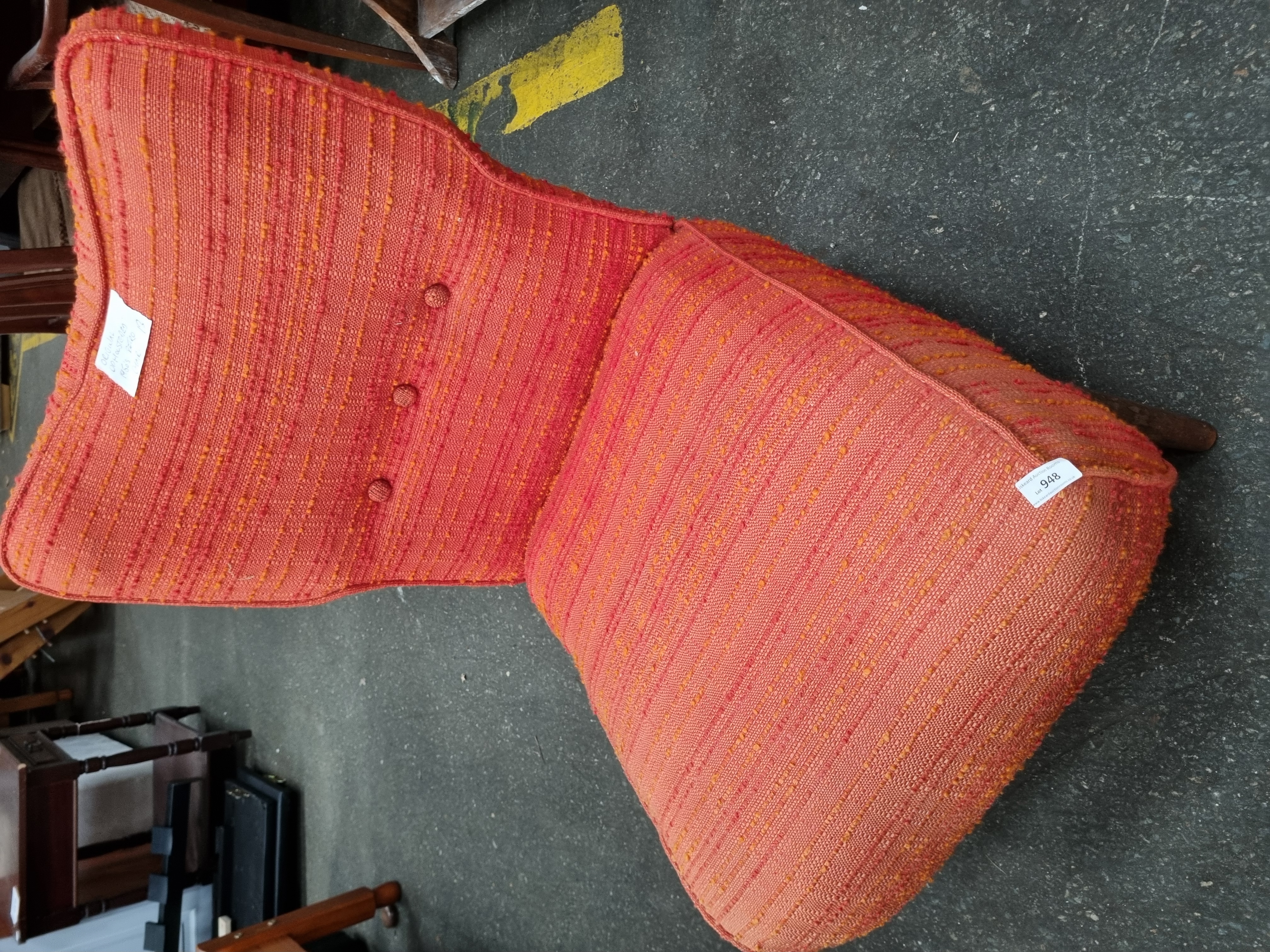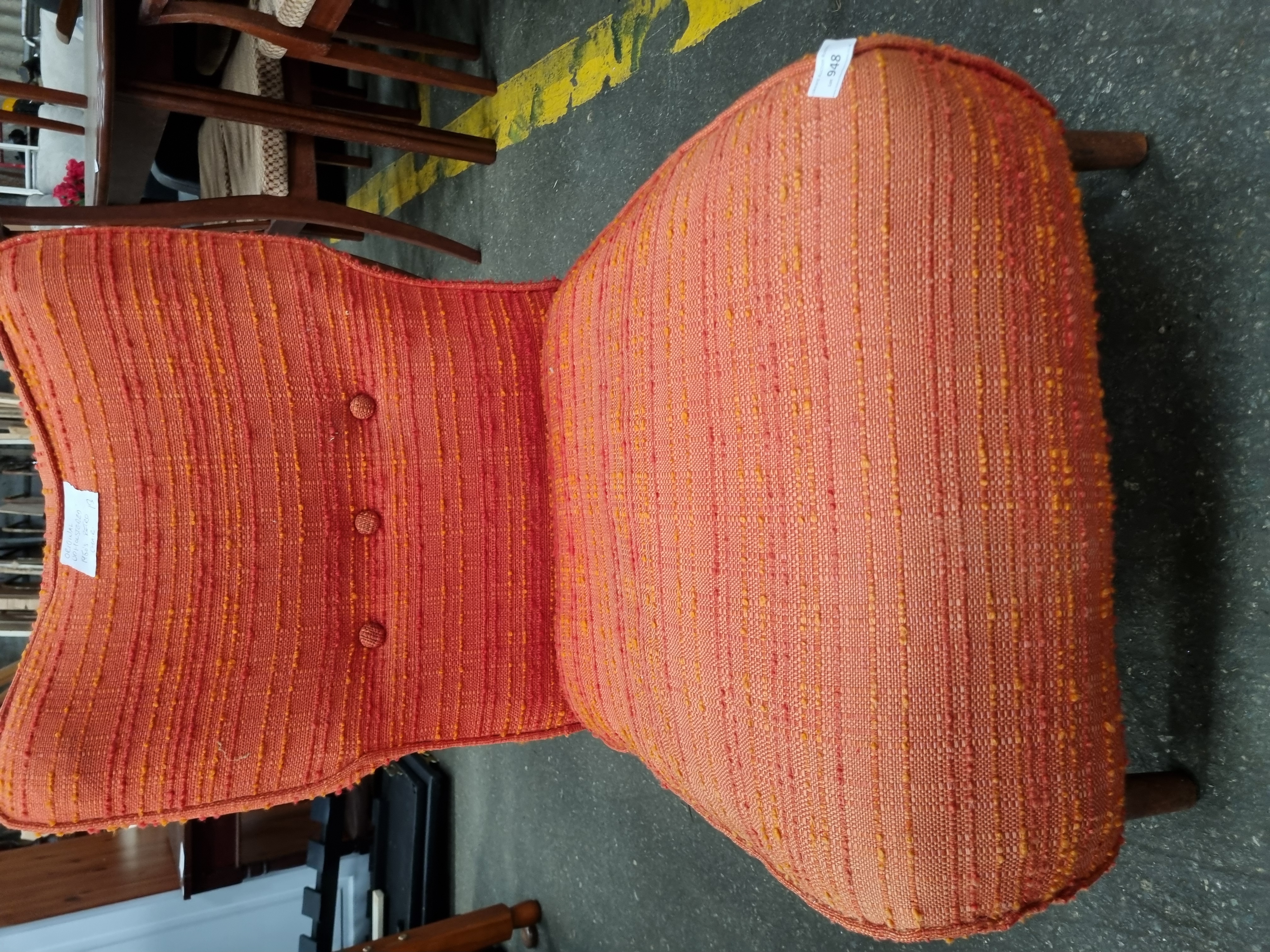 A mid-century modern side chair featuring a fully upholstered frame and backrest. The backrest is designed with a contoured, slight wing-back shape and is finished with three decorative buttons. The chair is raised on four tapered wooden legs with a dark finish, likely teak or stained beech. The upholstery is a heavily textured woven fabric in variegated shades of orange, red, and yellow. A handwritten label on the backrest identifies the piece as having original upholstery from the 1960s period, featuring the text ORIGINAL UPHOLSTERY 1960s PERIOD chair. An auction lot sticker for Gerrard Auction Rooms, Lot 948, is attached to the seat. No manufacturer marks or stamps are visible.