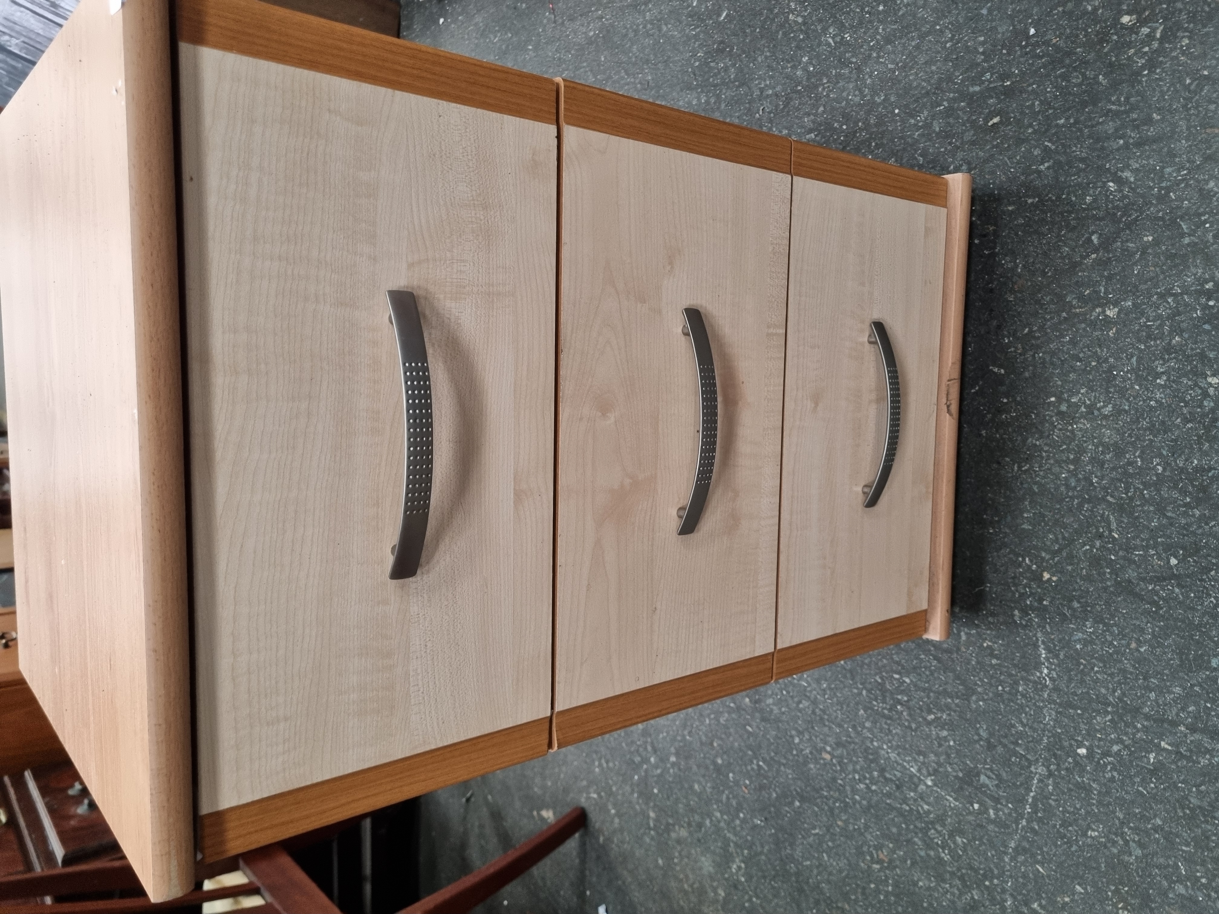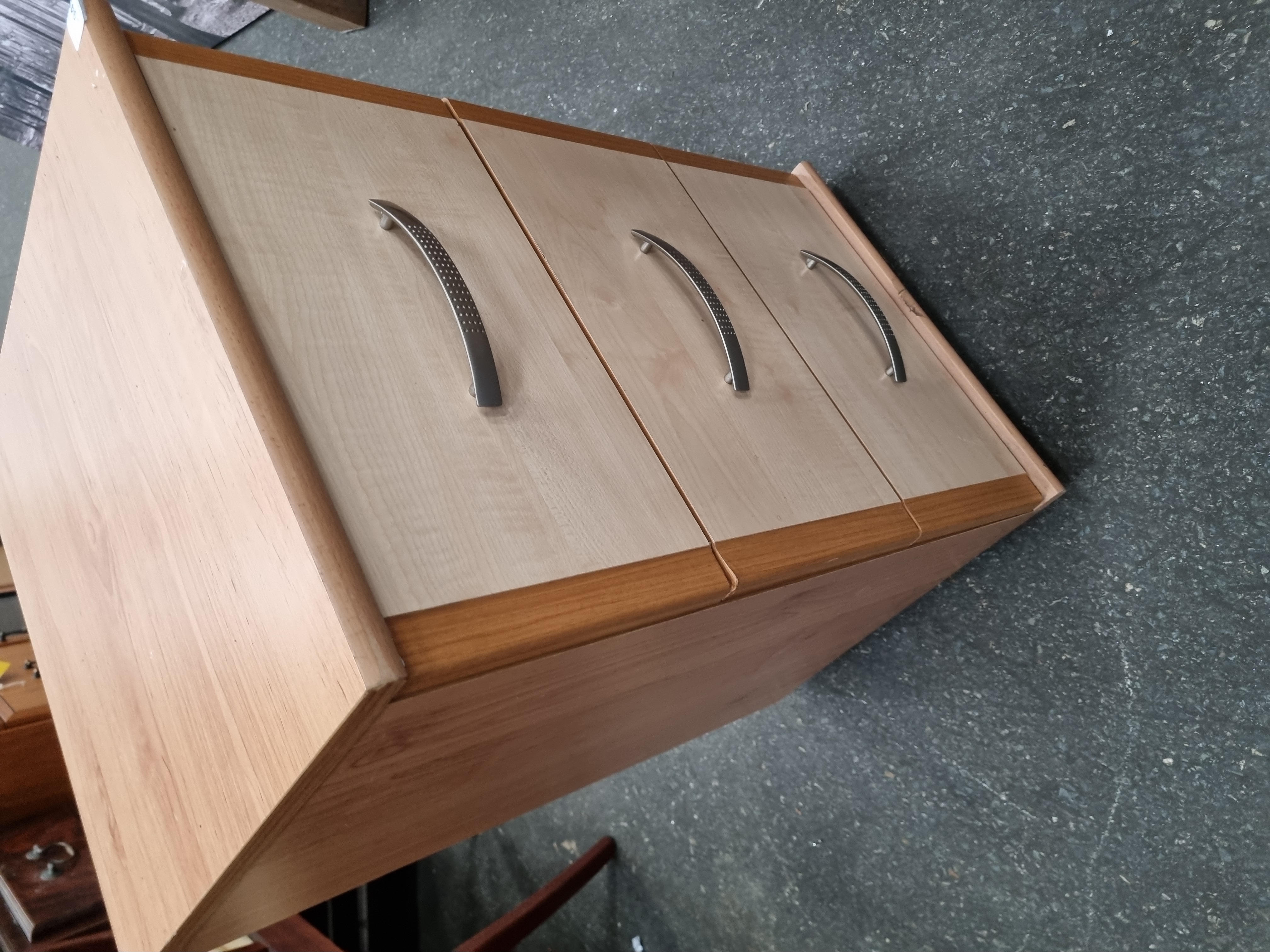 This contemporary small chest of drawers is constructed from composite board finished with wood-effect laminates. The primary exterior finish is a medium-brown wood grain, while the three drawer fronts feature inset panels in a lighter, cream-toned birch-effect laminate. The drawers are of modern machine-made construction, likely joined with dowels or internal fixings, and the interiors are finished in a light wood-effect laminate. Each drawer is fitted with a curved, silver-toned metal pull handle featuring a decorative line of small circular perforations along its length. A small white rectangular sticker with the characters 949 is located on the top left front edge. No manufacturer marks, stamps, or labels are present. The items pictured inside the drawer are not part of this lot.