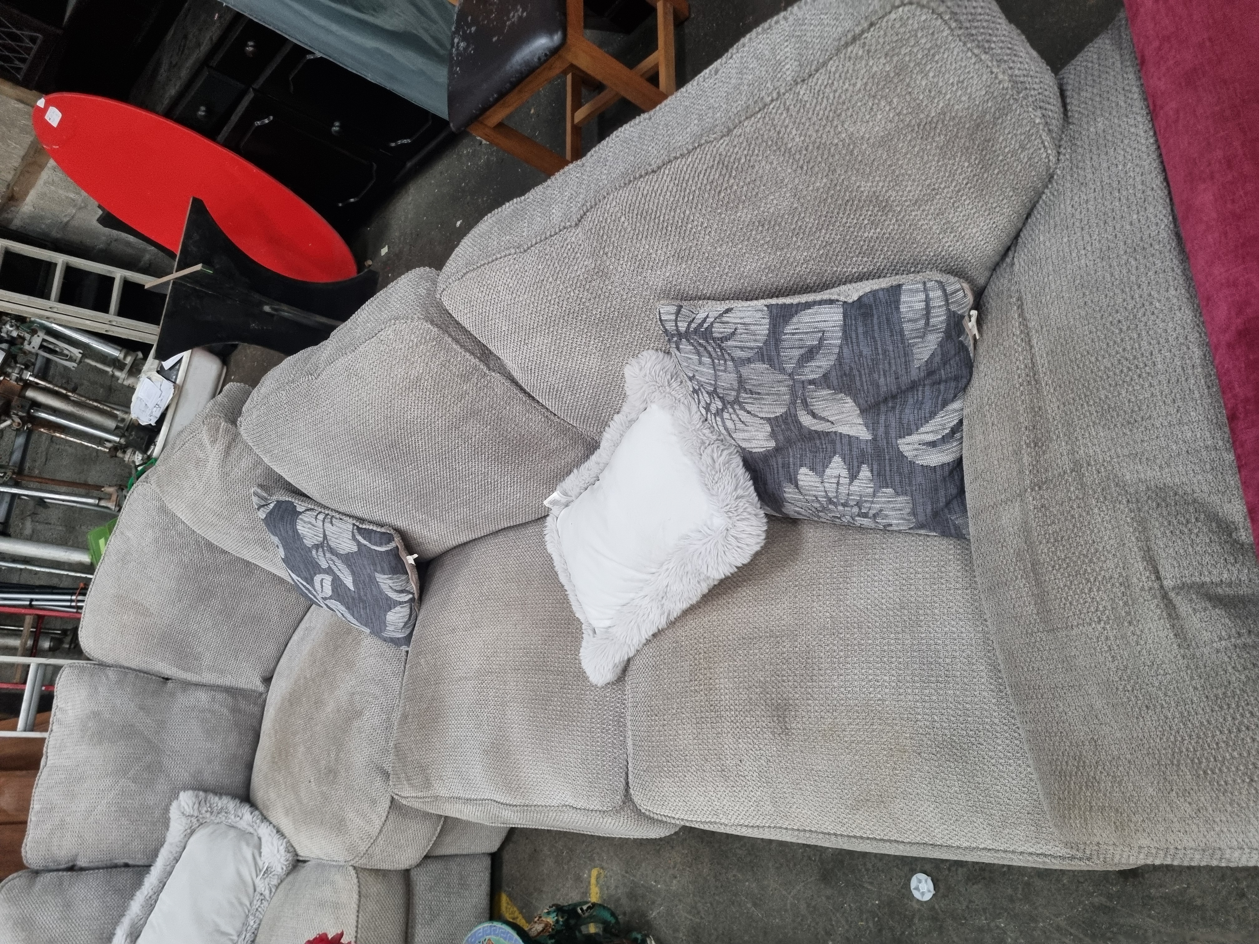 Attributed to Ashley Furniture, a large-scale modular corner sofa and matching square ottoman. The suite is upholstered in a light taupe textured woven fabric with a chenille-like finish. The sofa is constructed from multiple modular sections, including a curved corner unit, and features deep box-border seat cushions with high, contoured back cushions. The lot is accompanied by five scatter cushions: three featuring a grey and white floral motif and two in a white faux-fur finish. While no manufacturer label is present on the sofa frame, the design and upholstery are consistent with the Decelle series by Ashley Furniture. A small fabric tag on the faux-fur cushion is marked HERITAGE, and a white rectangular sticker on the ottoman bears the number 953.