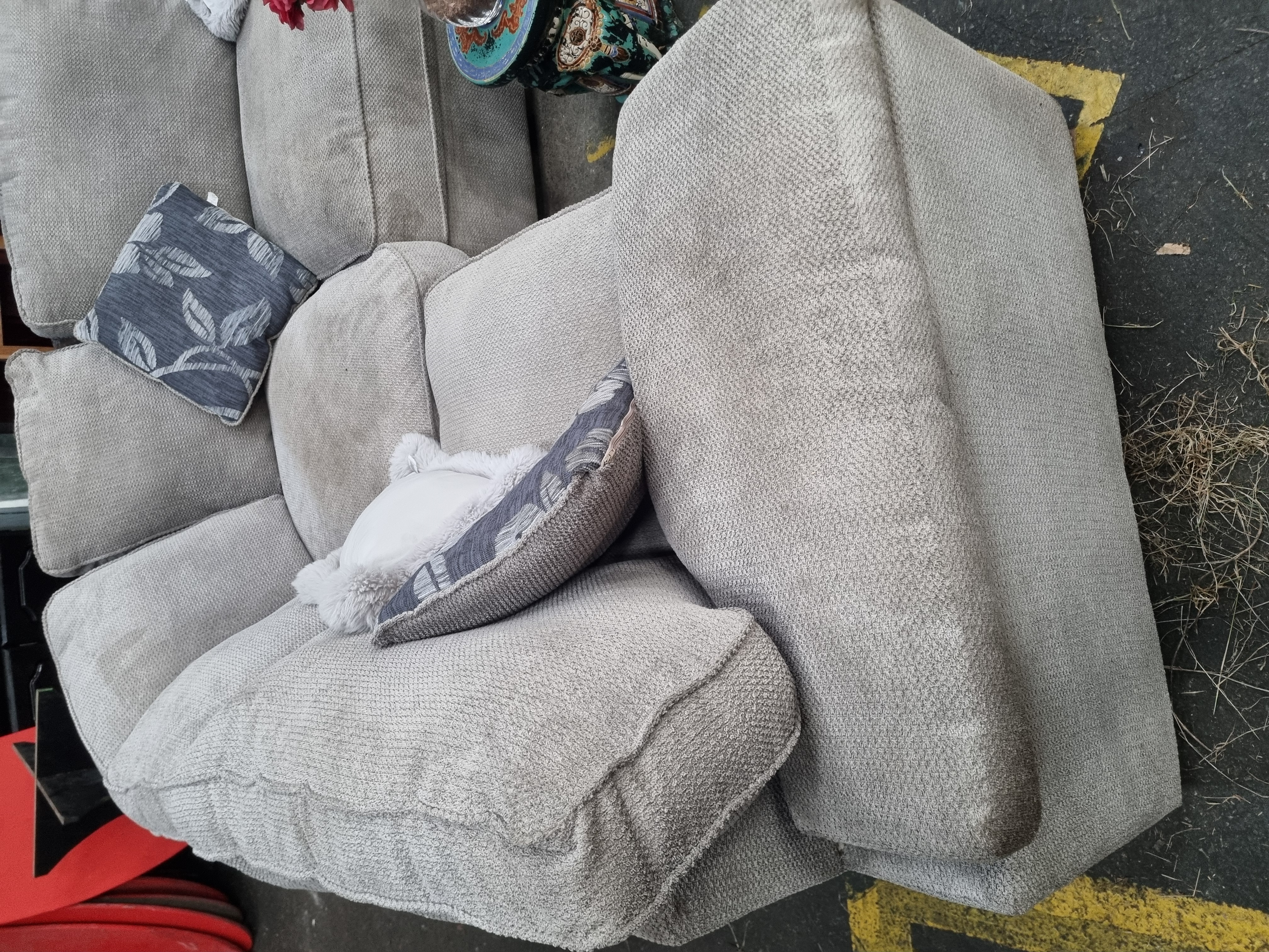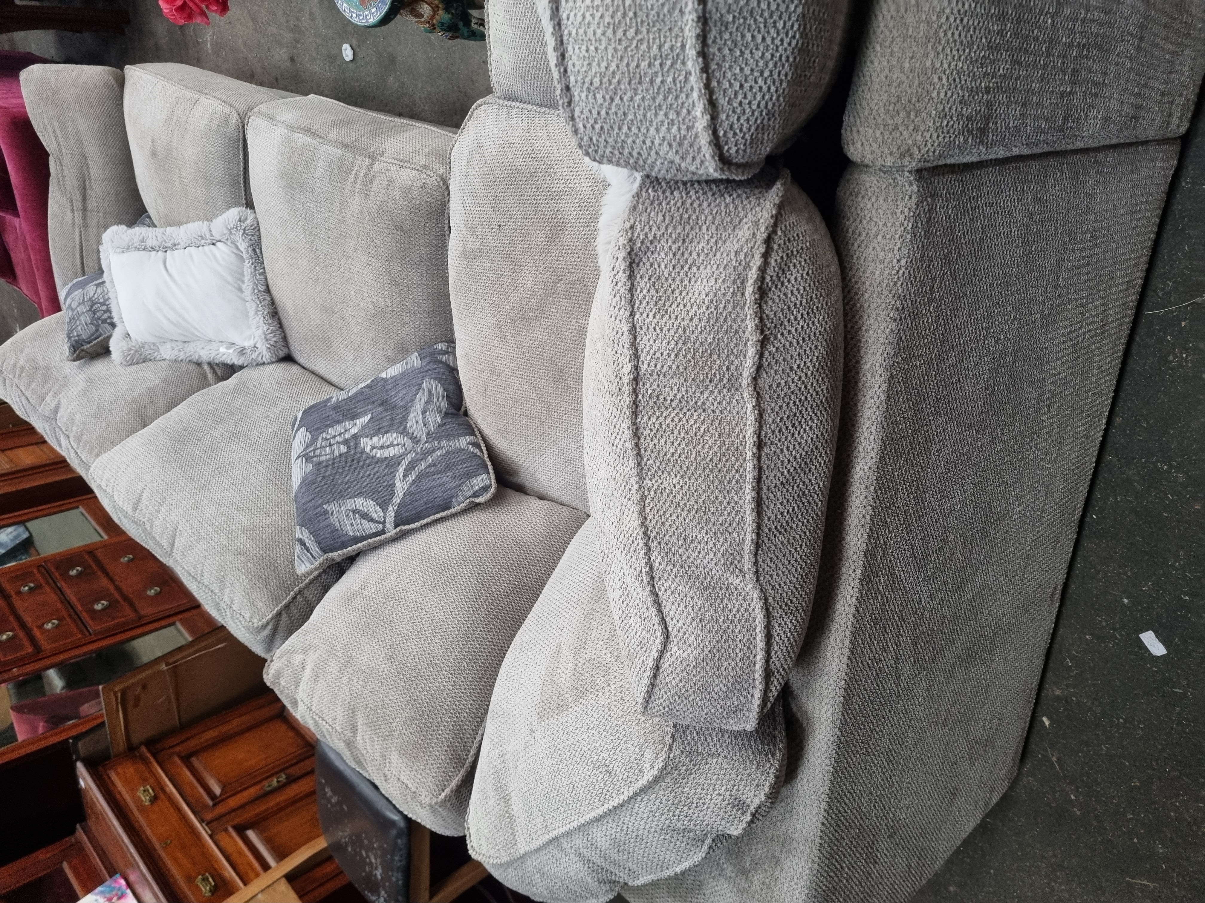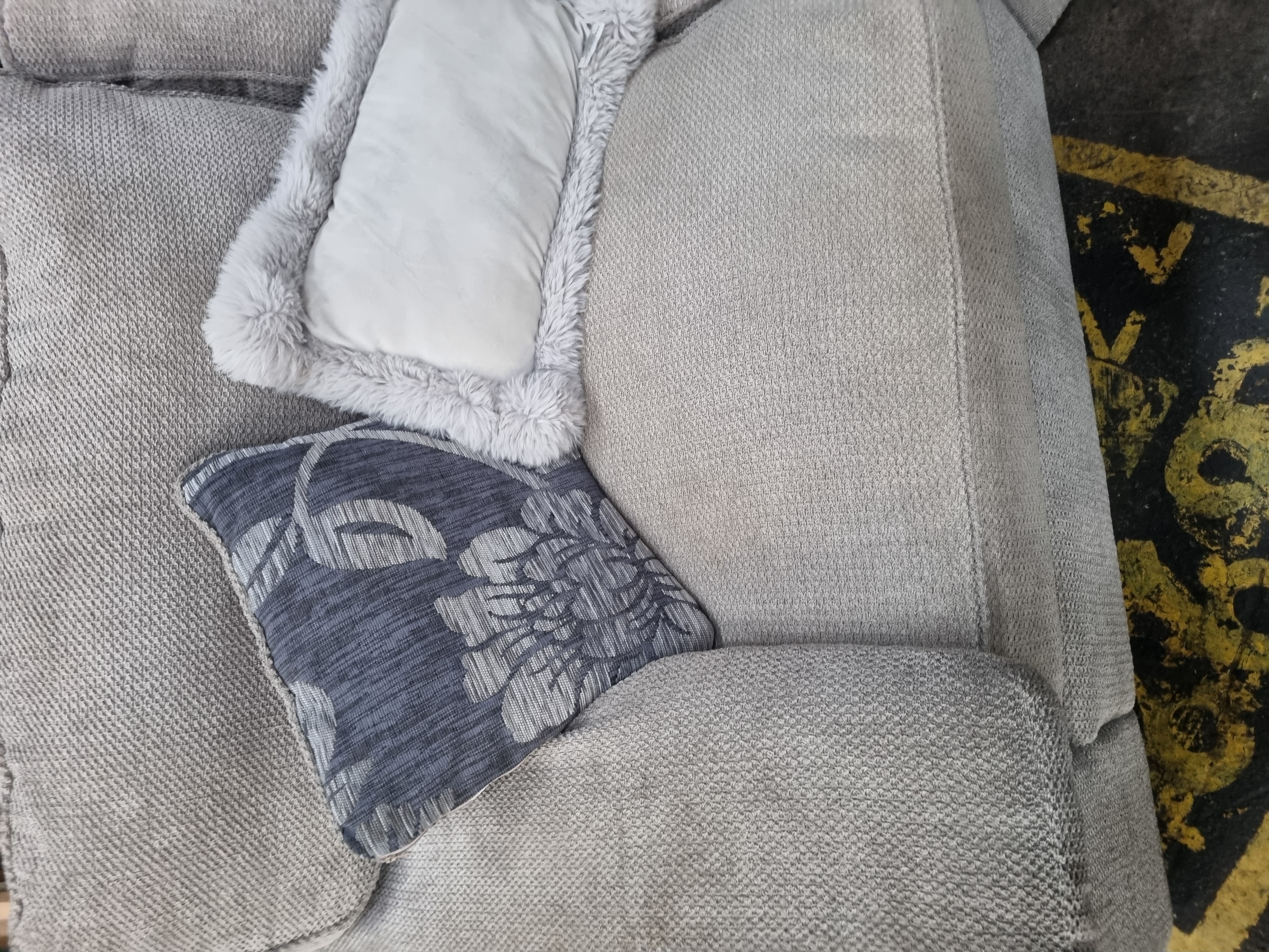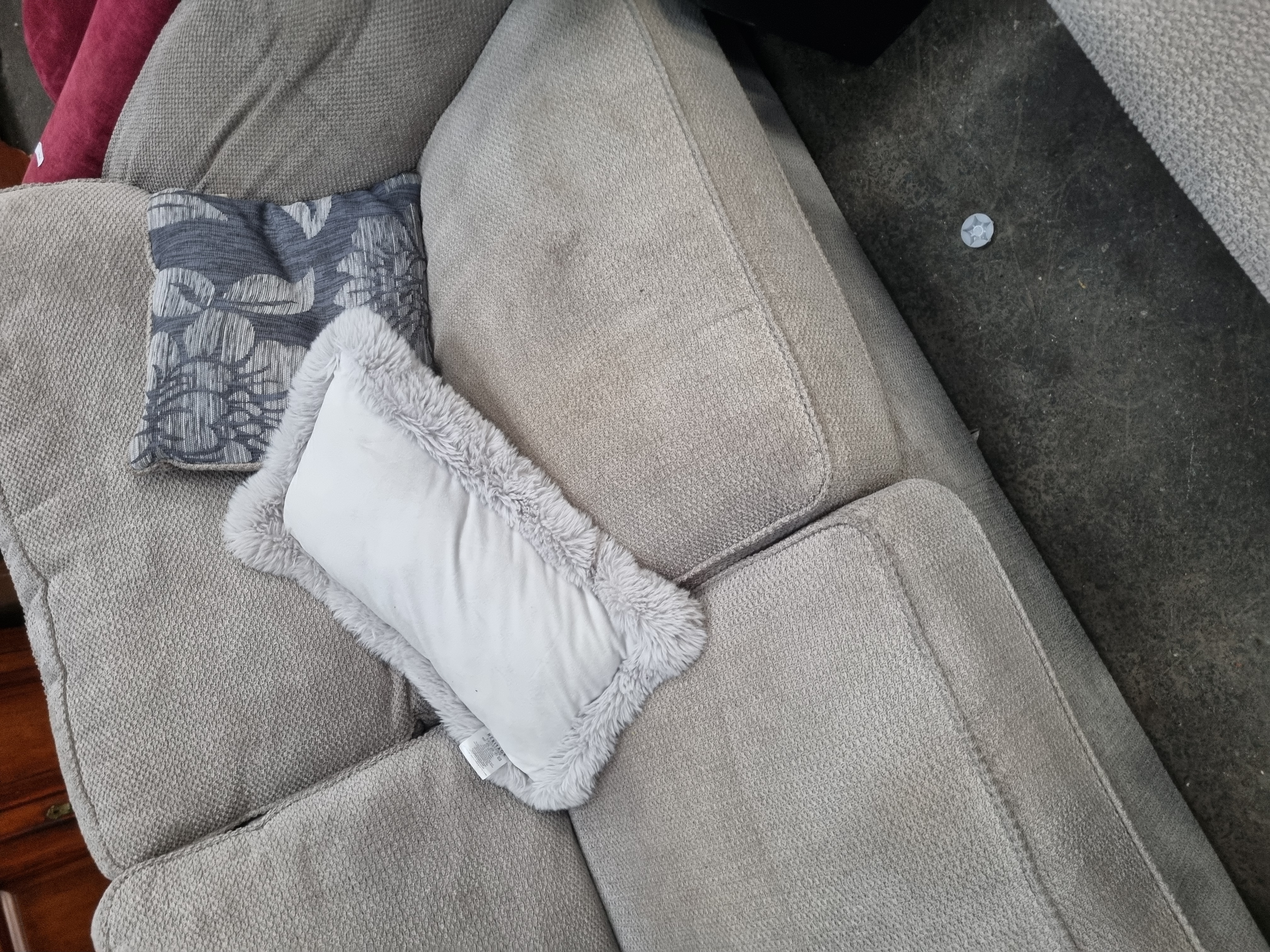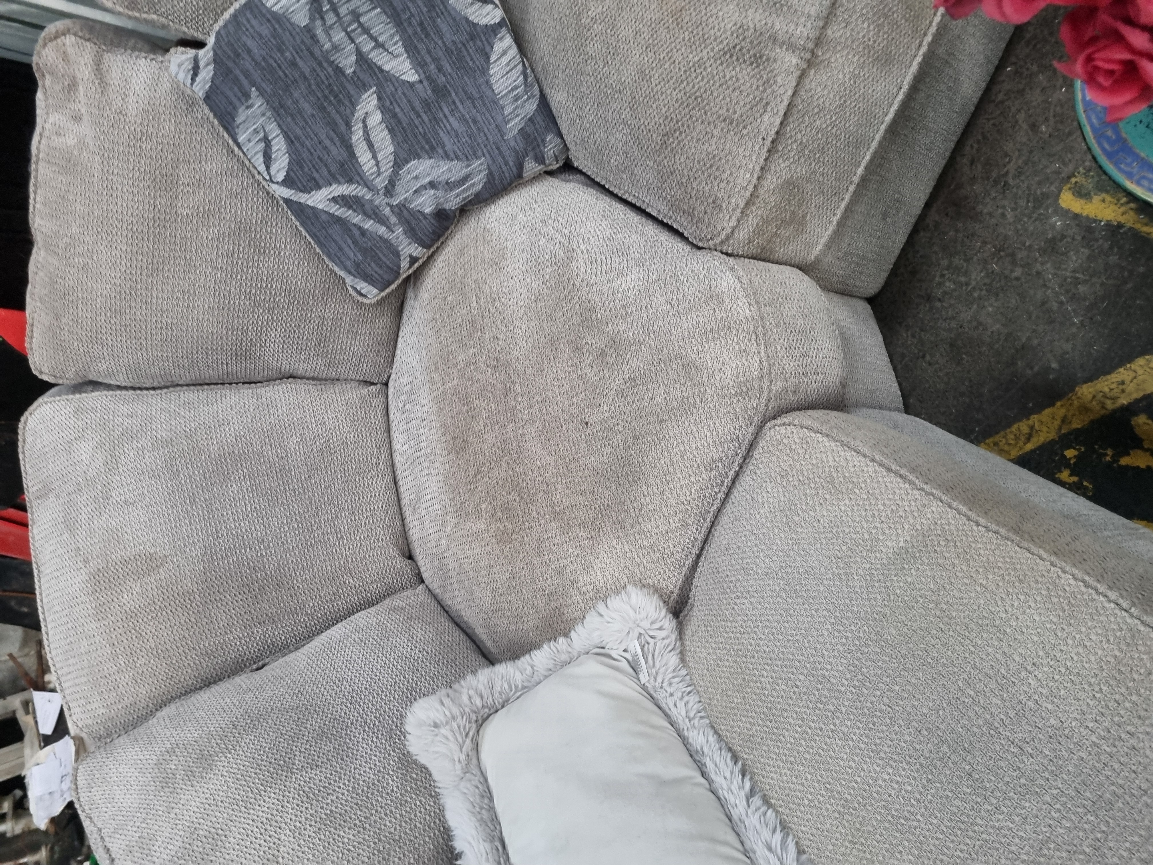The item is in used condition. There is significant visible staining and soiling present on the seat cushions and the leading edges of the armrests. General pilling and surface wear to the fabric are evident throughout, consistent with domestic use. Professional cleaning is recommended.