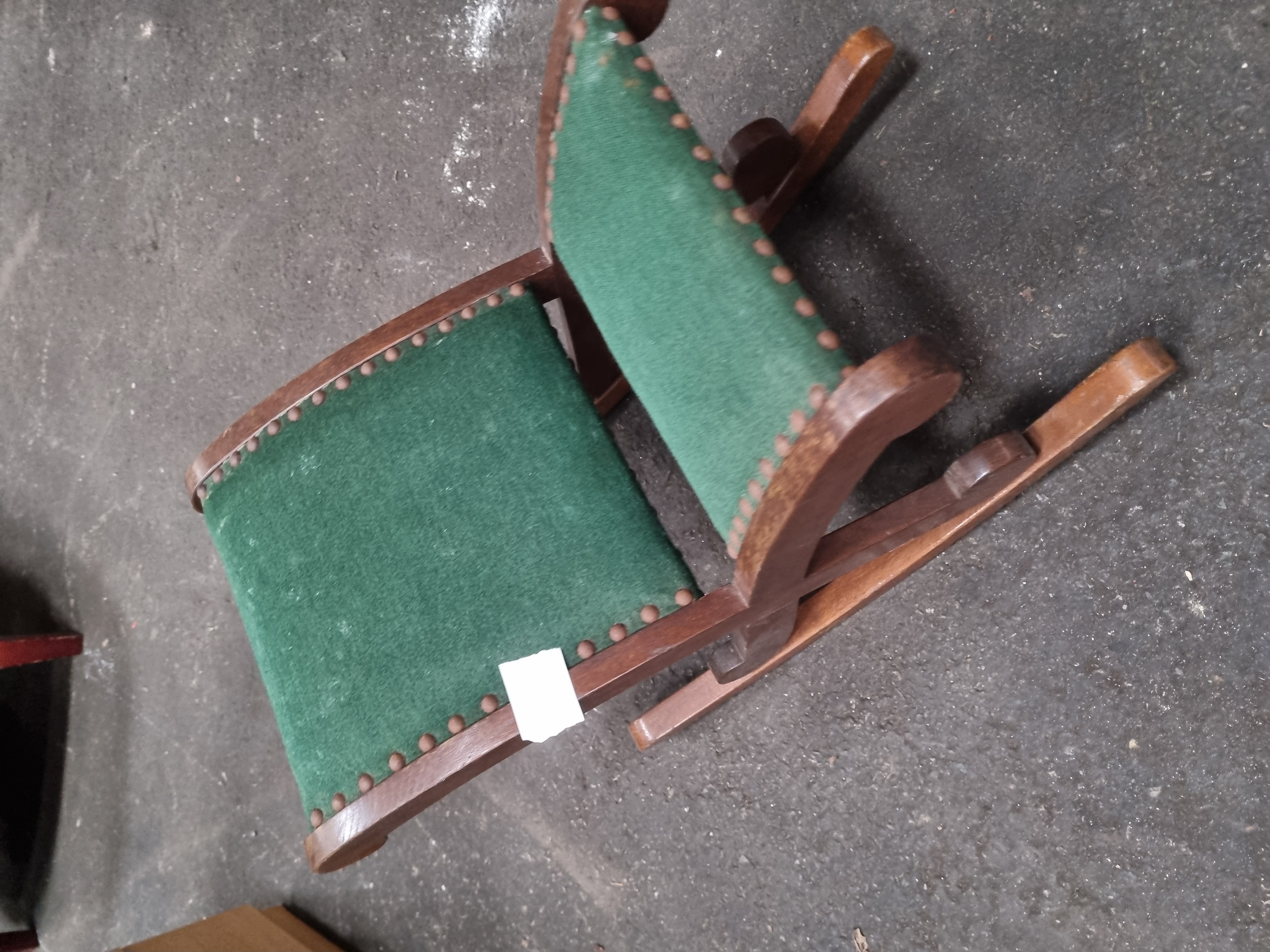 The chair is in good overall condition. The wooden frame shows visible surface wear, including scuffs and scratches consistent with age and use, notably along the rockers and frame edges. The upholstery is intact and remains well-secured, with some minor pile wear and surface dust present.