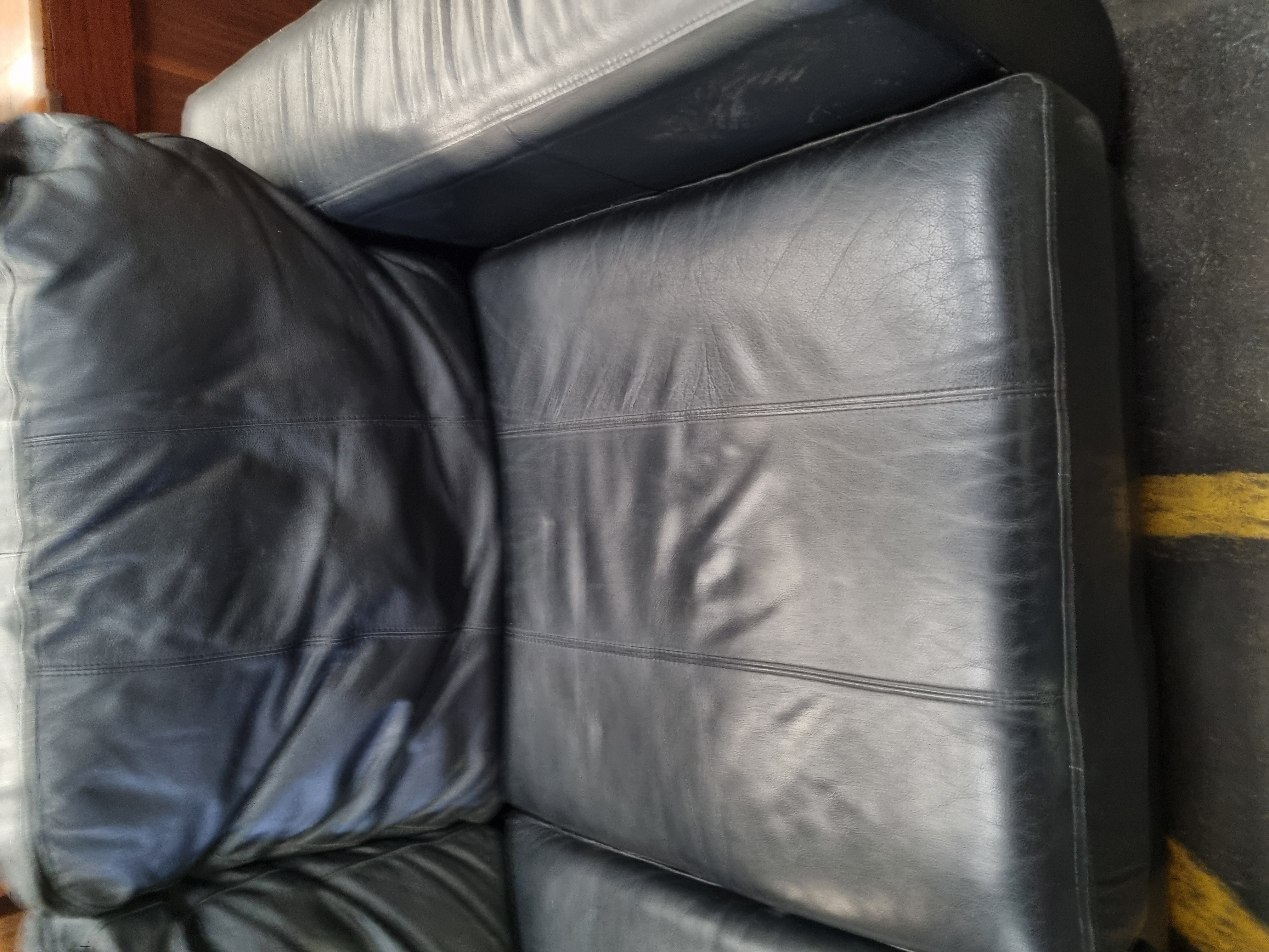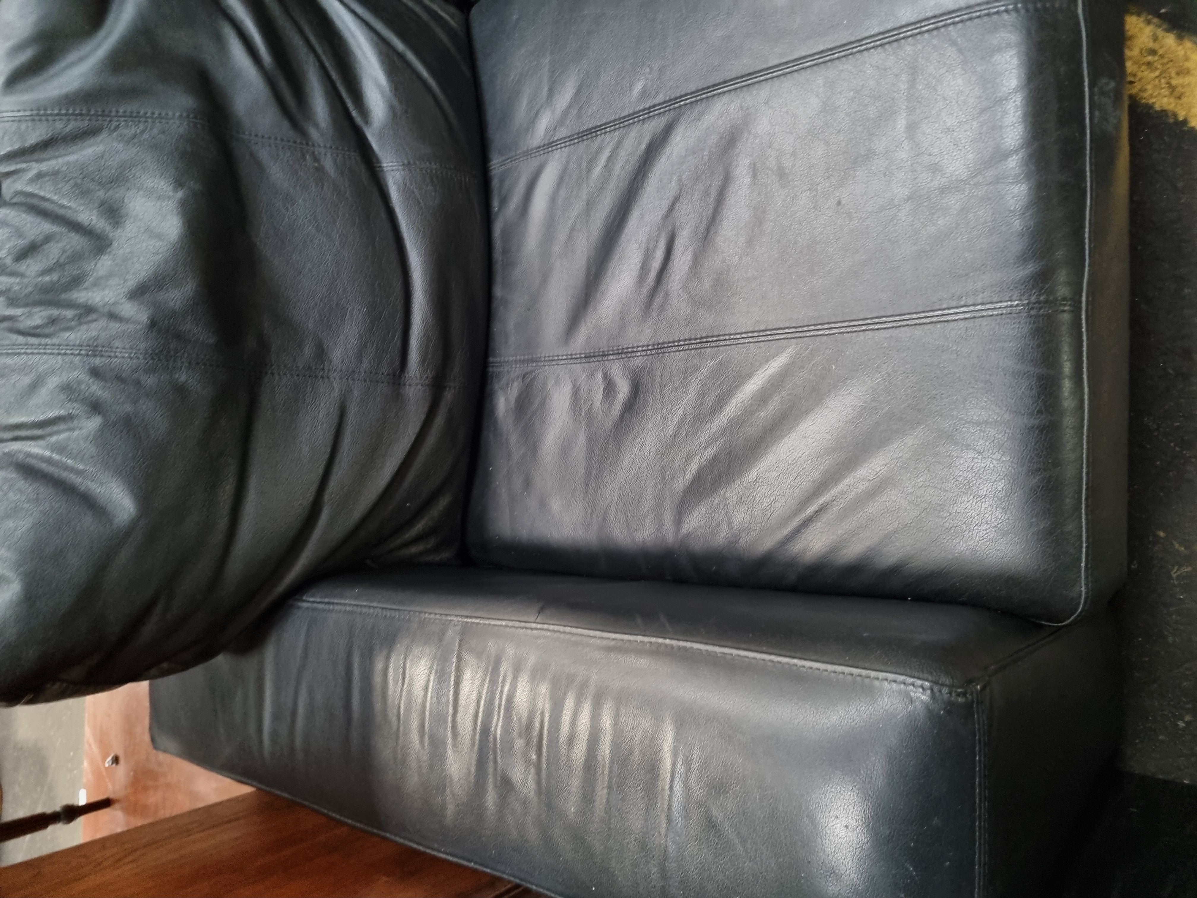The sofa is in used condition. The leather shows characteristic creasing and softening throughout, particularly on the seat and back cushions. There is visible surface wear and minor scuffing consistent with age and use, most notably on the top surfaces of the armrests. The back cushions appear somewhat compressed from use.