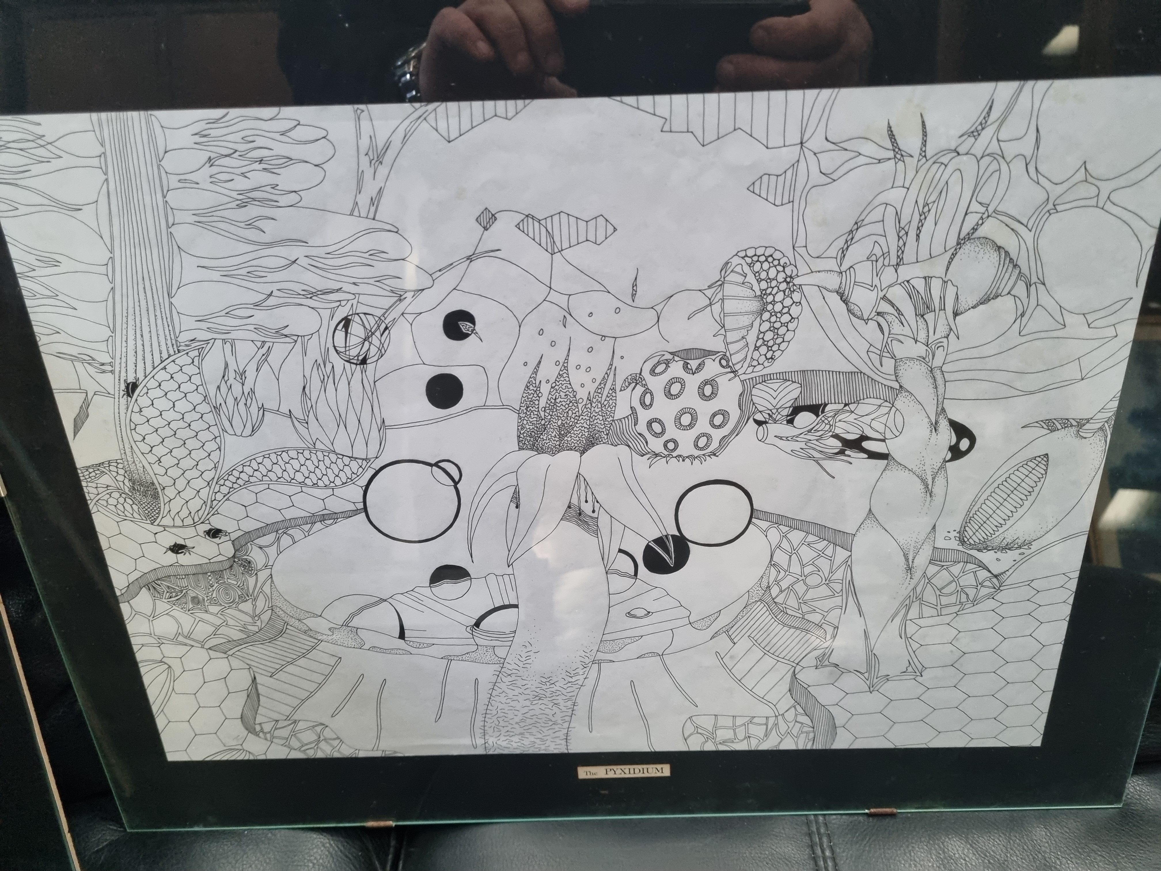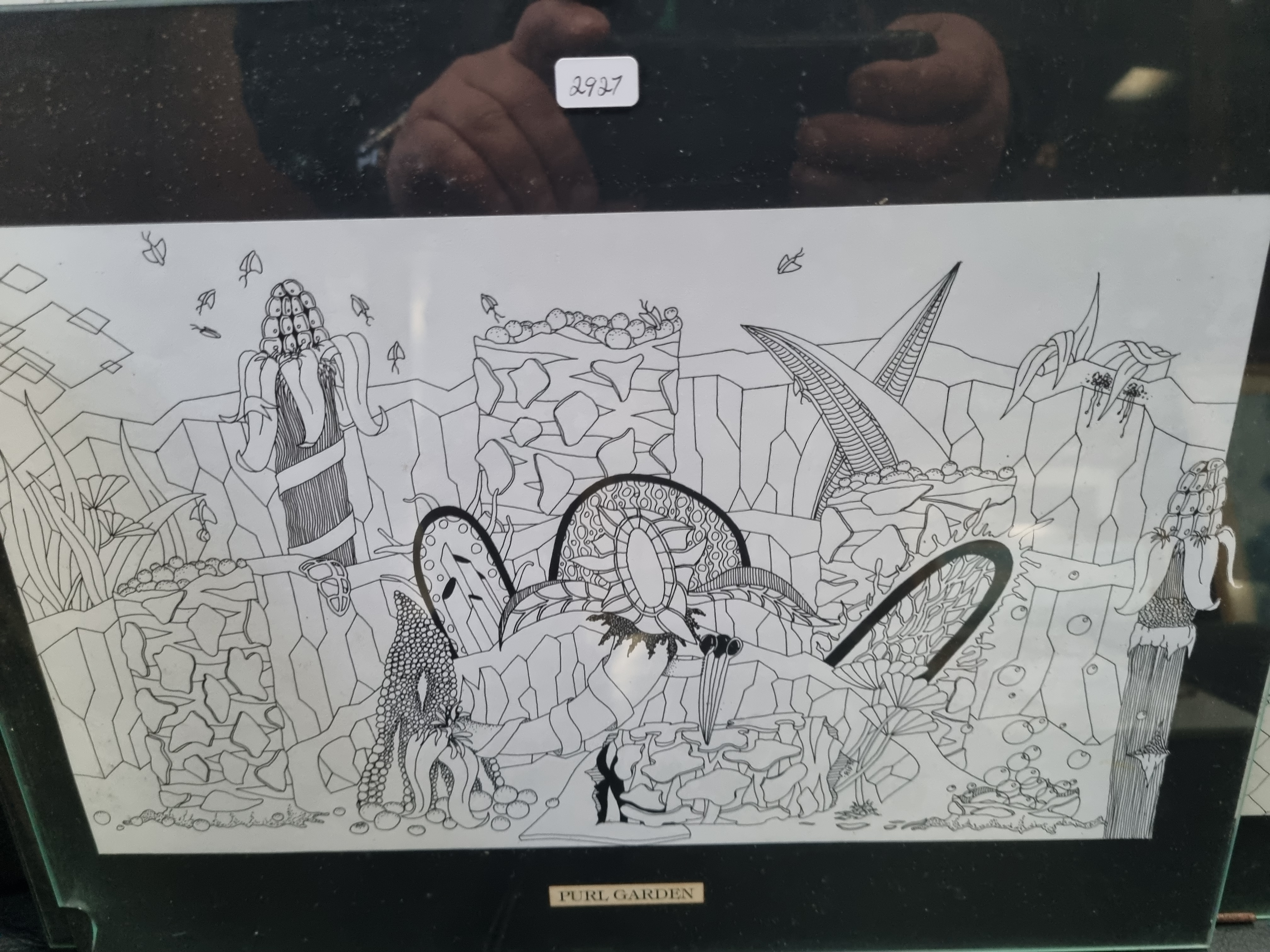 A collection of five contemporary works on paper, comprising four intricate pen and ink drawings and one abstract composition. The drawings are executed on white wove paper in a highly detailed surrealist or psychedelic style, depicting fantastical biomorphic landscapes, strange flora and fauna, and mechanical elements. Three of the works bear printed titles on labels attached to the mounts: The QUEEN OF MACROCOSM, The PYXIDIUM, and PURL GARDEN. One drawing is inscribed with the monogram RIF in ink to the lower right of the composition. The fifth item is an abstract work in mottled brown and black tones, possibly an ink wash or print. All pieces are presented in modern black-bordered clip frames.