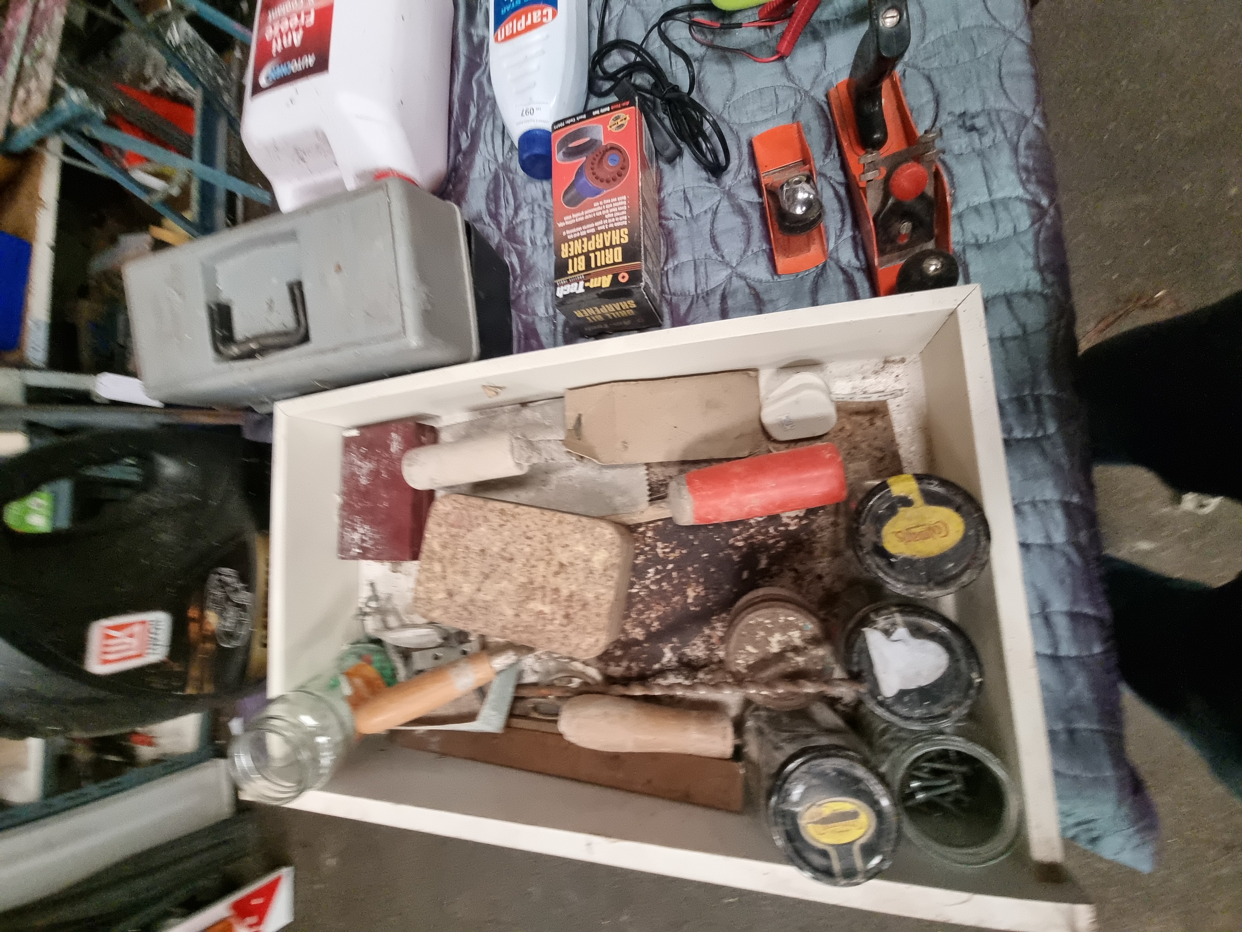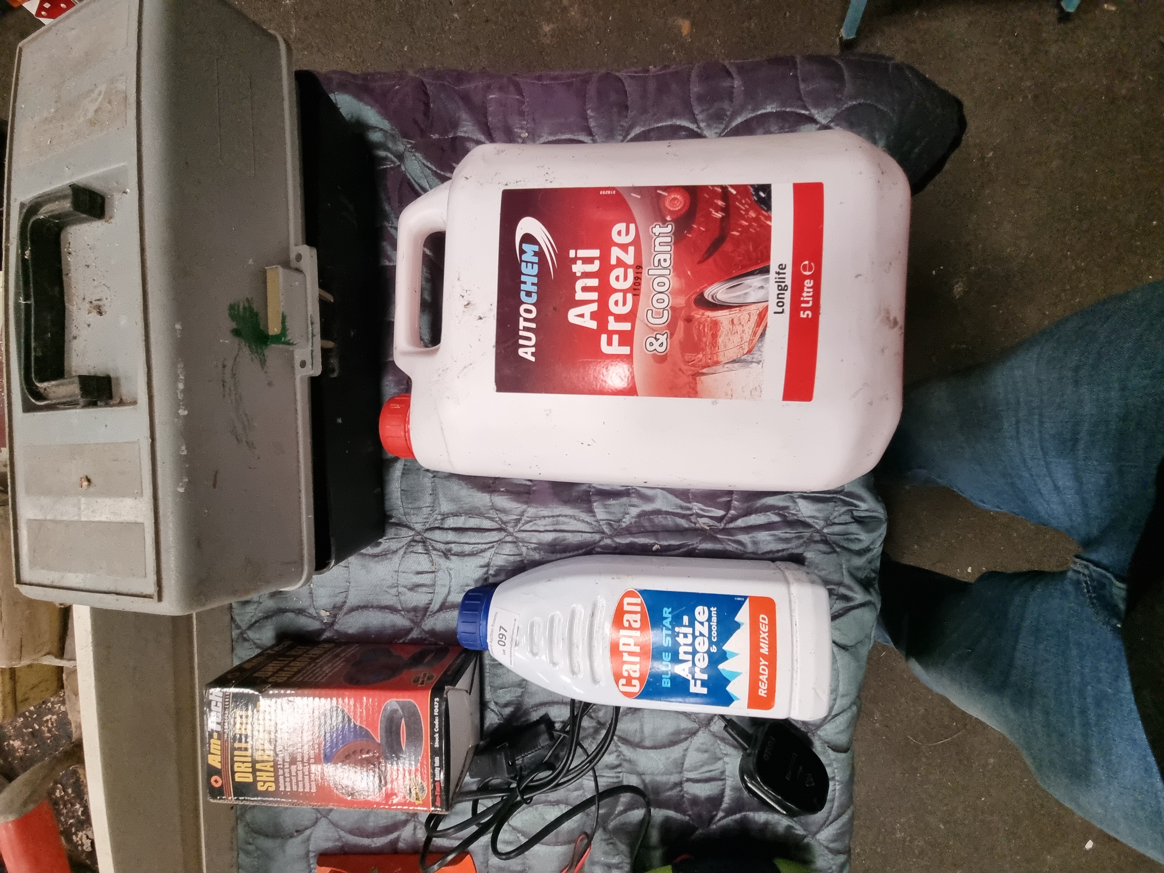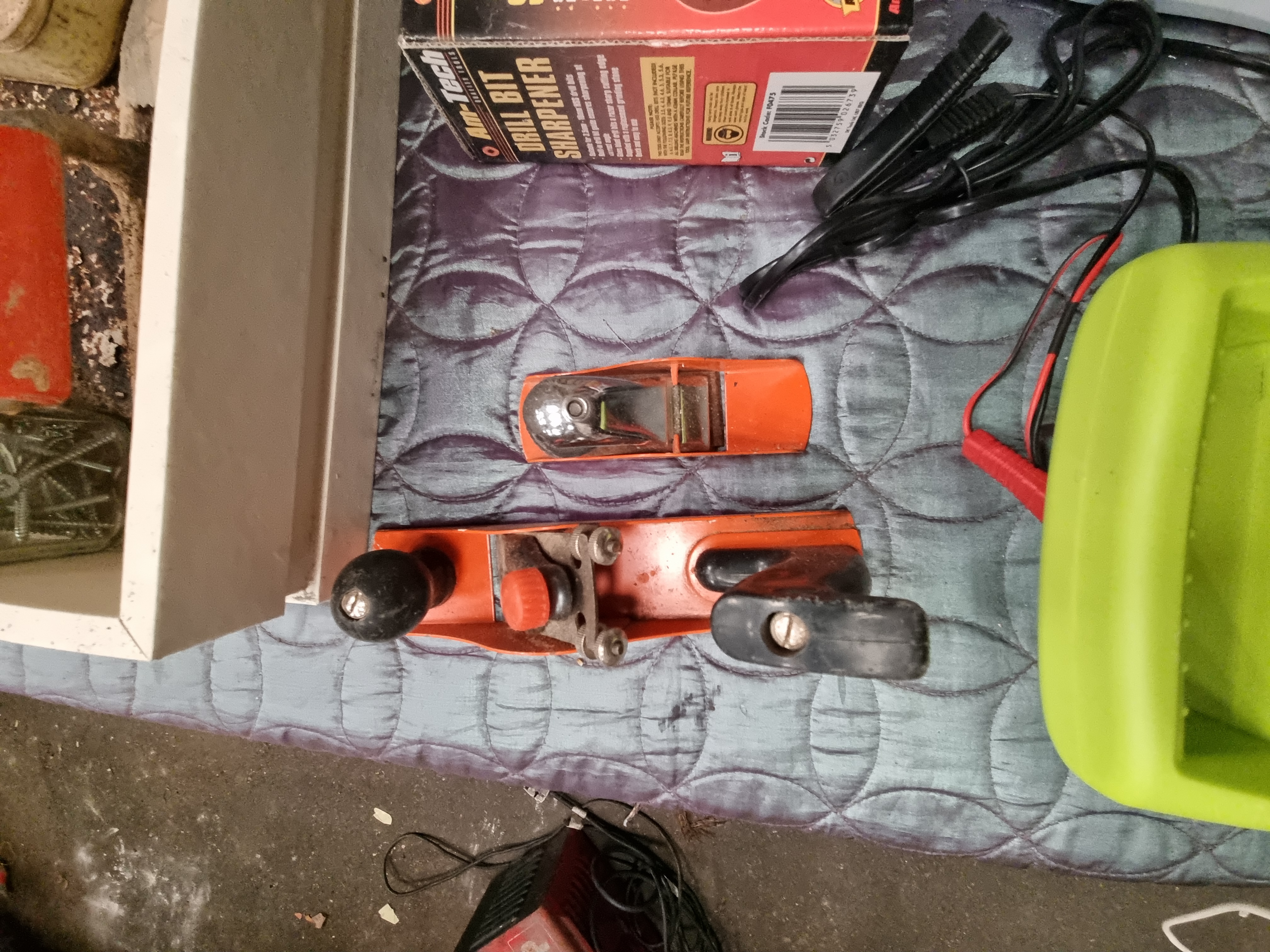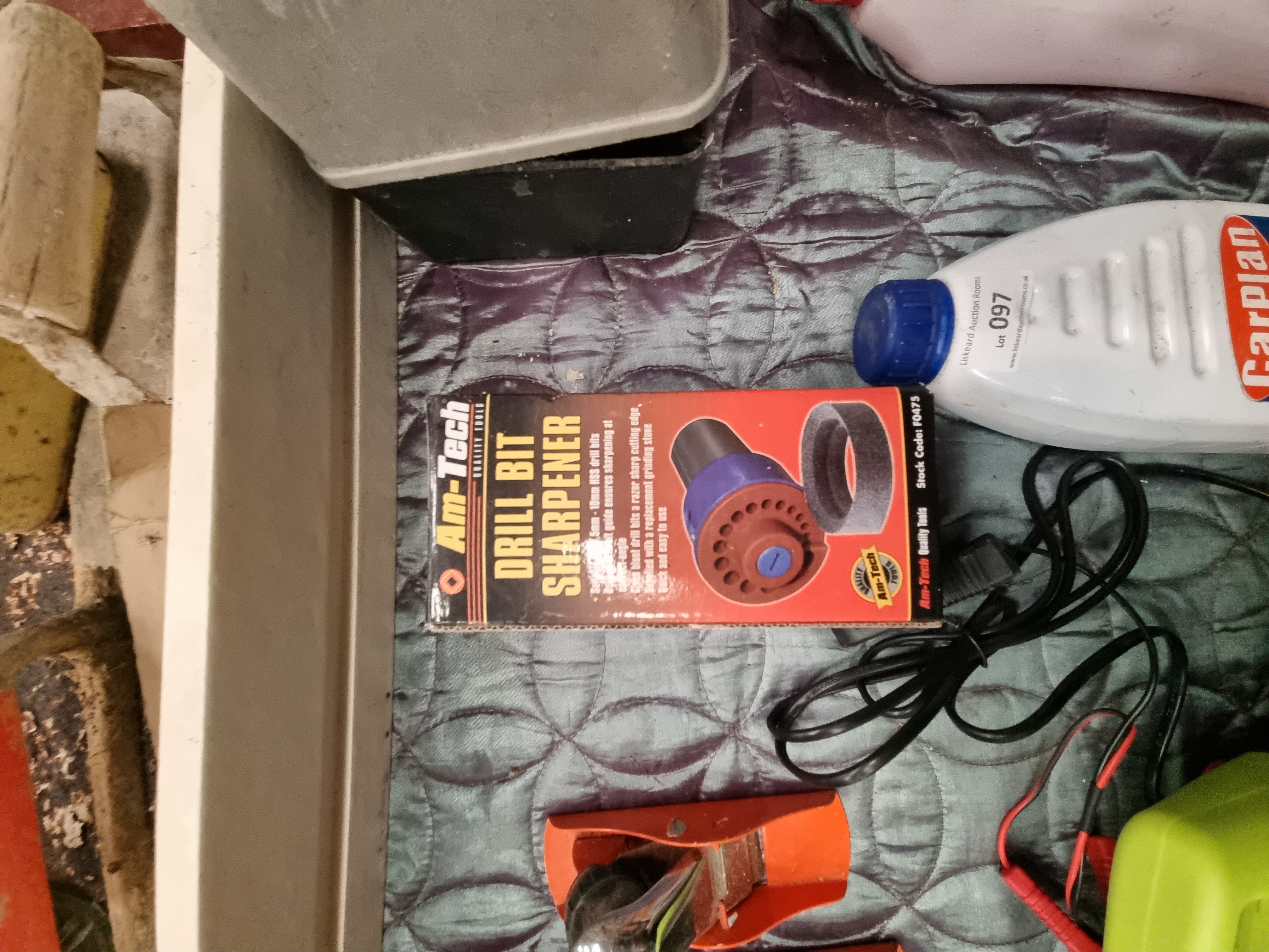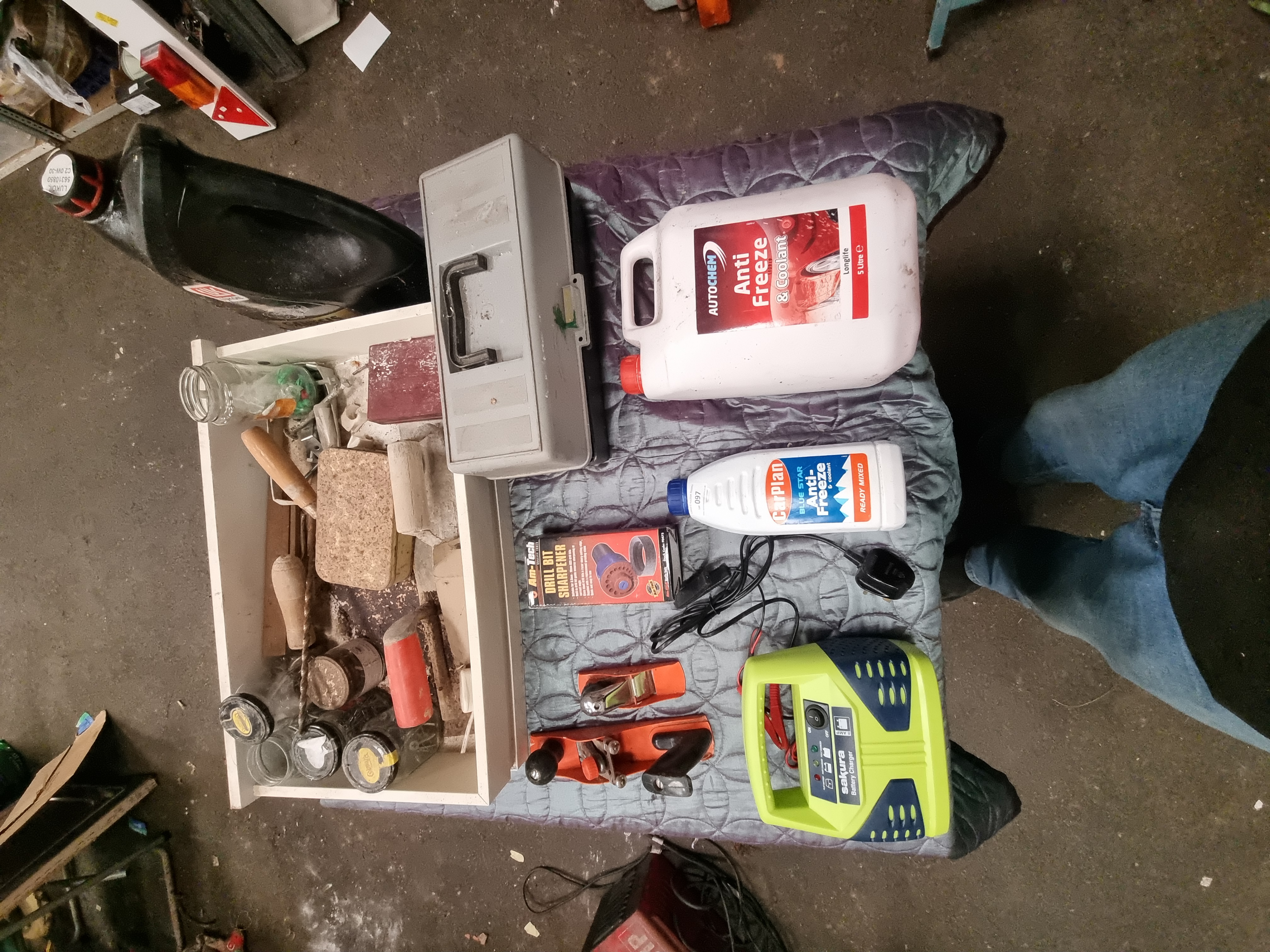 This lot comprises a collection of automotive maintenance products, electrical equipment, and various hand tools. Included in the assortment is a Sakura battery charger finished in lime green and navy blue plastic, fitted with a standard UK 3-pin plug and charging clamps. An Am-Tech drill bit sharpener is present, contained within its original retail cardboard box. The collection also features automotive fluids, including a 5-litre container of Autochem Anti Freeze & Coolant and a smaller bottle of CarPlan Blue Star Anti Freeze & Coolant. Two hand planes with orange-painted metal bodies and black handles are included. A grey plastic toolbox and a white wooden drawer contain further miscellaneous items such as glass jars, sanding blocks, and various hand tools with wooden handles. A black plastic container with a Lukoil branded cap is also part of the lot.