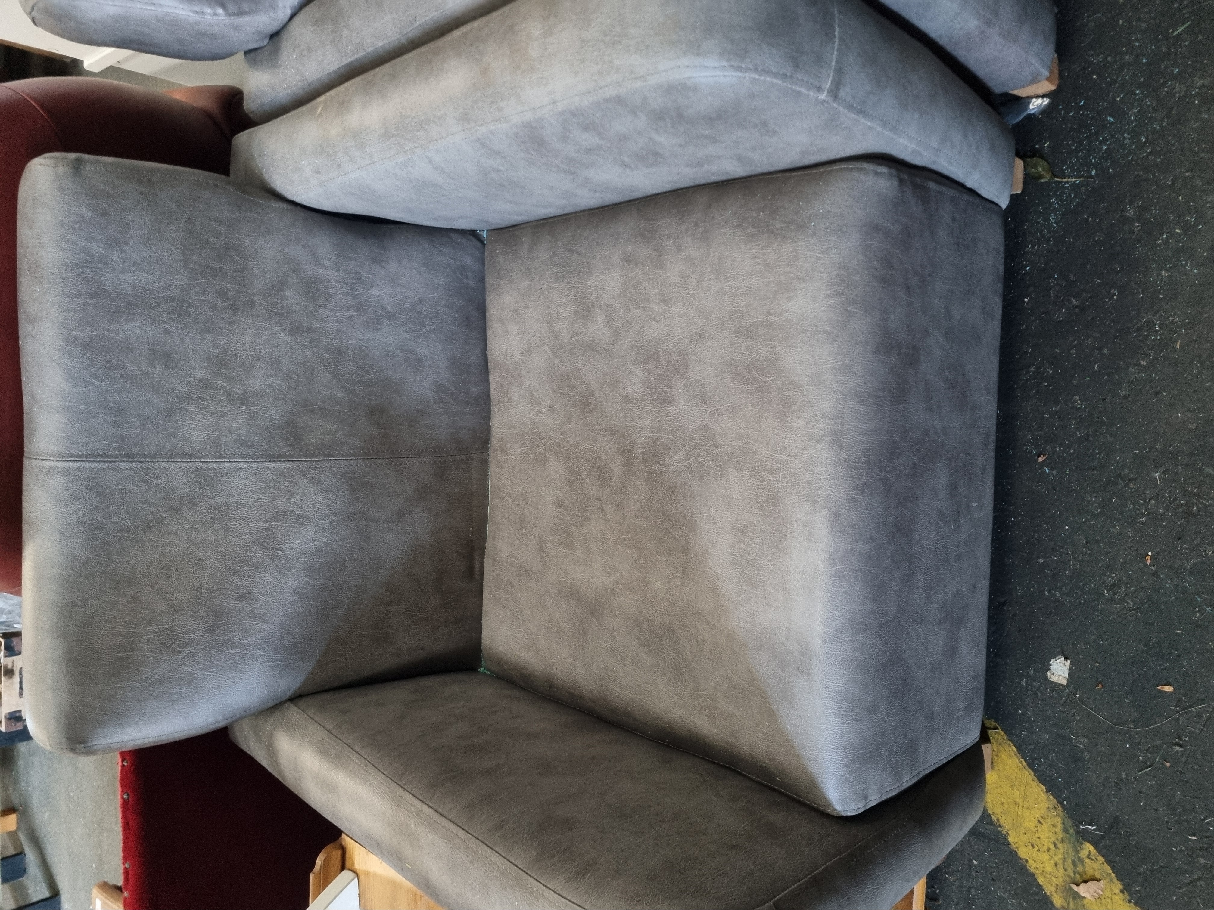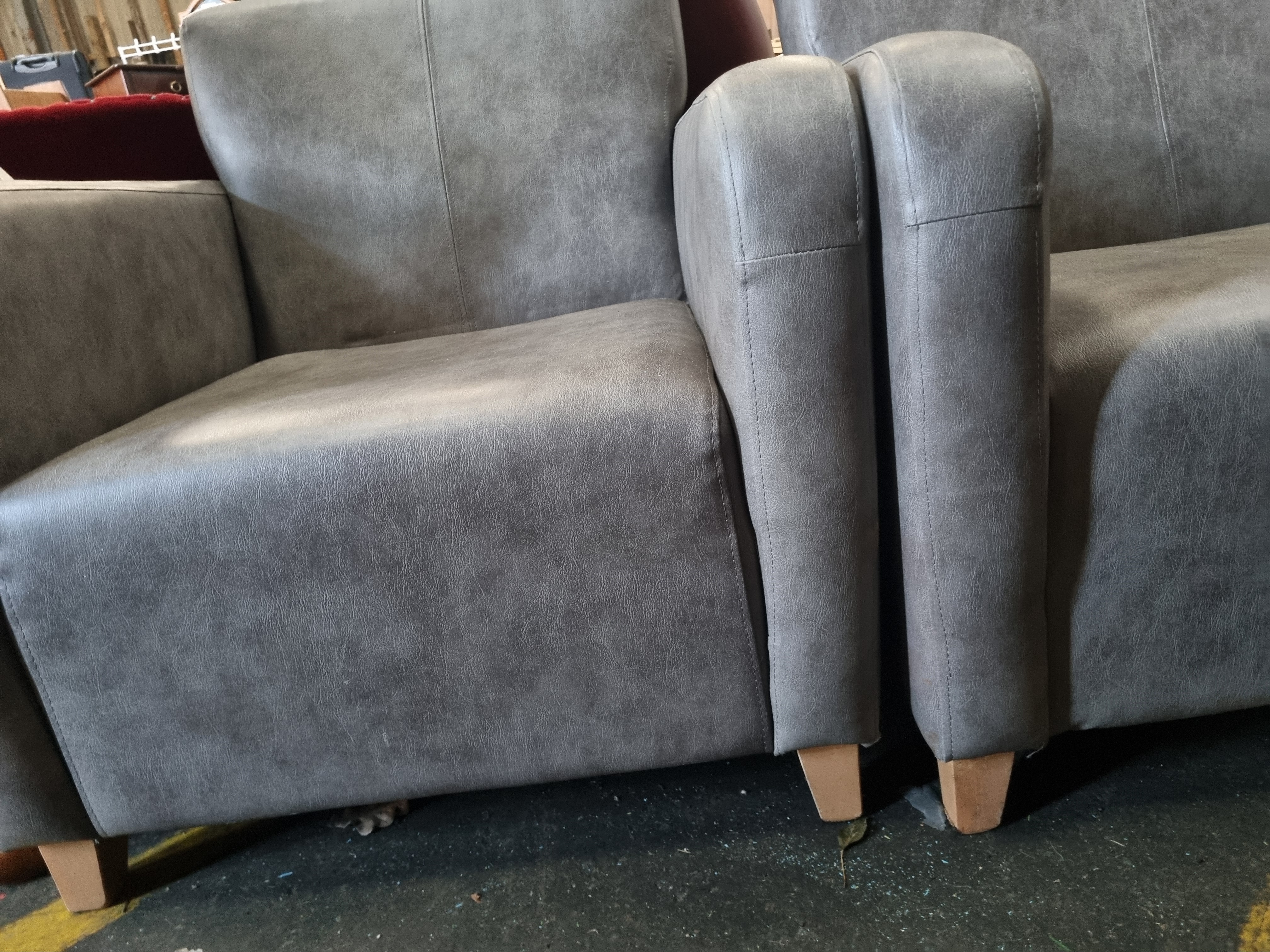 Attributed to the Serta Glendale collection, this three-piece lounge suite comprises a two-seater sofa and two matching armchairs. The suite features a contemporary block-profile design and is upholstered in a grey mottled-effect microfibre fabric. The upholstery is detailed with decorative vertical and horizontal seam stitching on the fixed backrests and seat cushions. The sofa construction includes a deep base consistent with convertible or click-clack furniture designs. Each unit is raised on four short, square-tapered feet made of a light-toned wood. No maker’s marks or branding are visible on the exterior of the items.