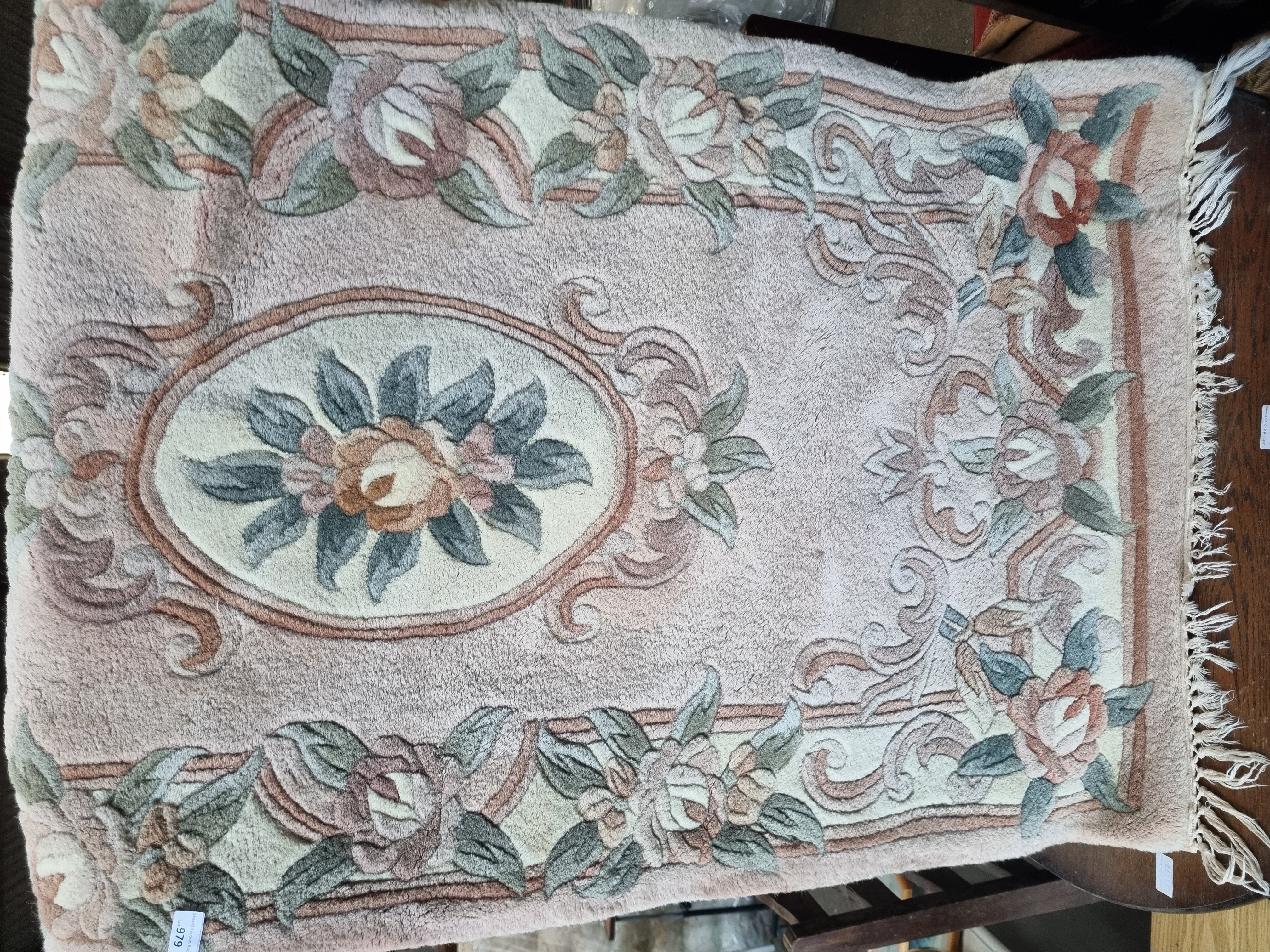 A modern Chinese wool rug in the Aubusson style, dating to the late 20th century. The rug is constructed with a heavy wool pile on a cotton foundation, featuring the thick super-pile characteristic of Chinese imports from this period. The decorative scheme includes a central oval medallion with a floral spray, surrounded by rococo-style scrollwork and a wide border of scrolling flowers and foliage. A hand-carved technique has been employed to clip the pile around the motifs, creating a three-dimensional embossed effect. The colour palette consists of a dusty rose ground with highlights in sage green, cream, taupe, and terracotta. The rug is finished with a short cream-coloured cotton fringe to the ends.