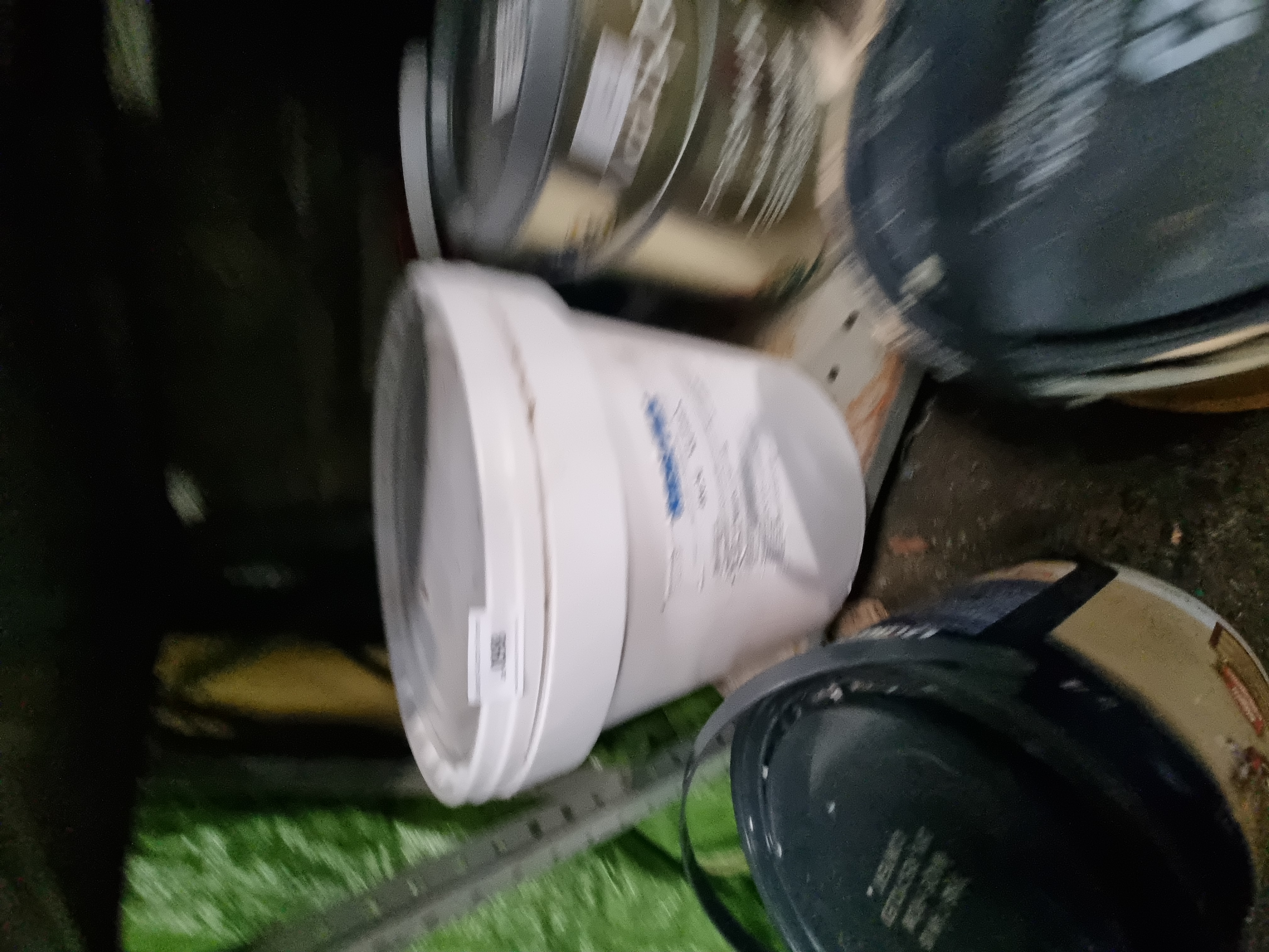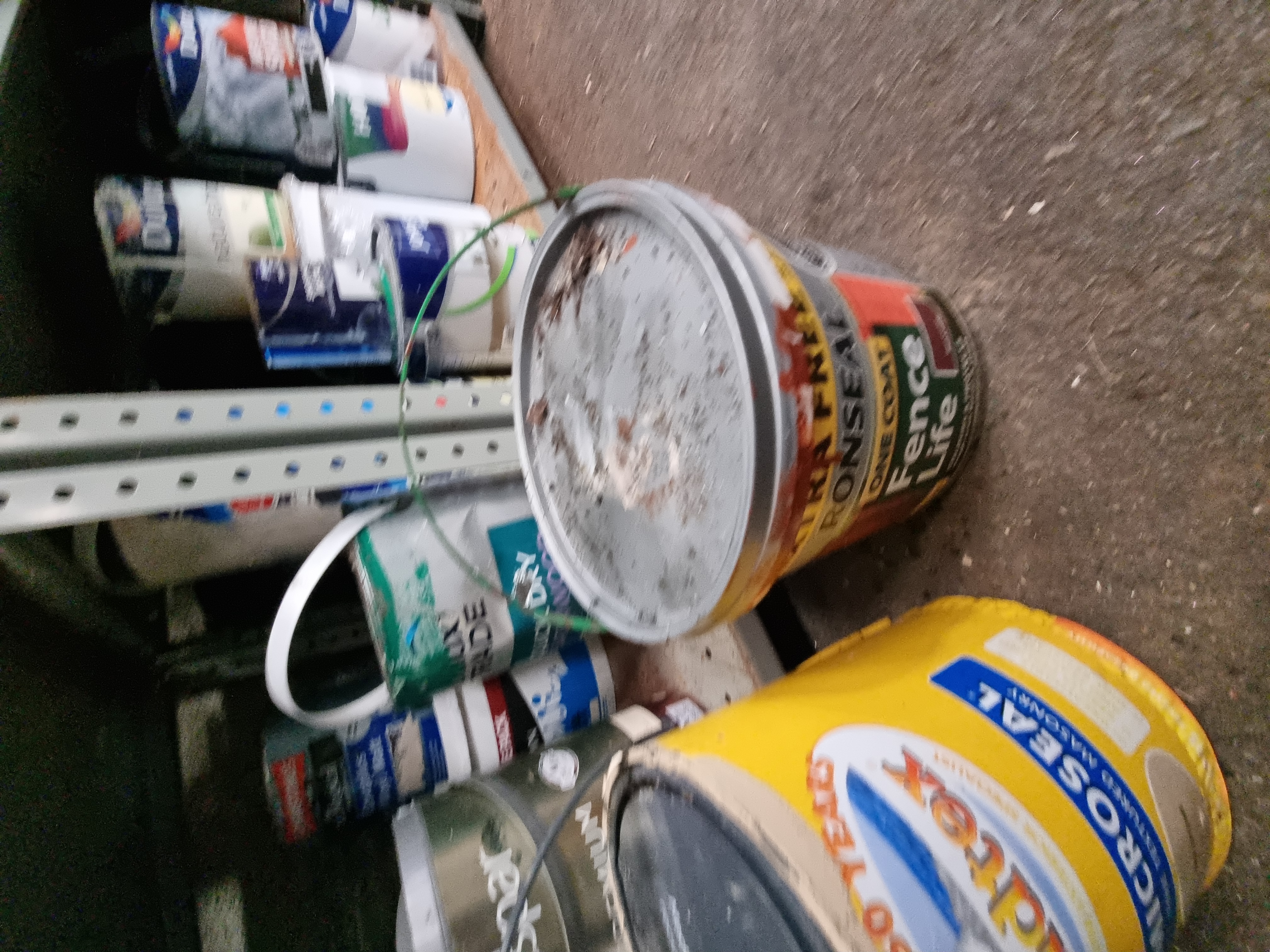 Mixed Condition. Items appear as open-box or liquidation goods. Containers show visible signs of handling including paint drips, surface dirt, and storage debris on lids and bodies. Several containers bear previous auction house lot stickers. Items are loose and show signs of handling consistent with overstock or customer returns.