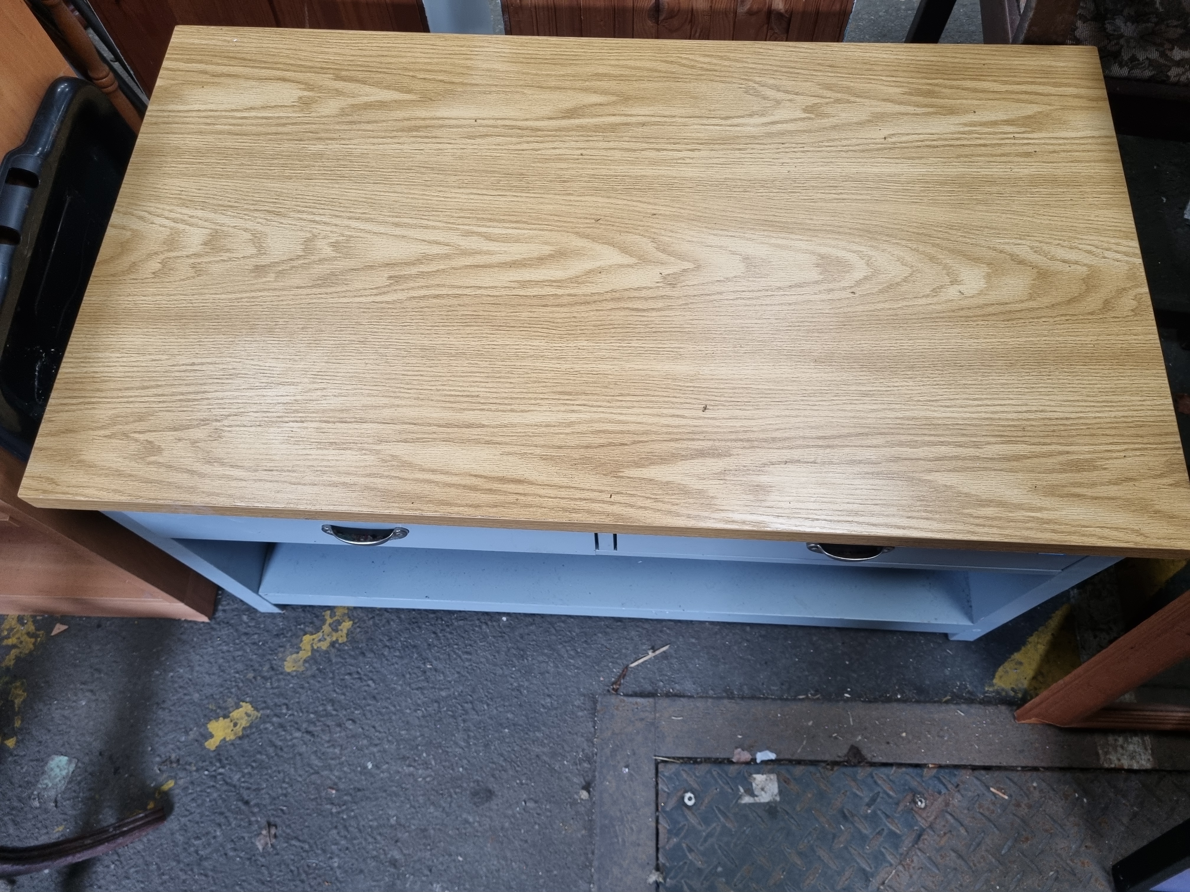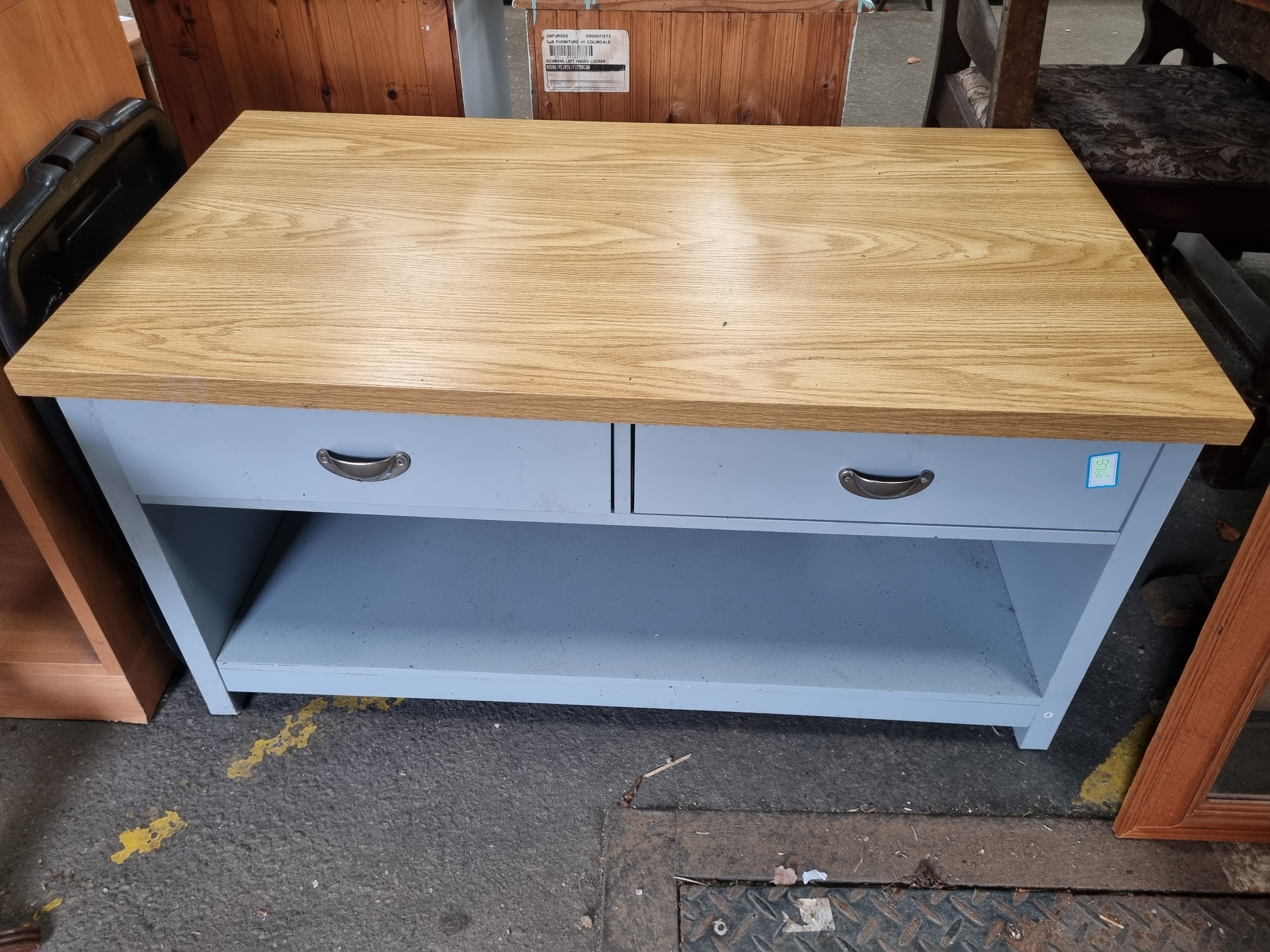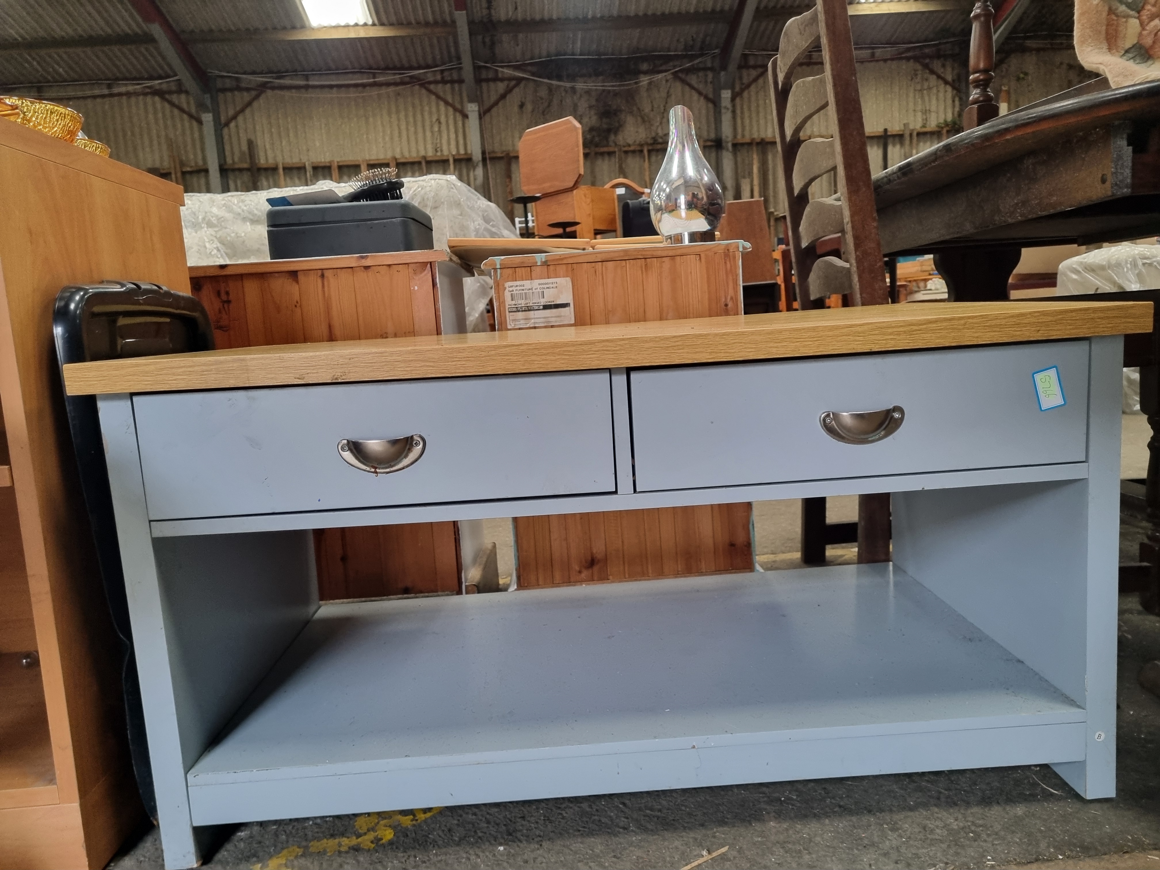 Lot 983: A contemporary two-drawer coffee table with oak-effect top and blue-grey painted base