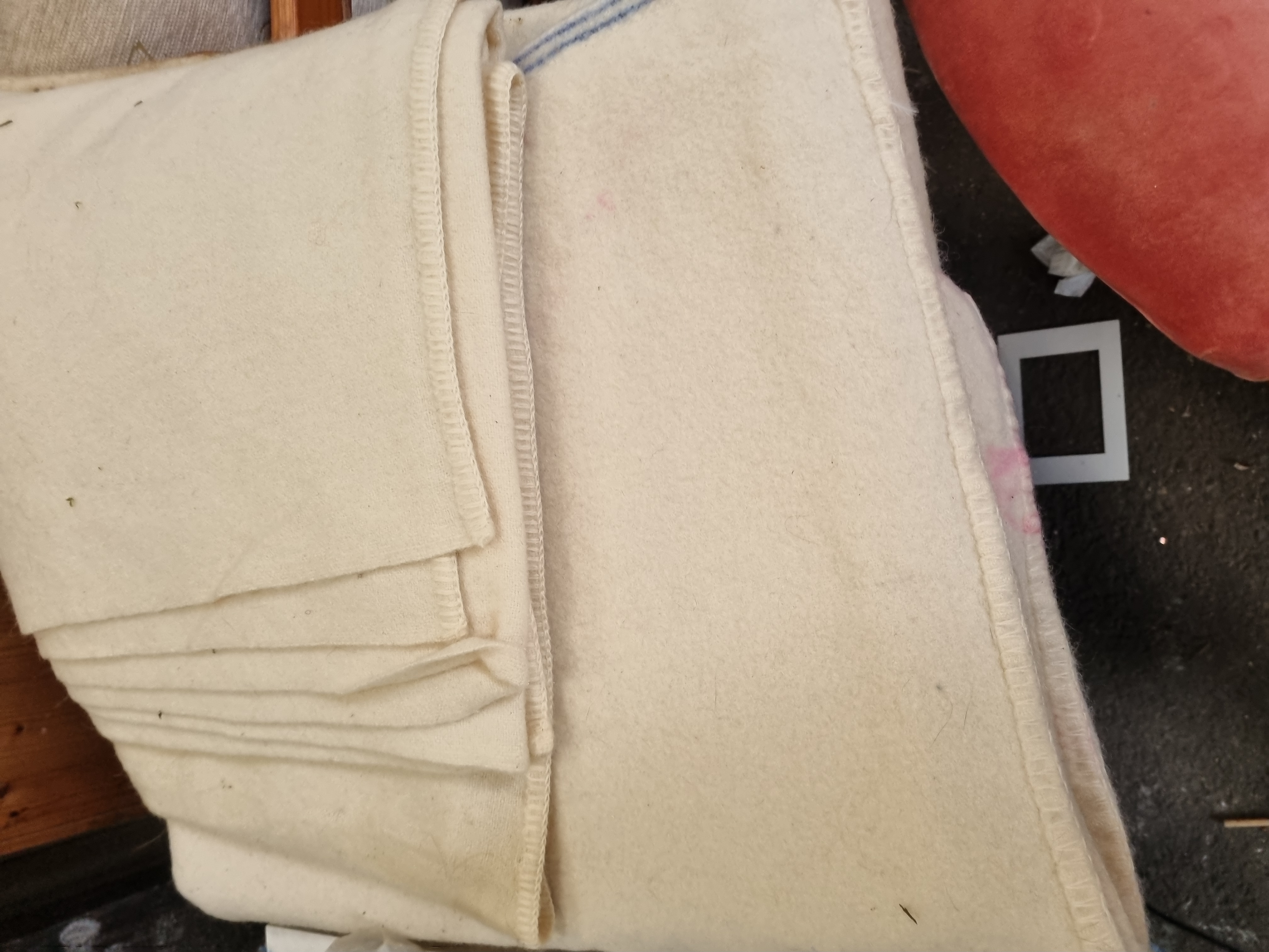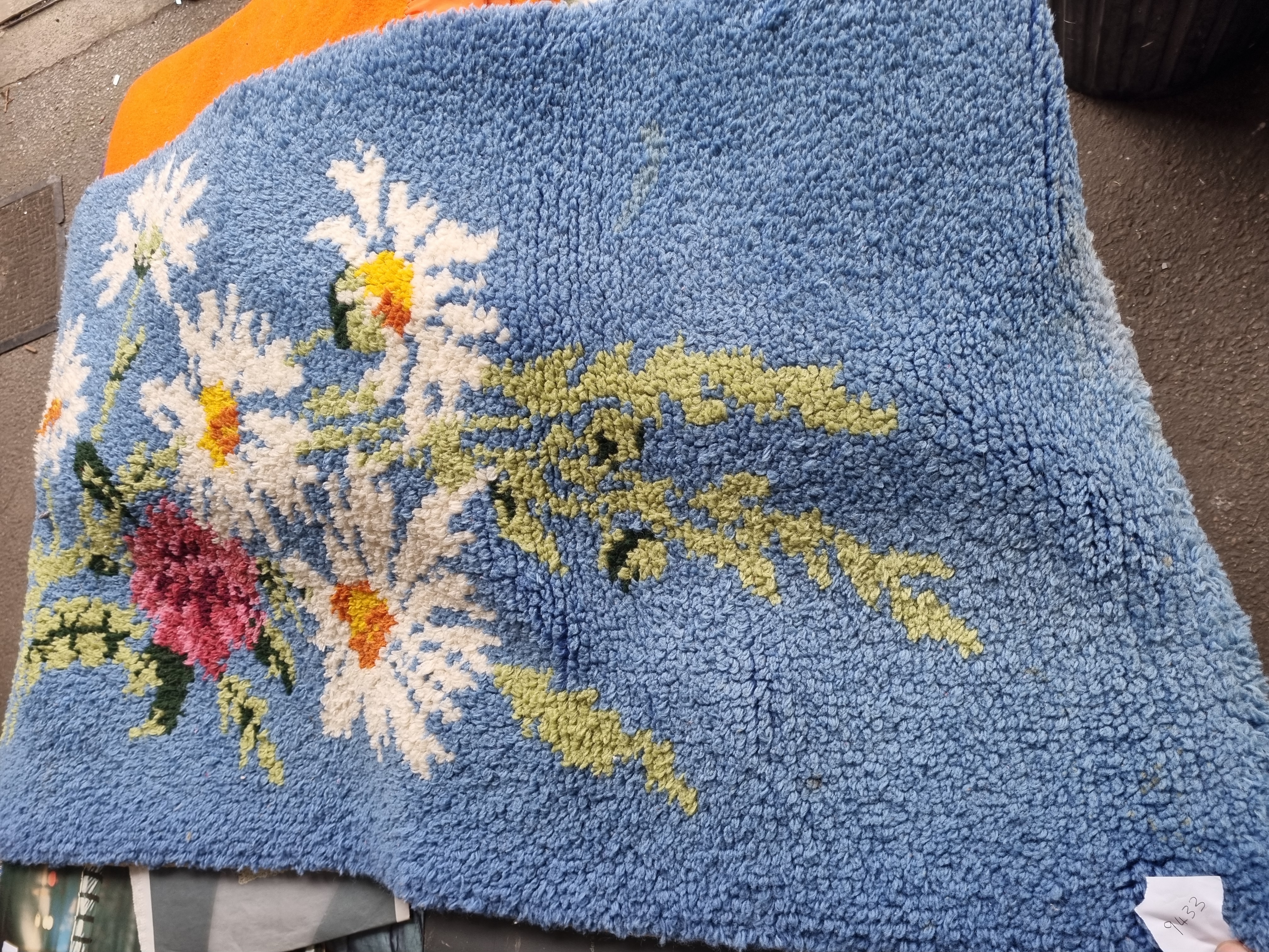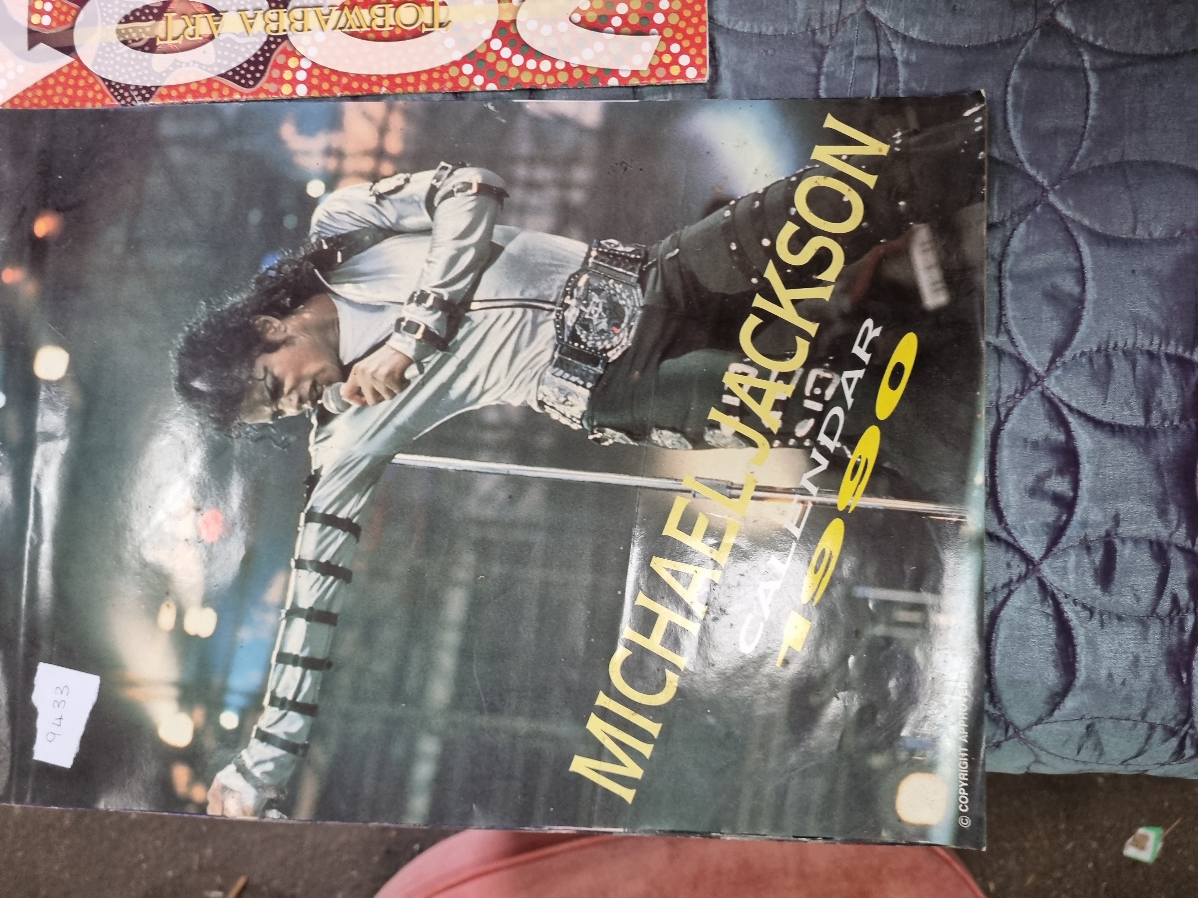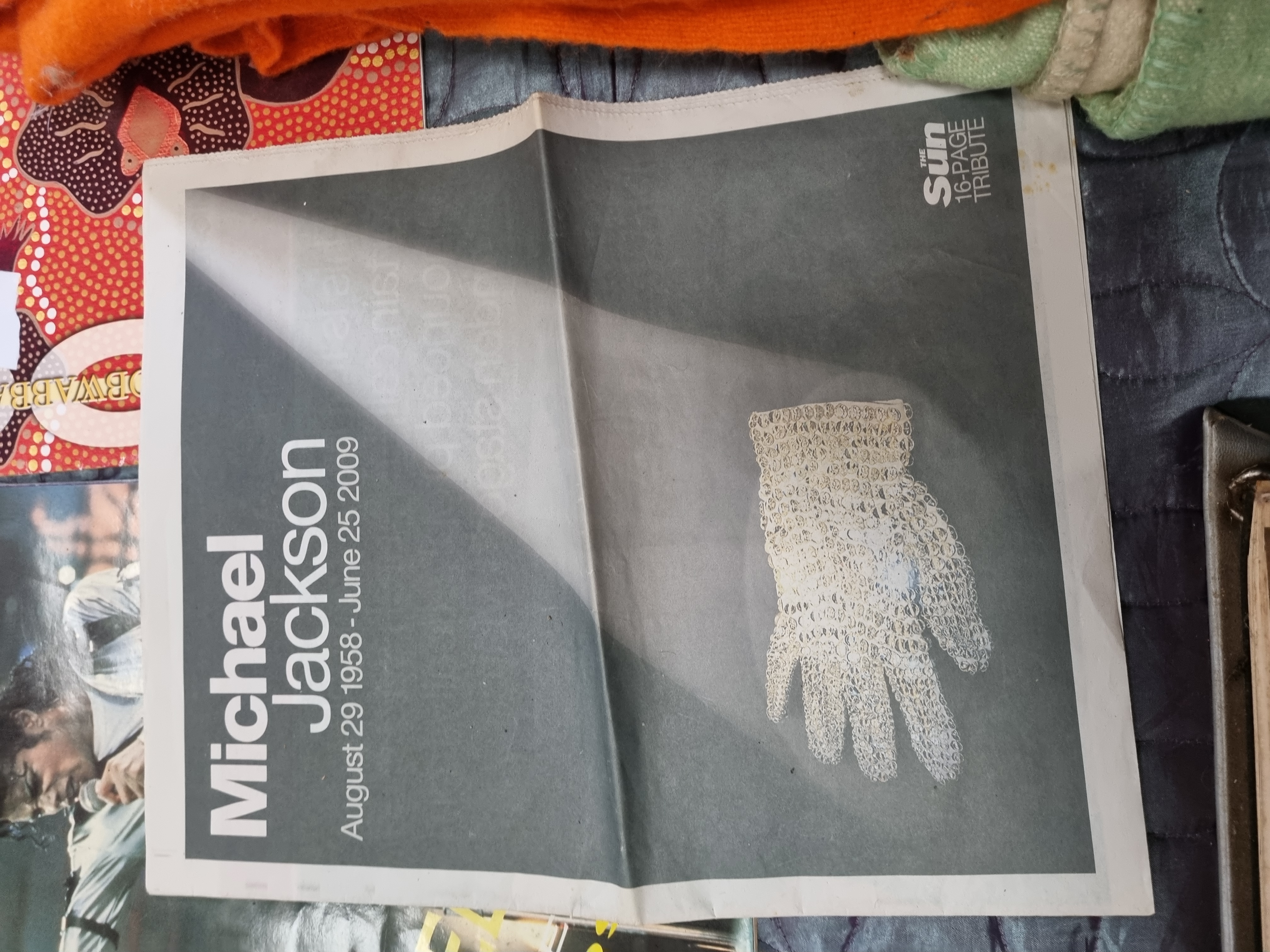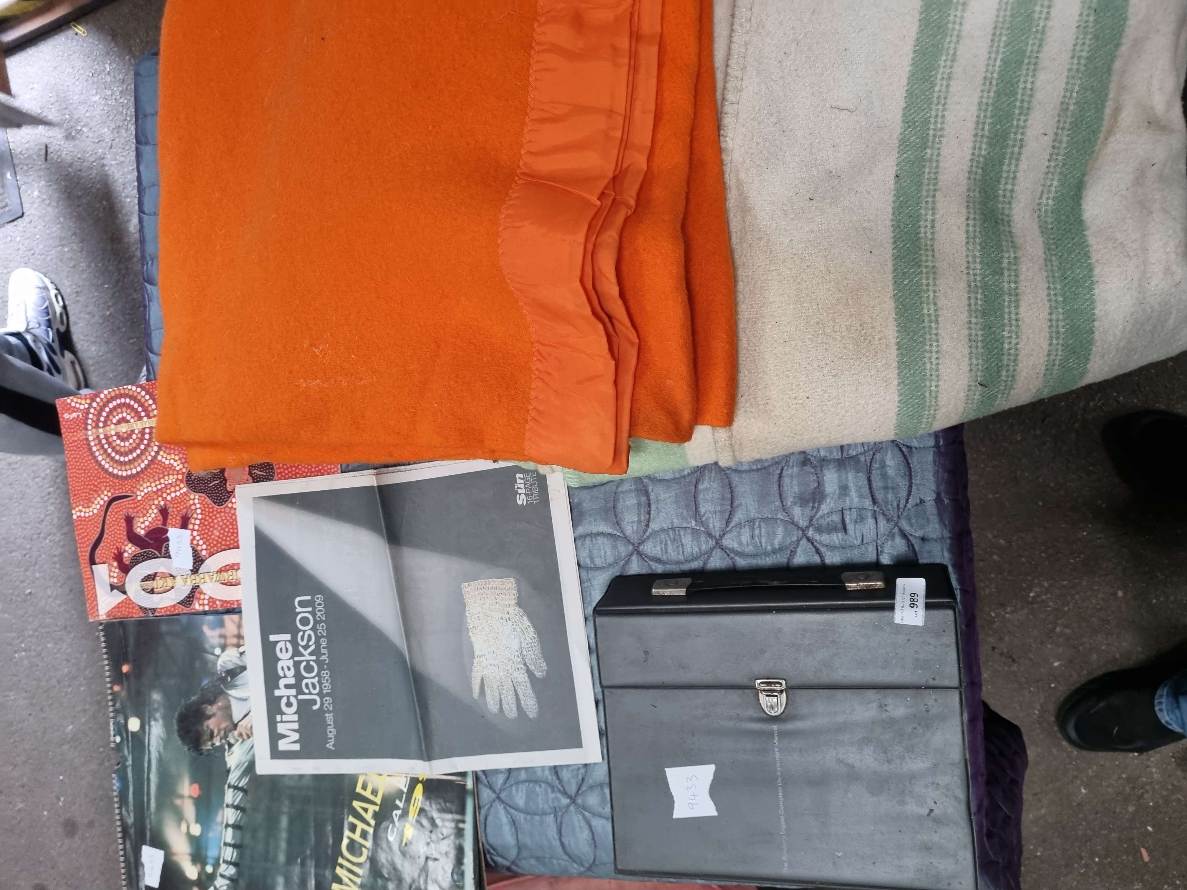 This lot comprises a variety of entertainment ephemera and domestic textiles. The collection includes a 16-page commemorative tribute supplement published by The Sun newspaper in 2009 following the death of Michael Jackson, featuring a cover image of the artist’s white sequined glove and the text Michael Jackson August 29 1958 – June 25 2009. Also included is an official 1990 Michael Jackson calendar featuring photography from the Bad world tour era, marked Copyright Approved. The textile component consists of a bright orange synthetic fleece blanket with a wide satin-effect binding edge, a cream-coloured wool blanket with woven green and blue stripes, and an assortment of folded cream blankets of varying weights. A light blue shaggy pile rug or mat decorated with a floral motif of white daisies and pink blossoms is present. Miscellaneous items include a black textured hard-sided carrying case with twin metal latches and a plastic handle, bearing a white adhesive label marked 9433 and an auction sticker for Lot 989 from Iskand Auction Rooms. A publication featuring Tobwabba Art with Aboriginal-style dot painting is also included. The lot is presented on a purple quilted fabric base.