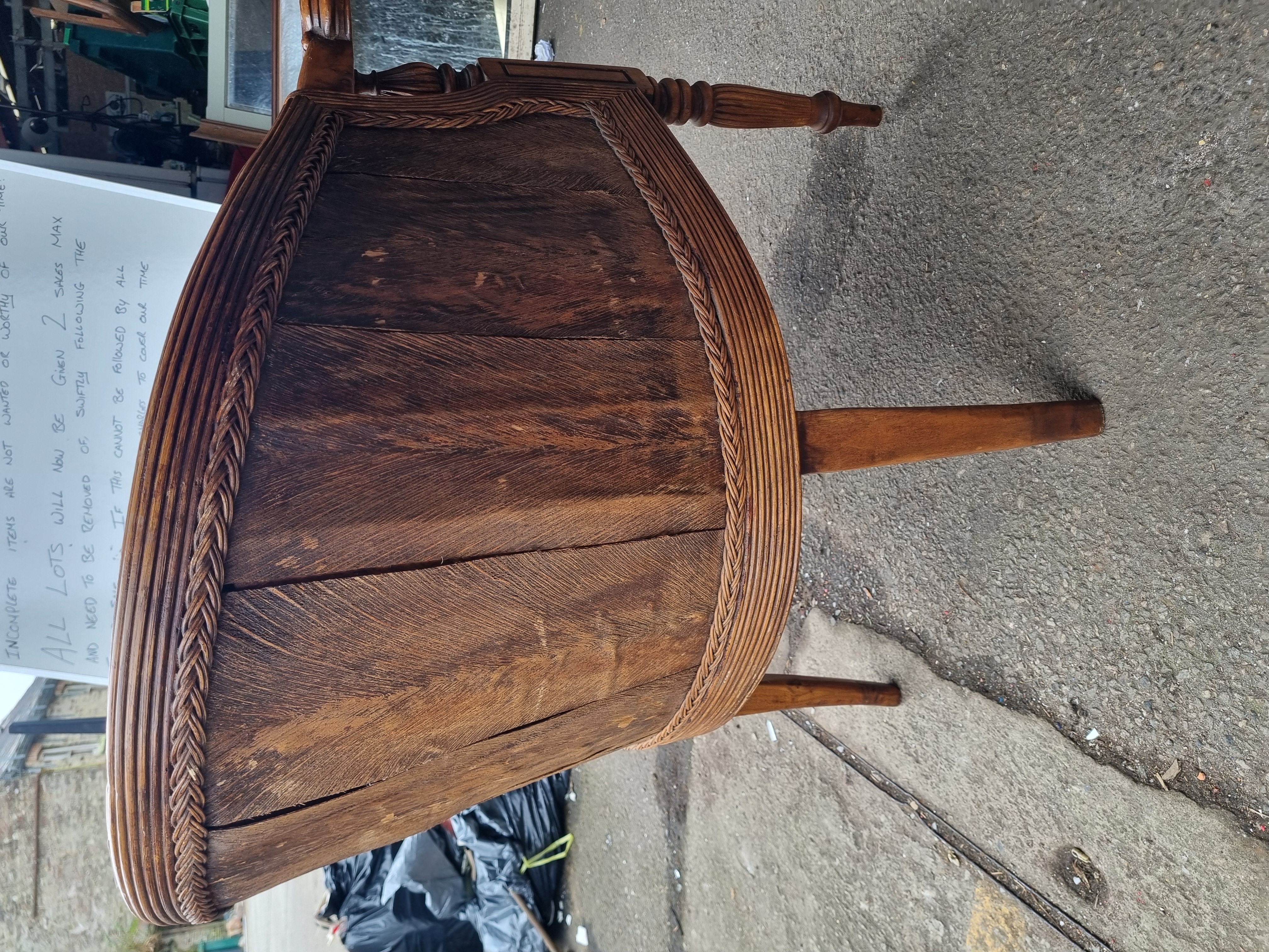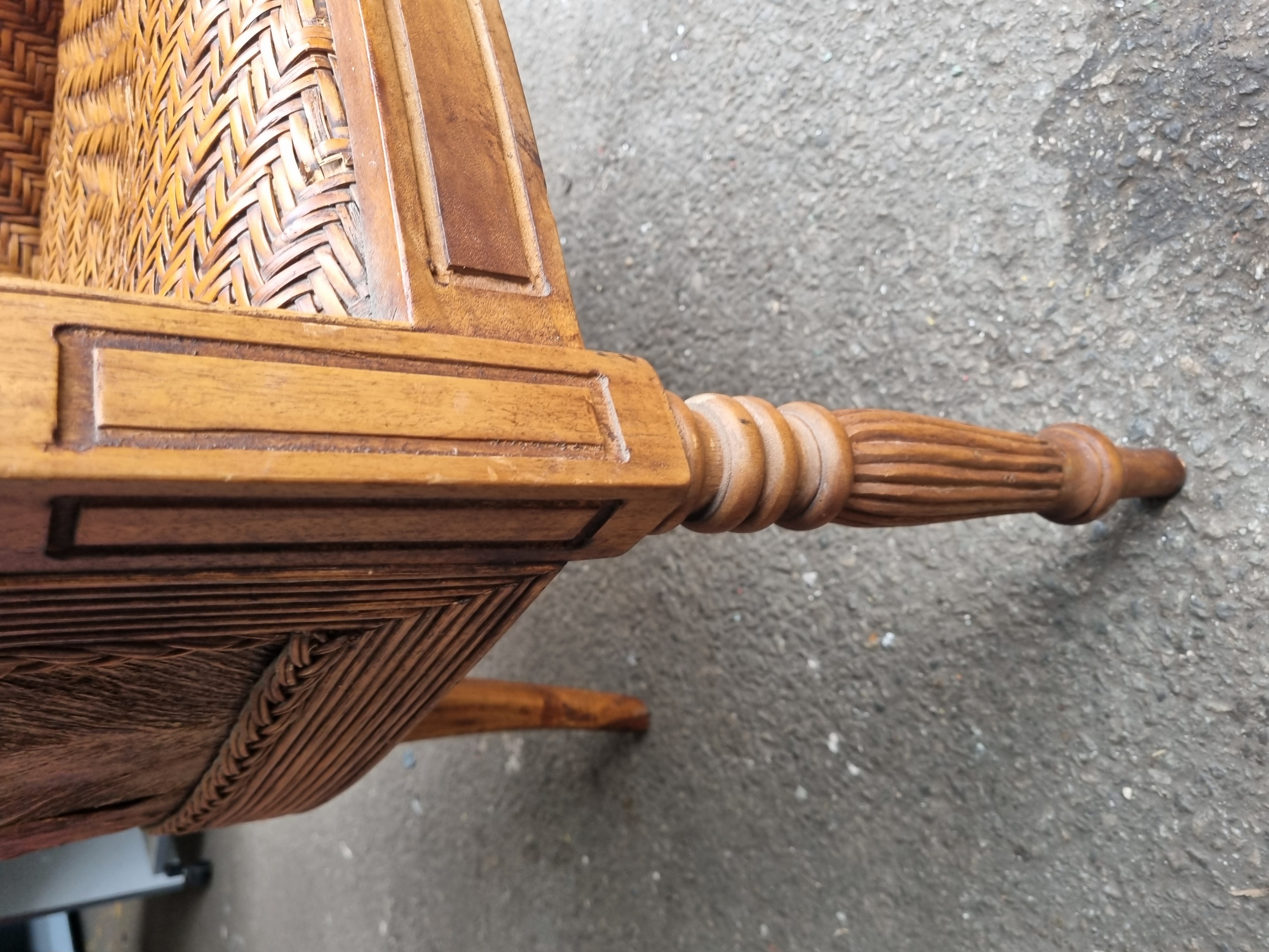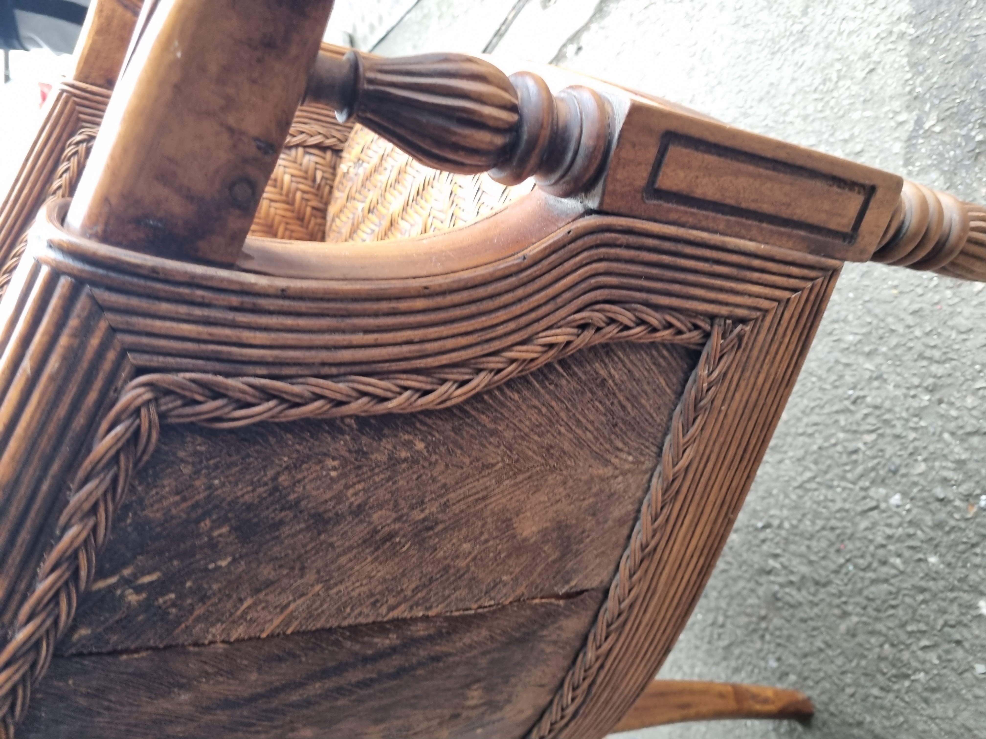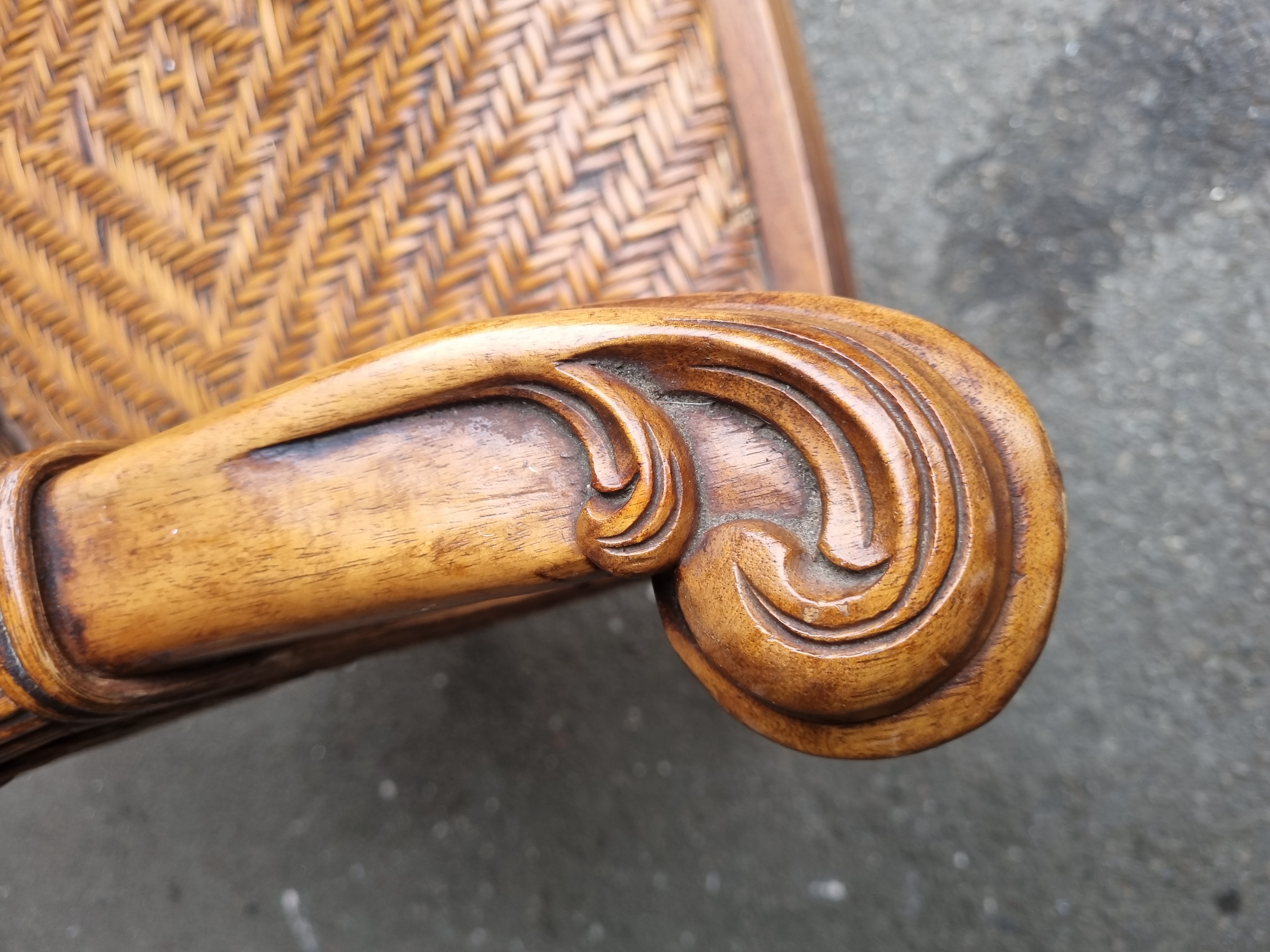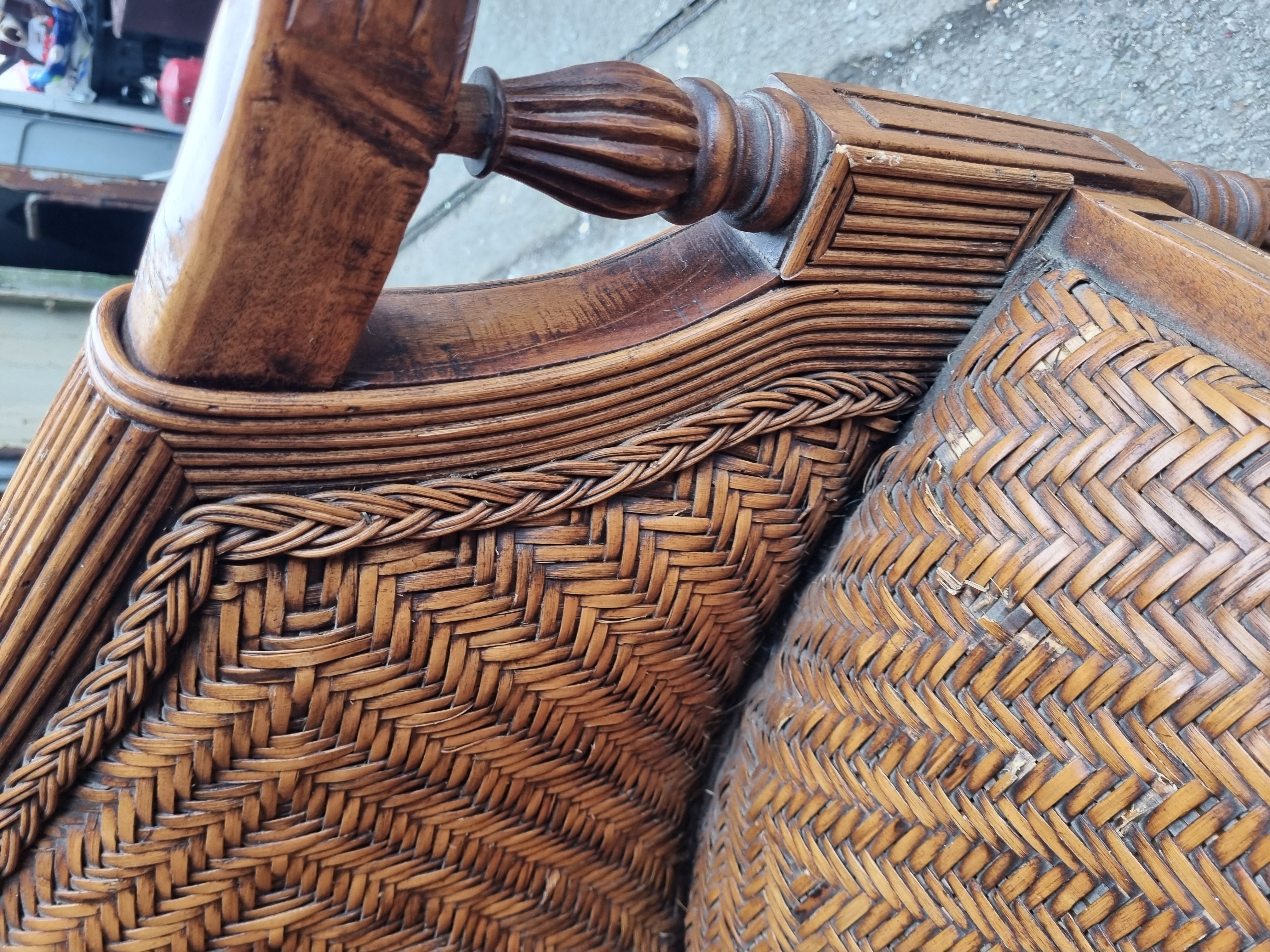 The chair is in good structural condition with wear commensurate with age. There are visible surface scuffs, scratches, and minor indentations to the timber, particularly on the armrests and legs. The woven cane panels remain largely intact, with minor fraying and small breaks to some individual strands. The underside shows natural shrinkage and surface cracking to the wood planks, typical for the age of the piece.