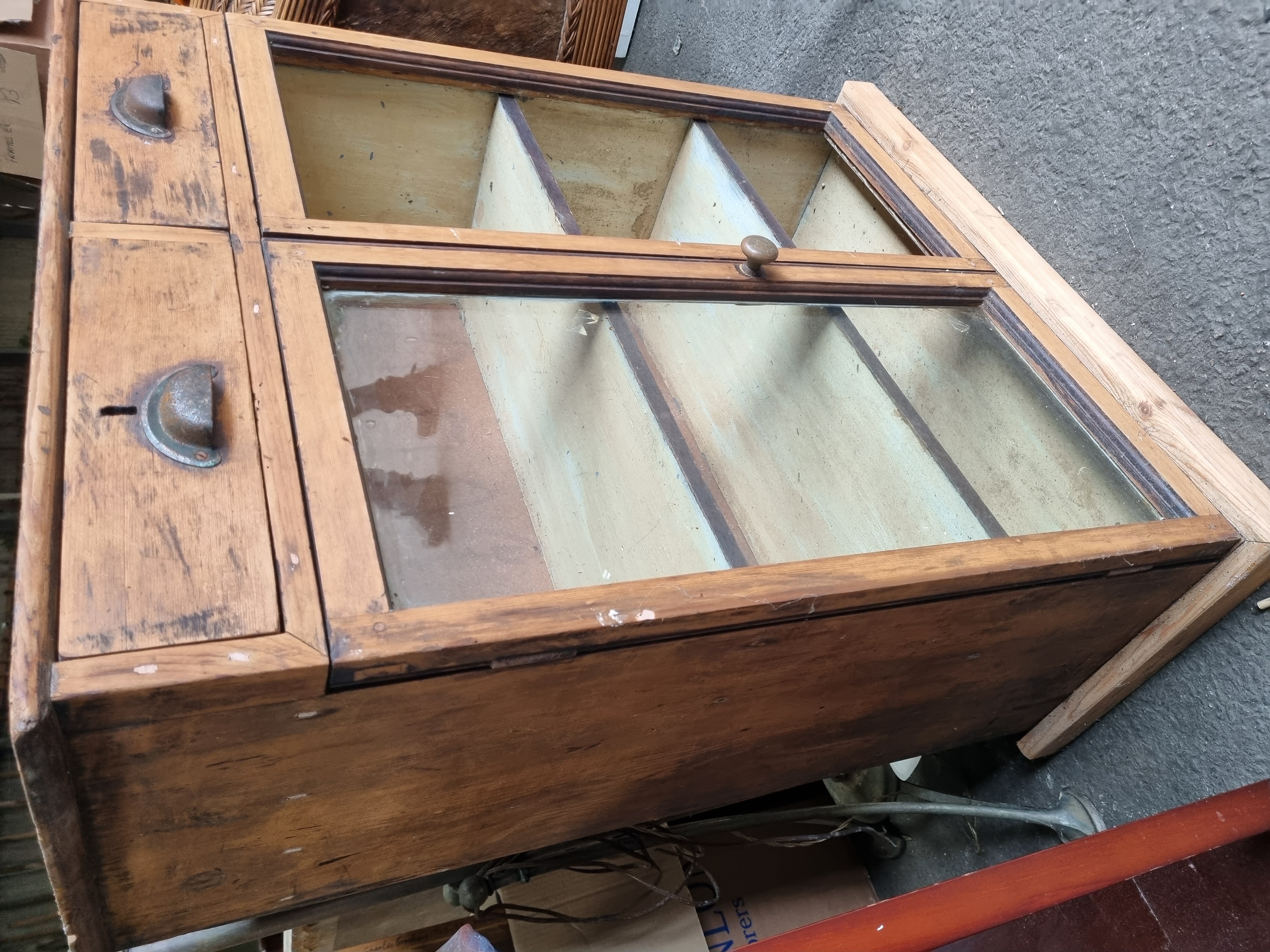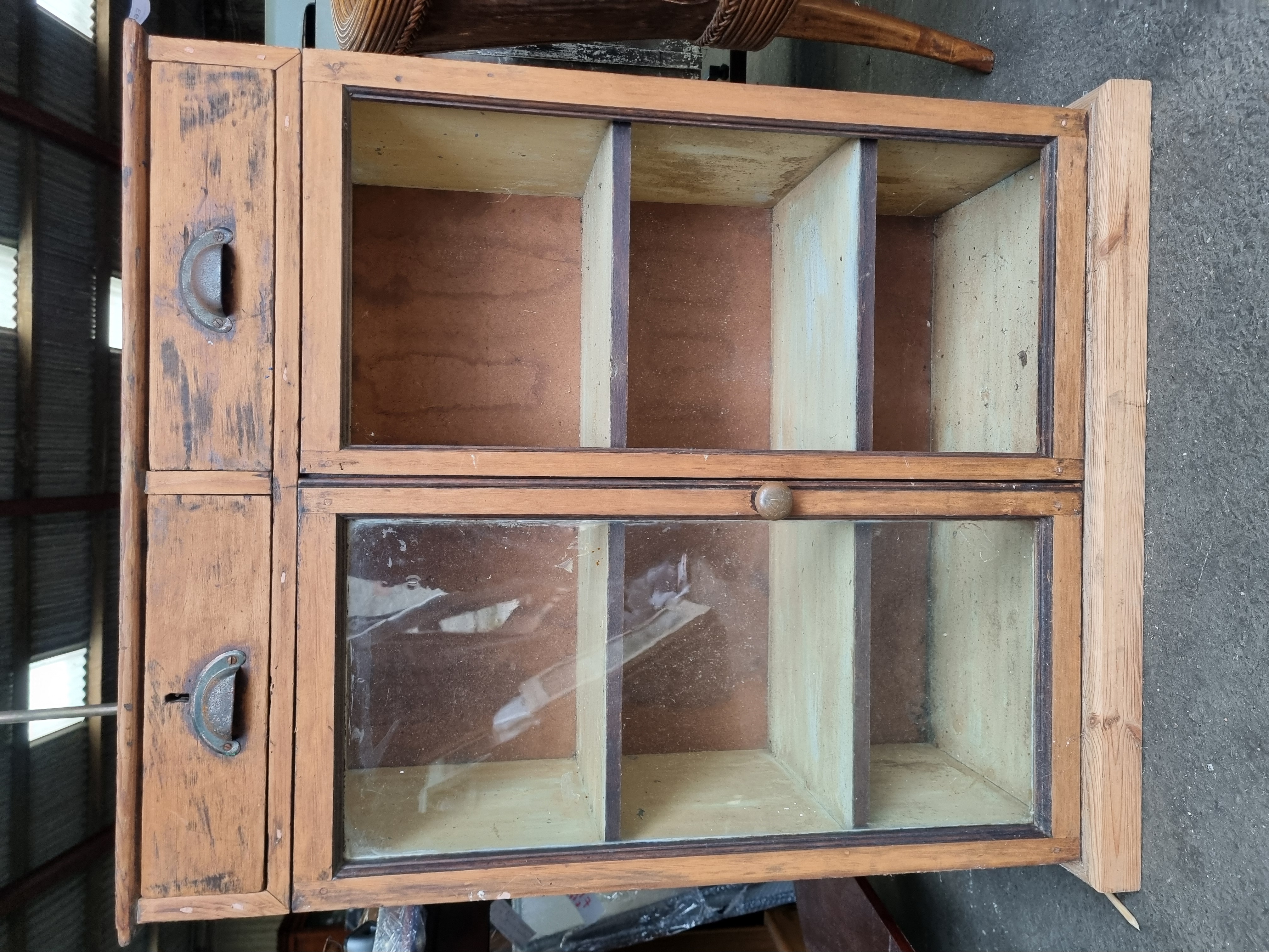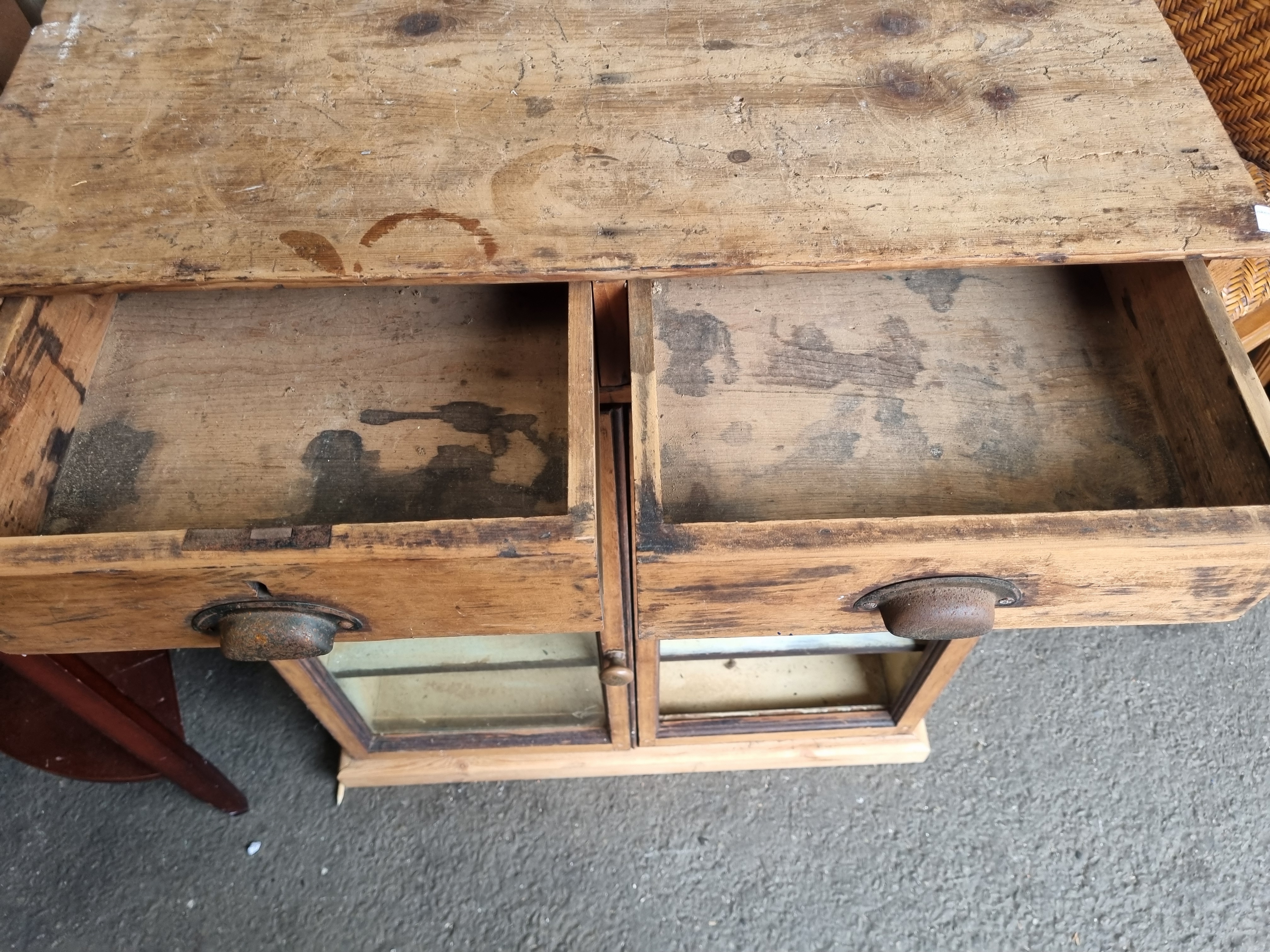 Lot 993: A mid-20th-century utilitarian pine shop display cabinet with two drawers