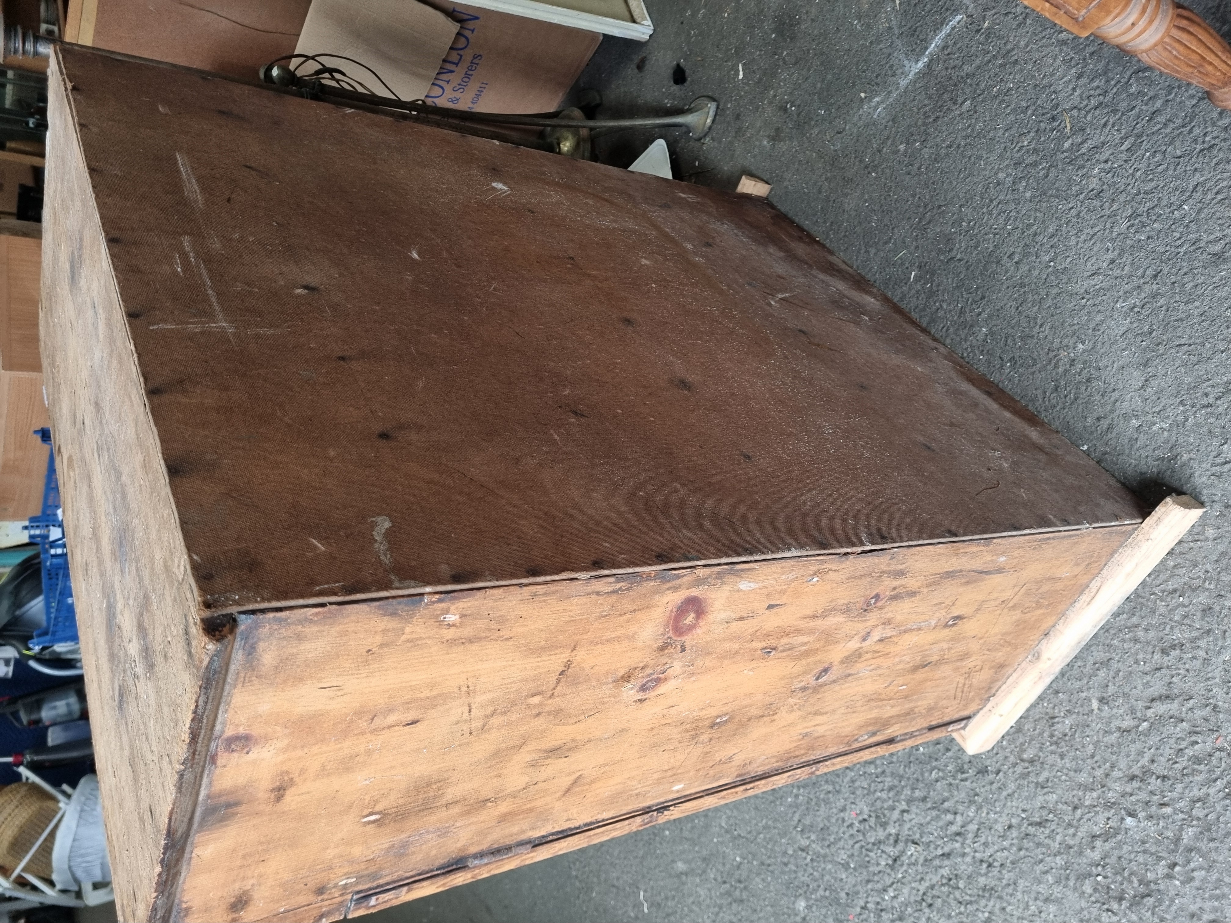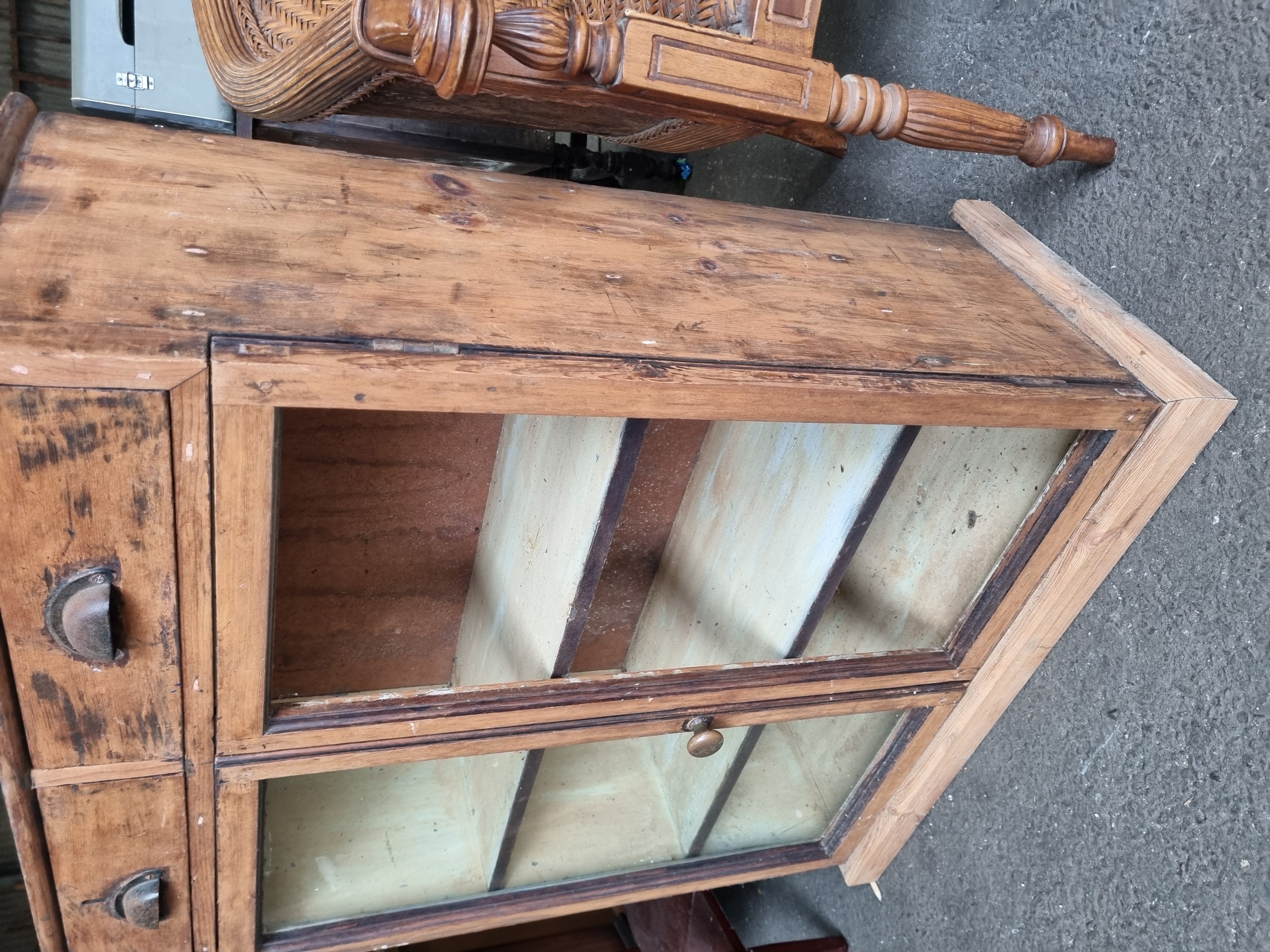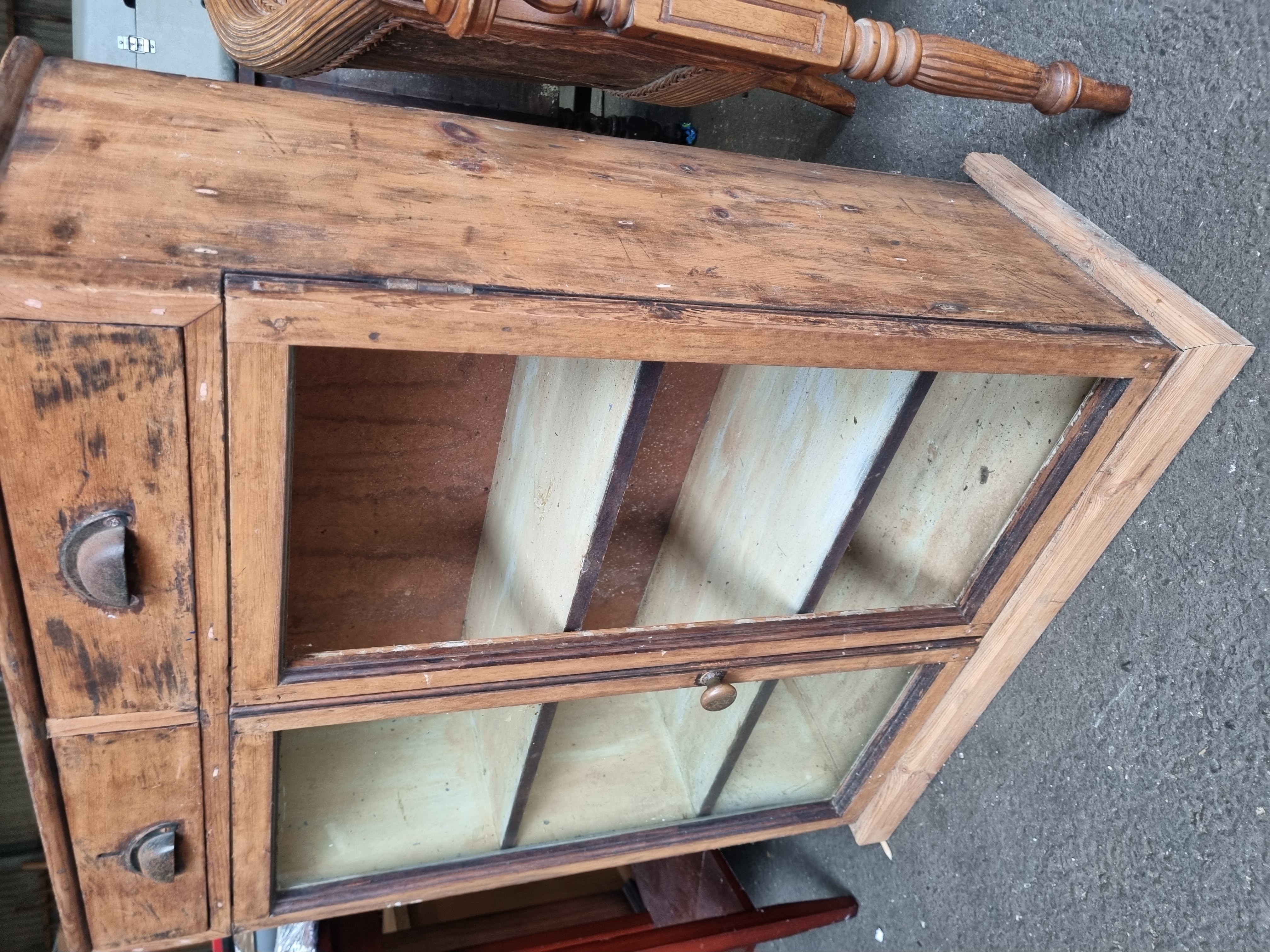 The cabinet exhibits significant signs of age and industrial use, including staining, surface wear, and scratches to the pine. The drawer interiors show heavy staining. One pane of glass is missing. The back panel is a later replacement.