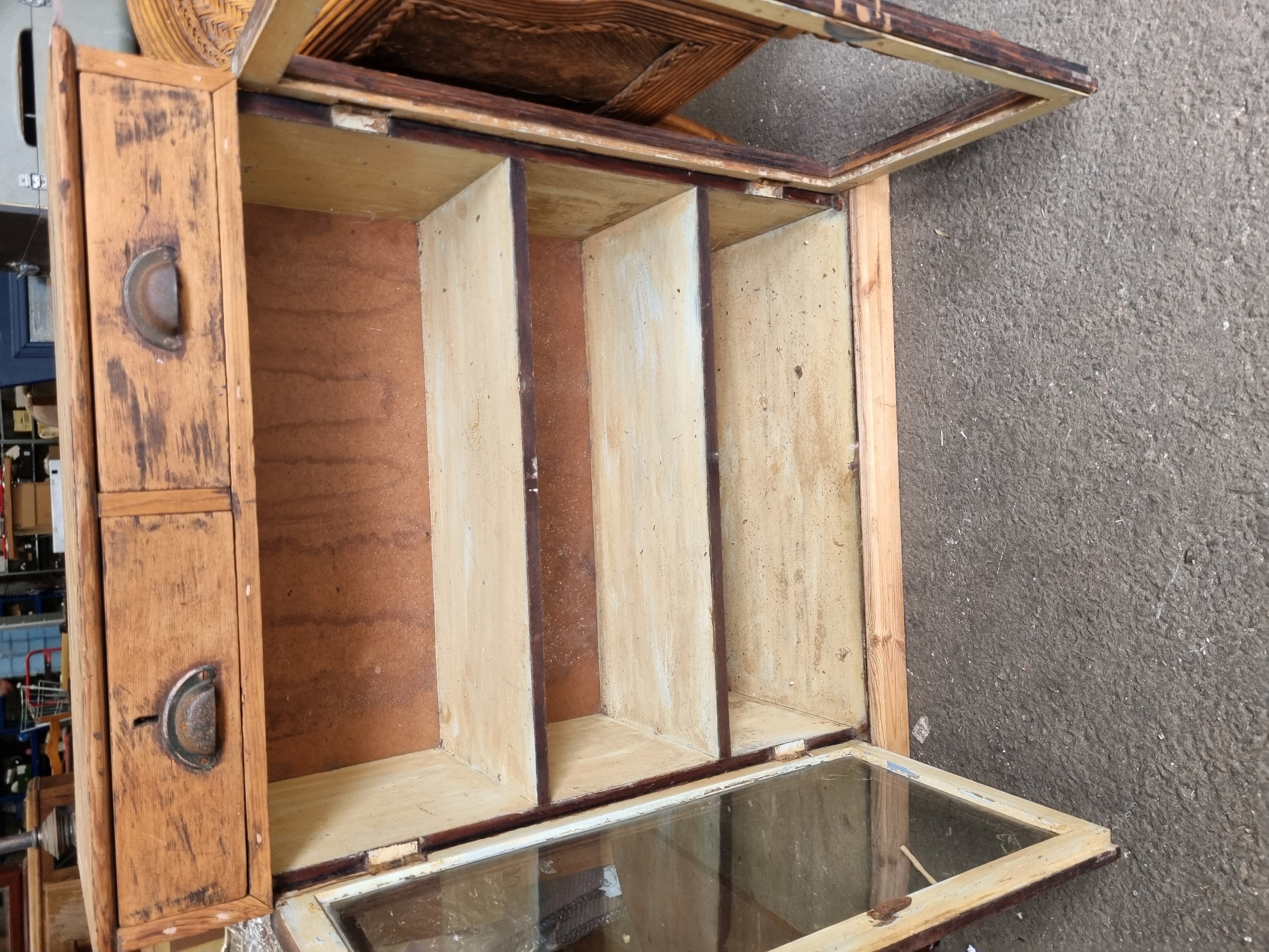 A single-piece utilitarian shop display or workshop cabinet of pine construction. The unit features two side-hinged glazed doors, though one pane of glass is missing. The interior is divided into three equal compartments by two vertical wooden partitions and shows remnants of a light-coloured paint or wash. To the left side is a vertical bank of two short drawers, each fitted with a weathered metal cup handle. The doors are attached with simple metal butt hinges and one door is fitted with a small turned wooden knob. The back panel is a later replacement made of hardboard or thin plywood.