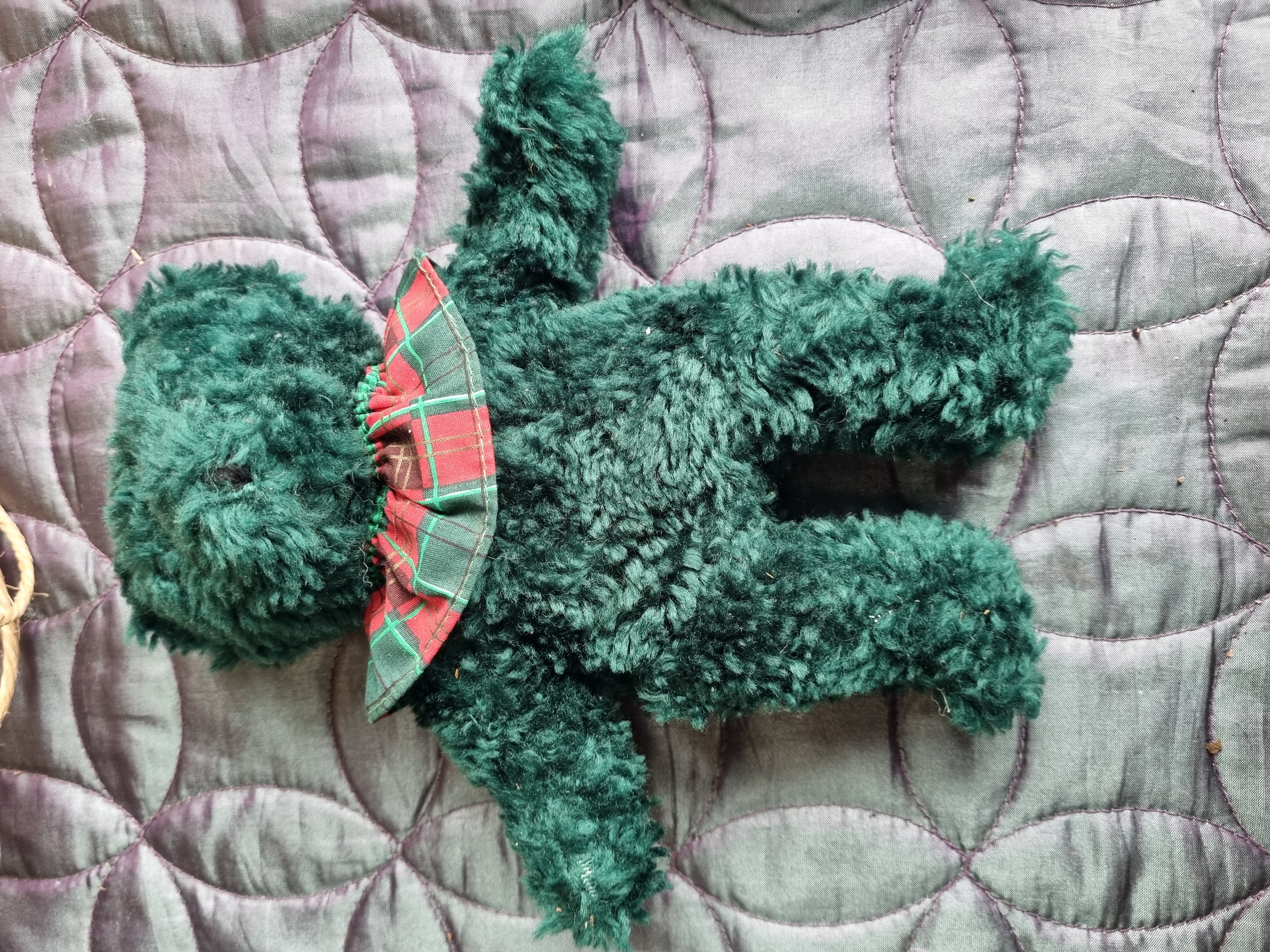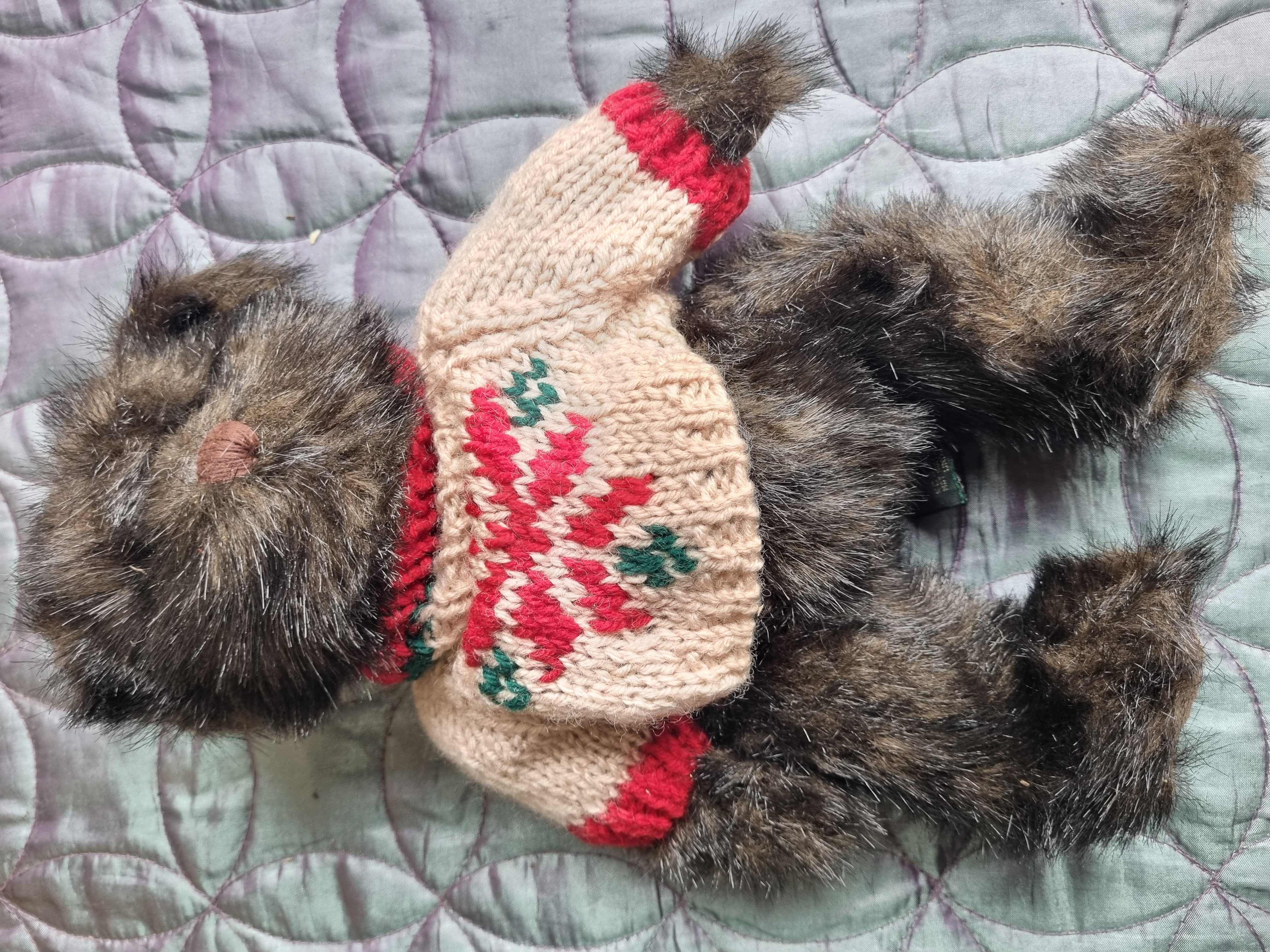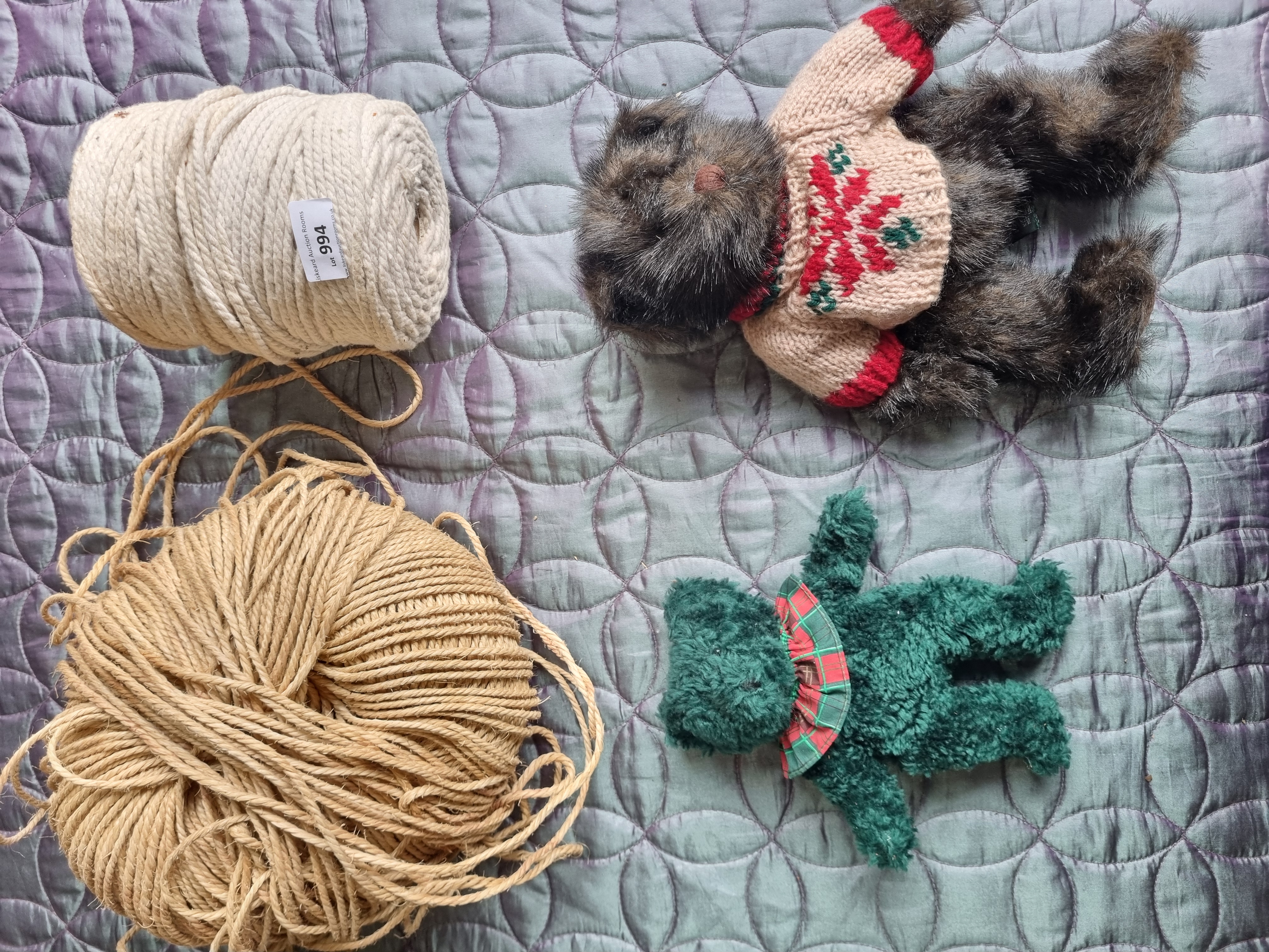 This lot consists of two plush teddy bears and a collection of cordage. The first bear is a medium-sized example featuring variegated dark brown and black long-pile synthetic plush, a hand-stitched brown nose, and a cream-coloured knitted sweater decorated with a red and green geometric pattern. A green fabric manufacturer tag is present under the left arm. The second bear is smaller in scale, crafted from emerald green curly plush and wearing a red and green plaid ruffled fabric collar. The cordage includes a large, loosely wound ball of tan-coloured natural fibre twine, likely jute or sisal, and a large cylindrical spool of cream-coloured braided rope of cotton or synthetic blend construction. The rope spool retains a white rectangular paper label from Liskeard Auction Rooms, Lot 994.