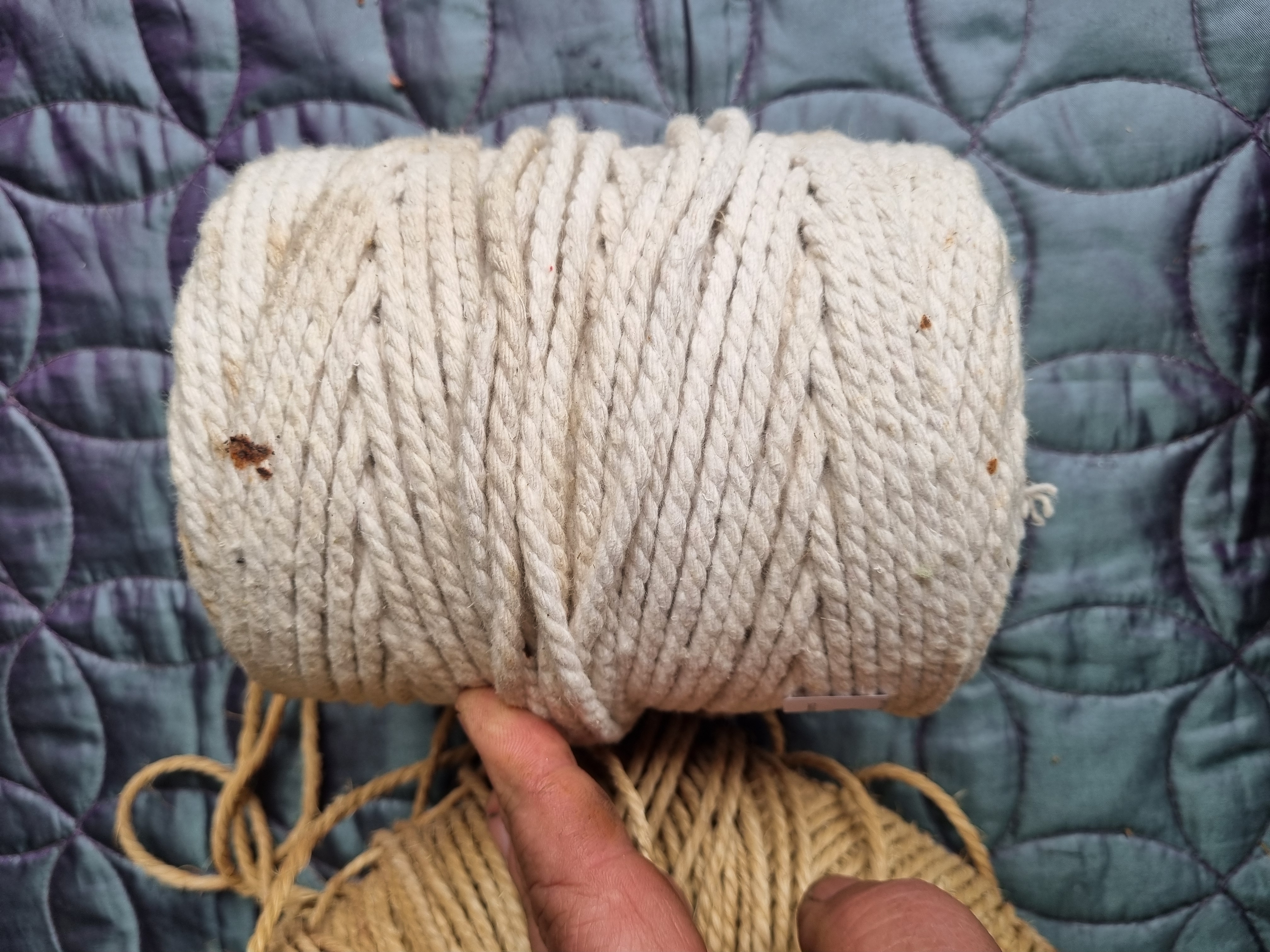 The items are in generally good, used condition. Both bears appear complete with no significant loss to the plush pile. The cream rope spool shows scattered brown surface staining on the outer layers. The tan twine is loosely tangled.