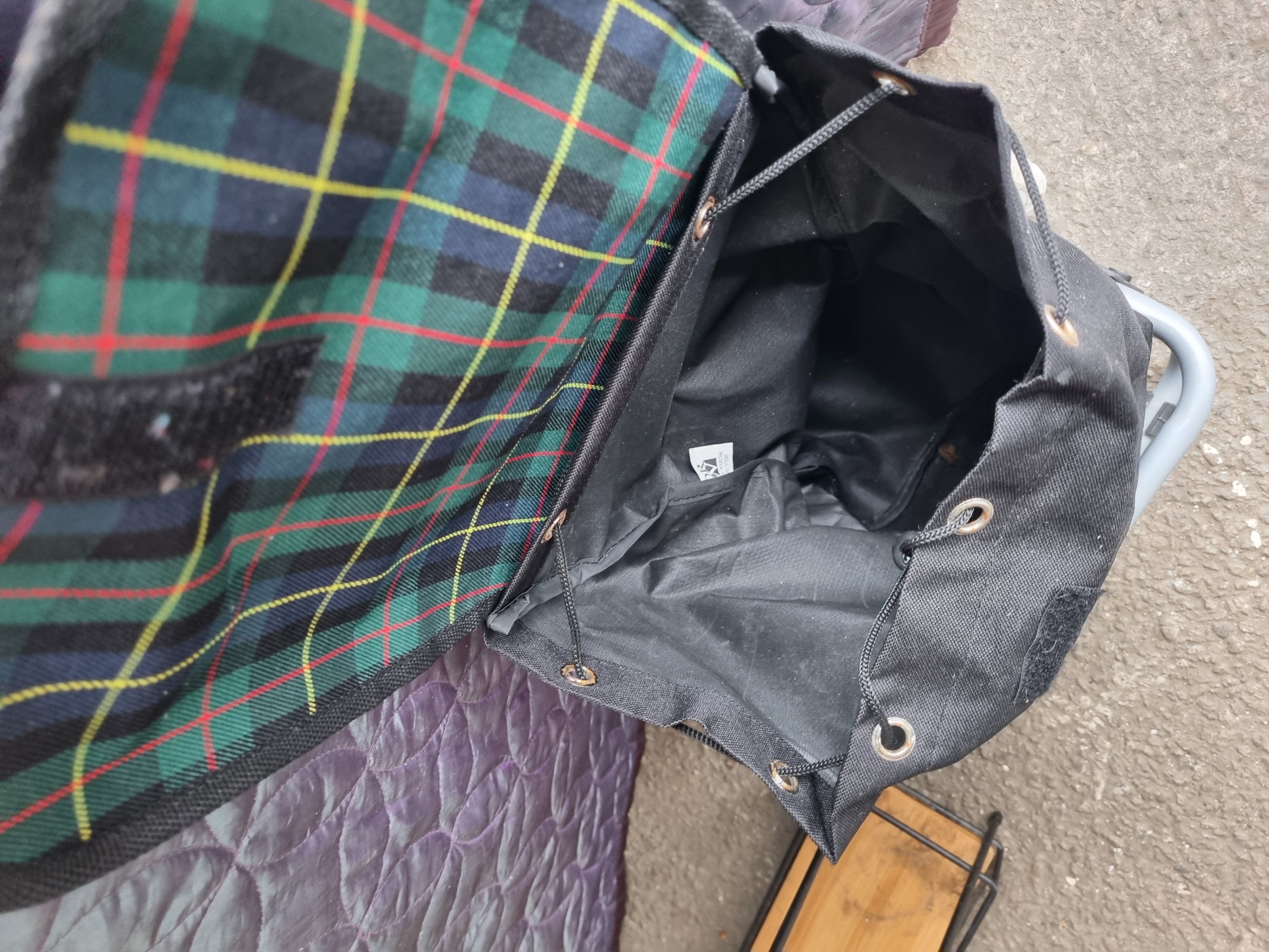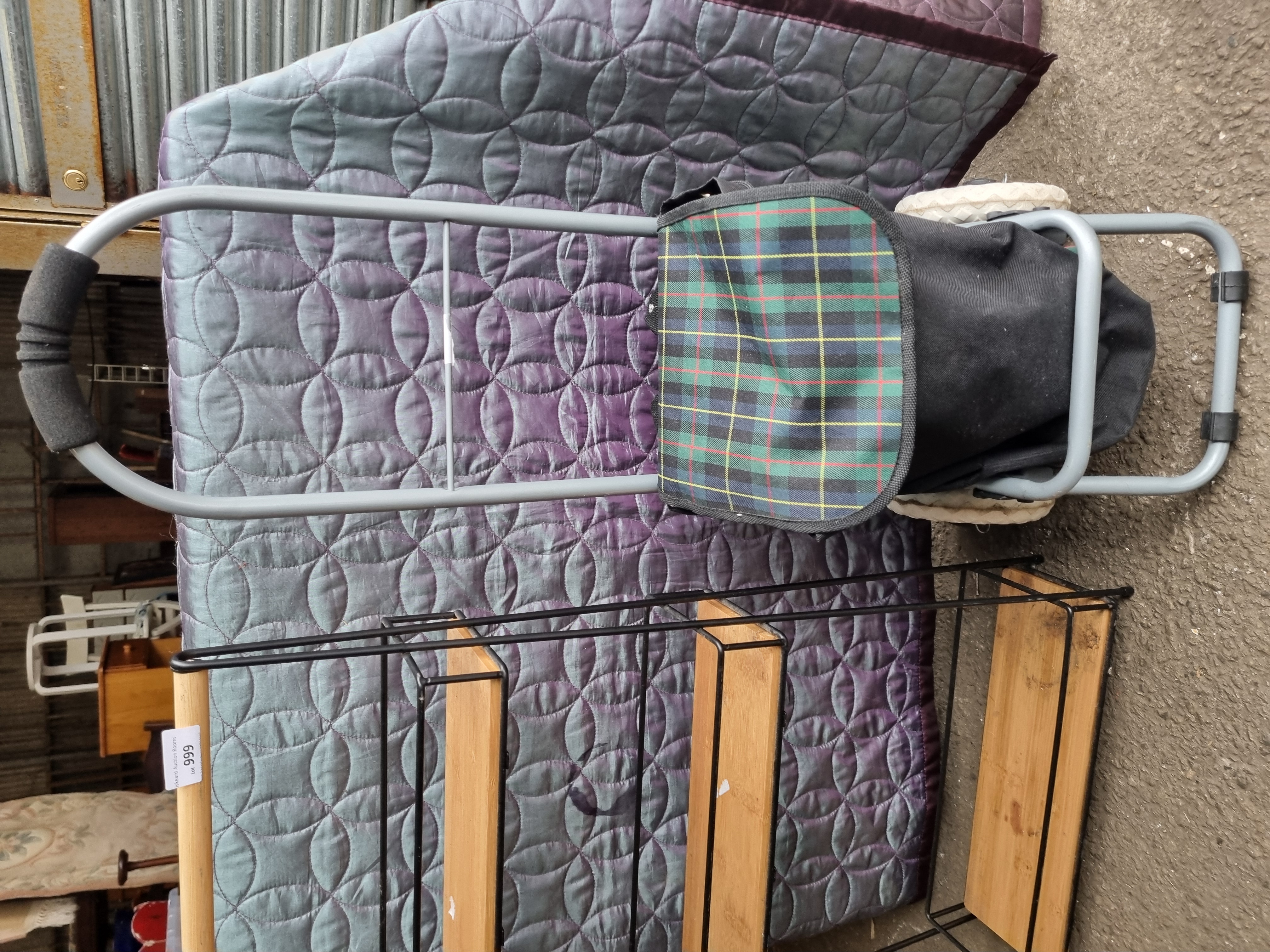 A collection of three household items. The first is a two-wheeled shopping trolley featuring a grey metal frame with a foam-padded handle and a black canvas bag topped with a green and red tartan-patterned flap. The second item is a three-tier storage or plant stand constructed with a black-finished metal wire frame supporting three wooden slat shelves, finished with a wooden dowel handle at the top; it bears a sticker from Liskeard Auction Rooms marked Lot 999. The third item is a large quilted fabric comforter or throw in an iridescent purple colour with a circular stitched pattern and a dark maroon border. All items are loose and show physical characteristics consistent with previous use.