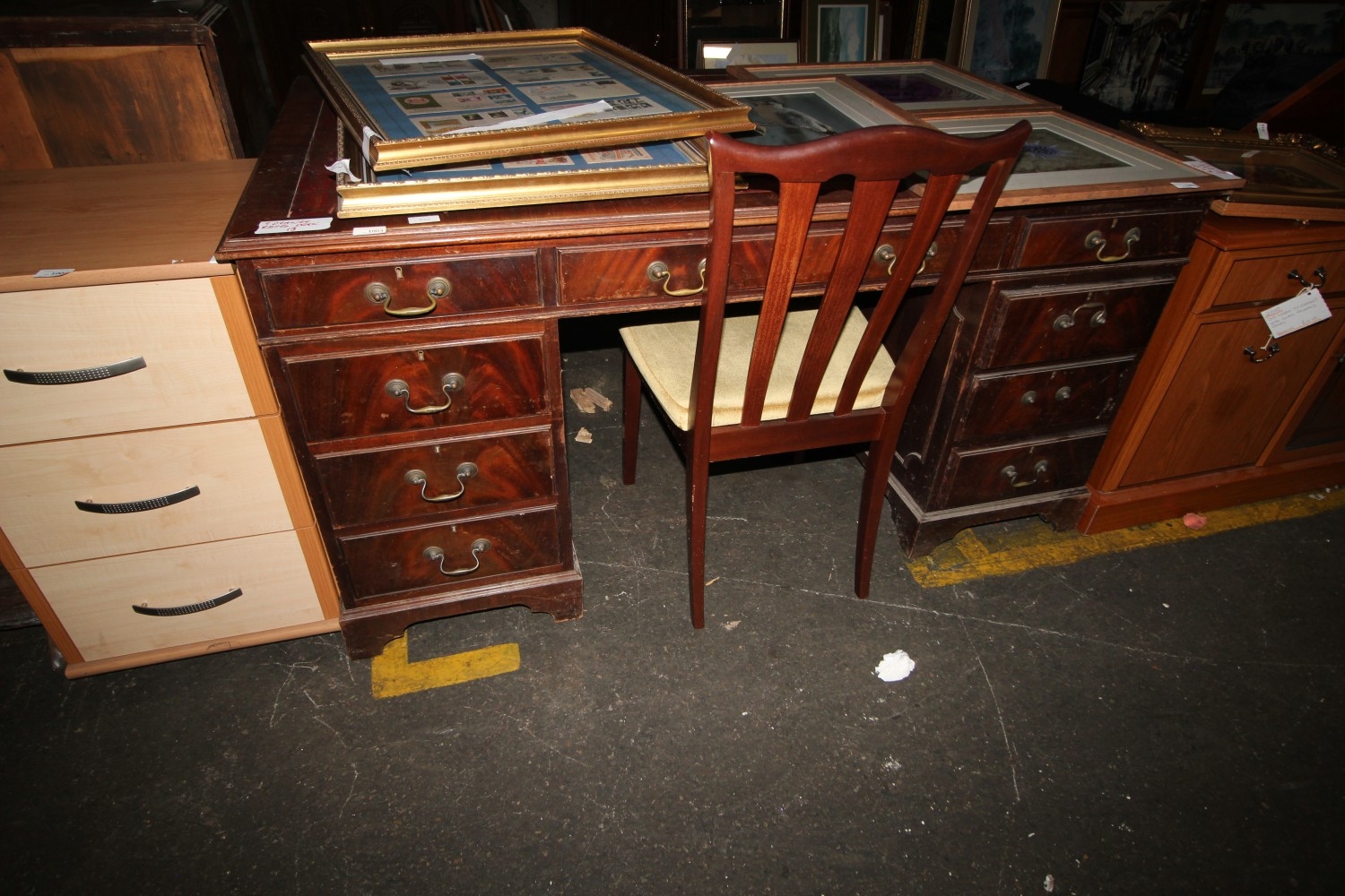 Lot 1003: Nine-drawered repro dovetailed mahogany desk with brass pull...