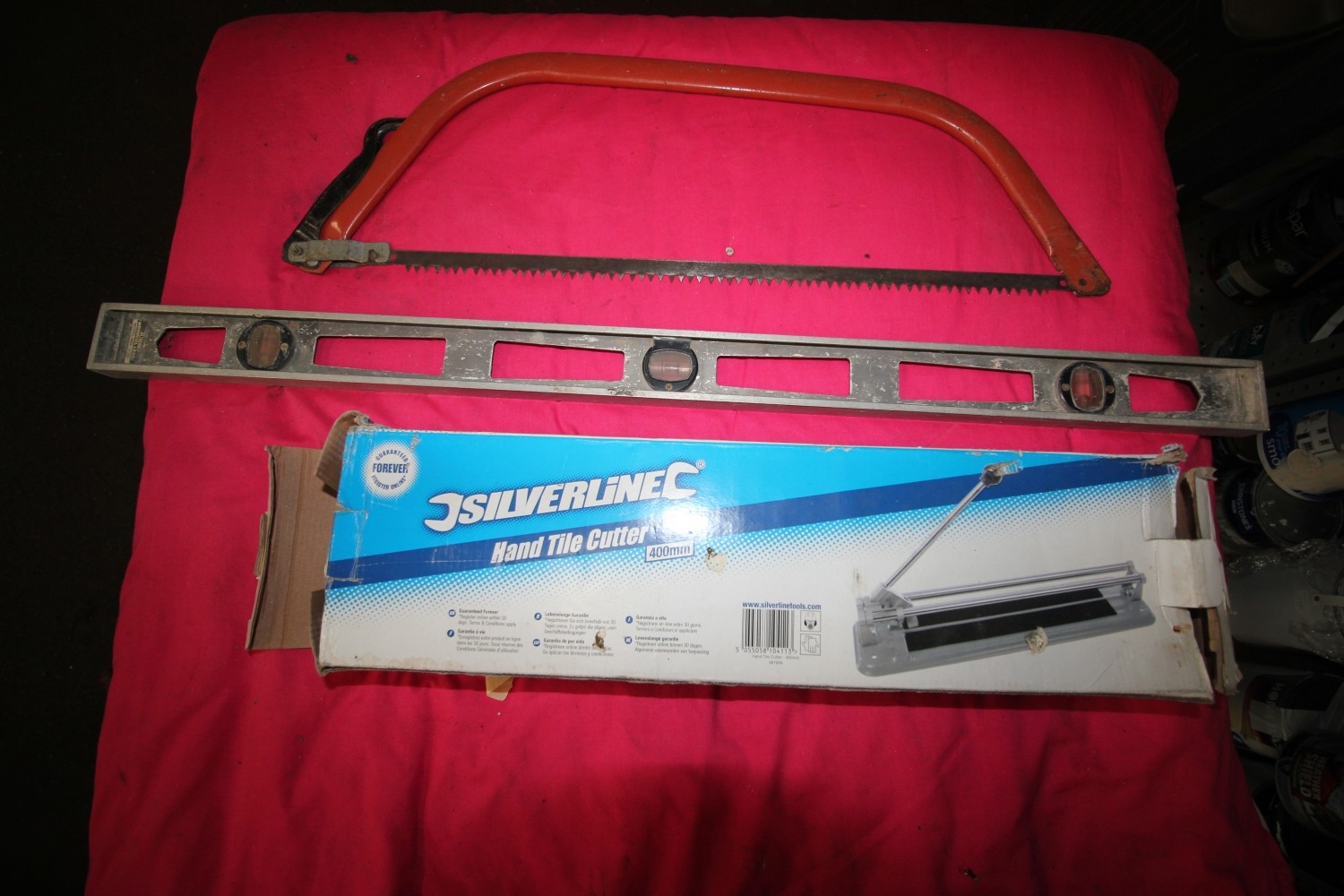 Mixed tools inc boxed Silverline 400mm tile cutter, bow saw and spirit level
