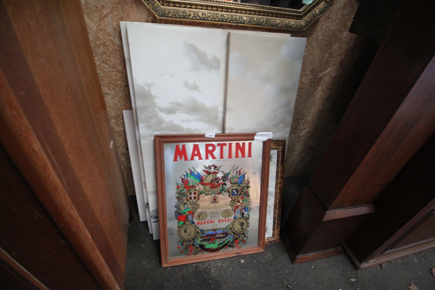 a selection of painings snd mirrors inc a advertising martini mirroe and a sky scene on cancas
