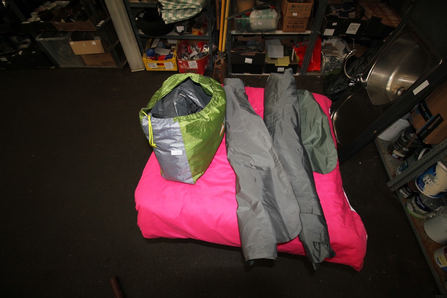 Shelf of camping items inc two inflatable lightweight air mattresses and a Soul 300 tent