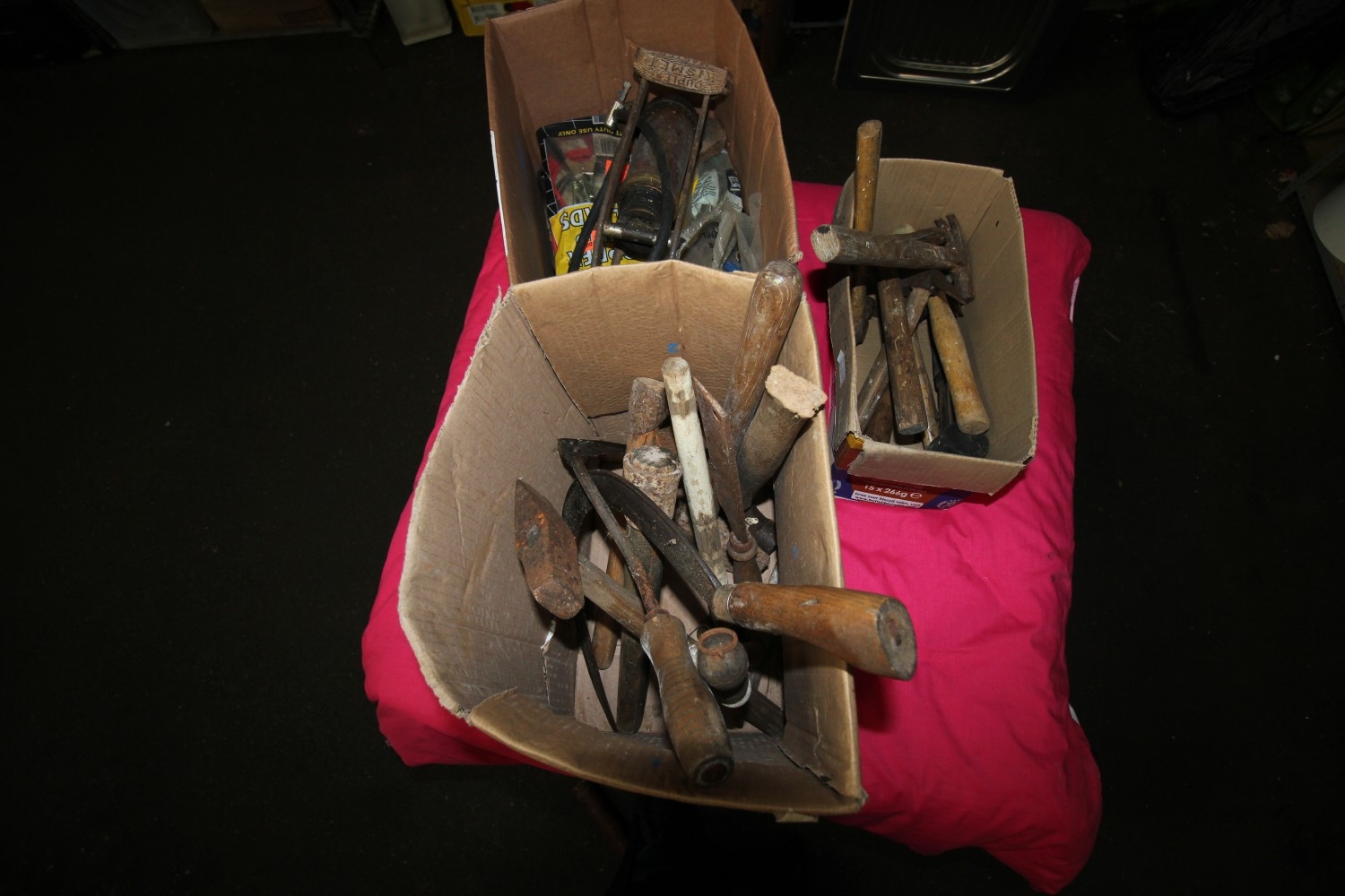 Three boxes of vintage hand tools inc many hammers, sickles, railway hammer, lathe splitter, kismet duplex master pump, jump leads and more