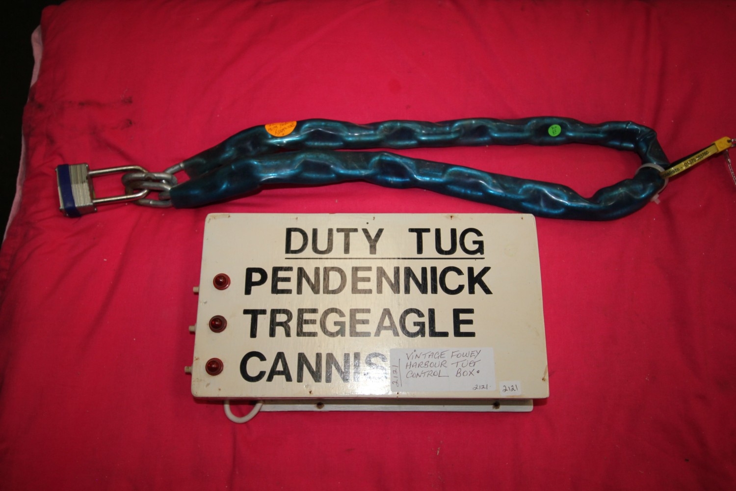 Vintage hand-made Fowey Harbour Tug control box and a large motorcycle security chain with padlock and key