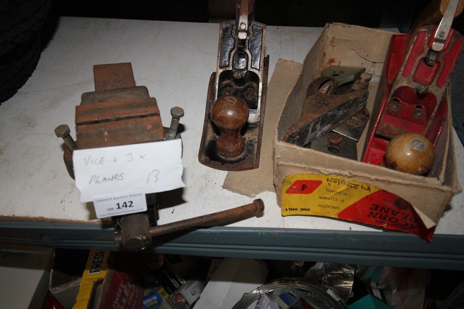 Vintage Woden 186B/0 vice and three vintage wood planes inc boxed Chapman Acorn plane by Stanley etc