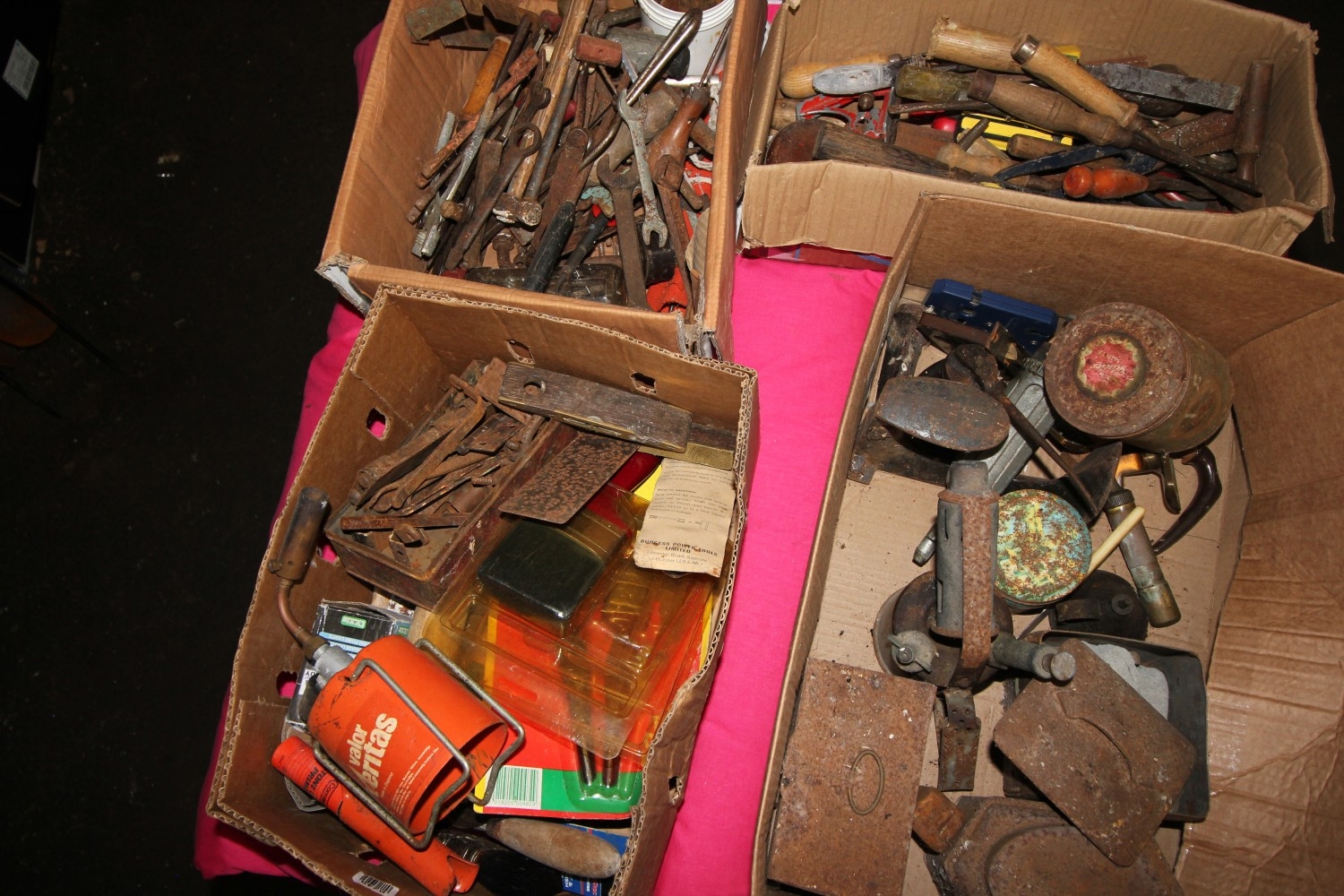 Four boxes of tools inc vintage wood chisels, tin snips, cobblers last, vintage tins and blowtorches, spanners, screwdrivers and much more