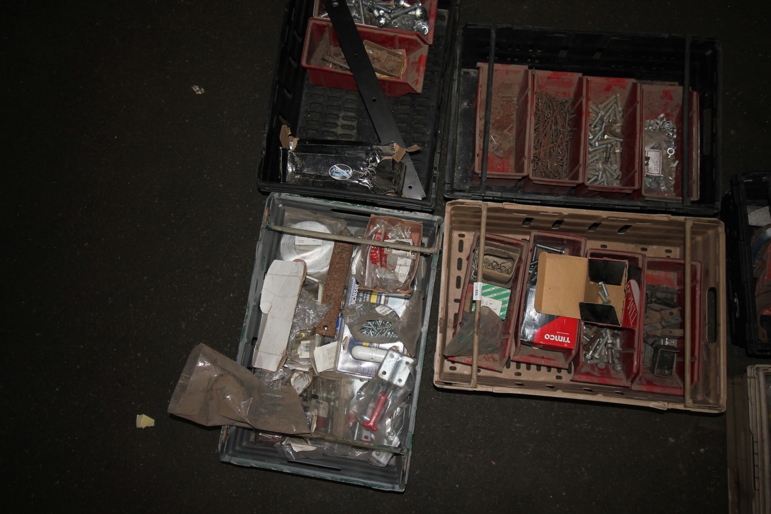 Four crates of misc hardware and fixings inc Timco carriage bolts, cup hooks, door closer, galvanised banding, strap hinge, two boxes 180mm hex bolts and more