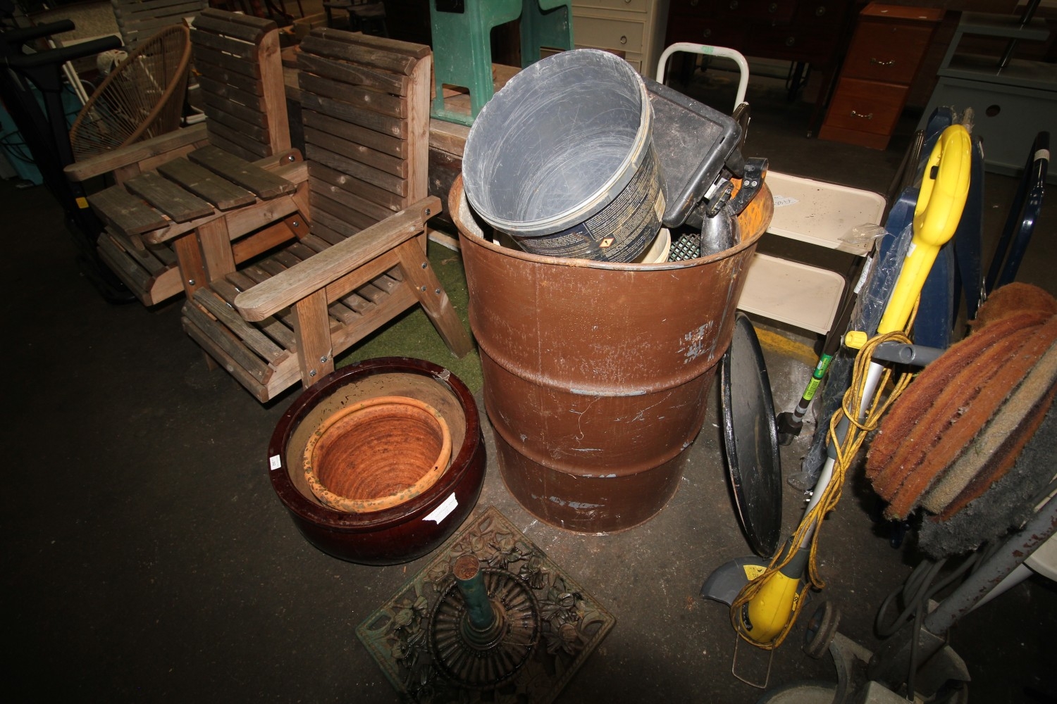 Large lidded steel drum and contents inc storage box, vintage galvanised soil sieve, plant pots and more