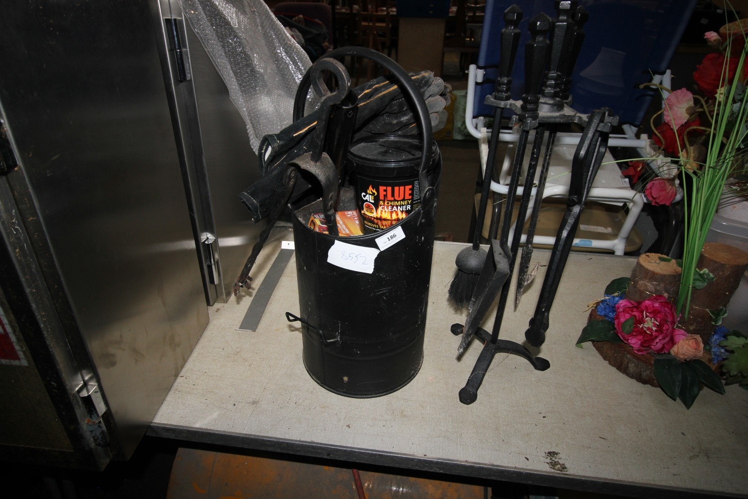 Lot 186: Black wrought iron fireside companion set plus matching...