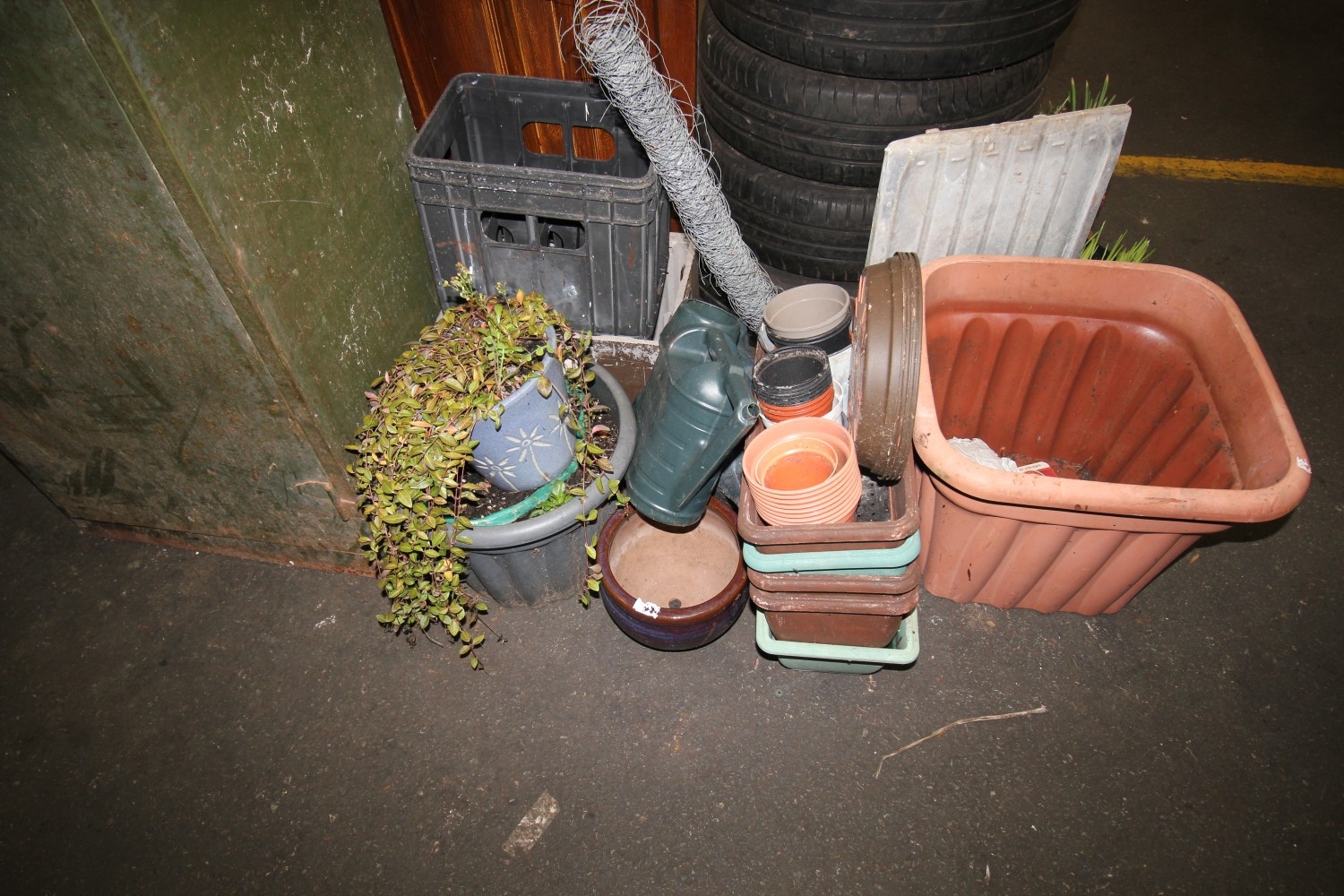 Very large selection of gardening items inc. large square terracotta planter measuring 48cm across by 40cm in height, part roll of chicken wire, glazed earthenware planter, flower troughs and pots, blue-glazed planter, watering can and more