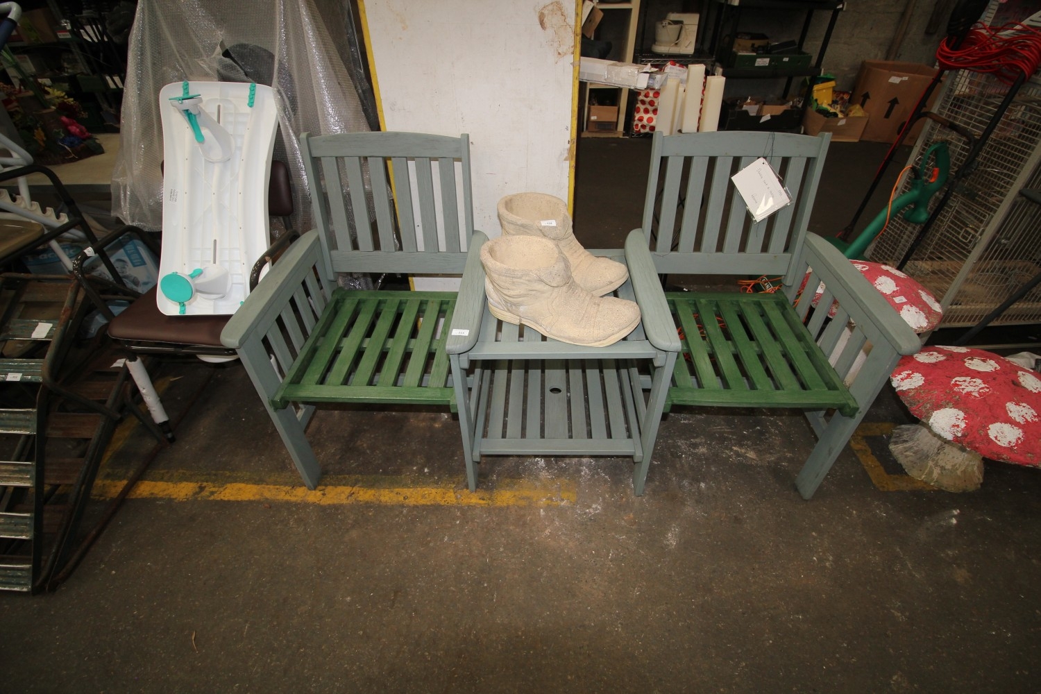 Painted teak twin garden seat with adjoining table and shelf under