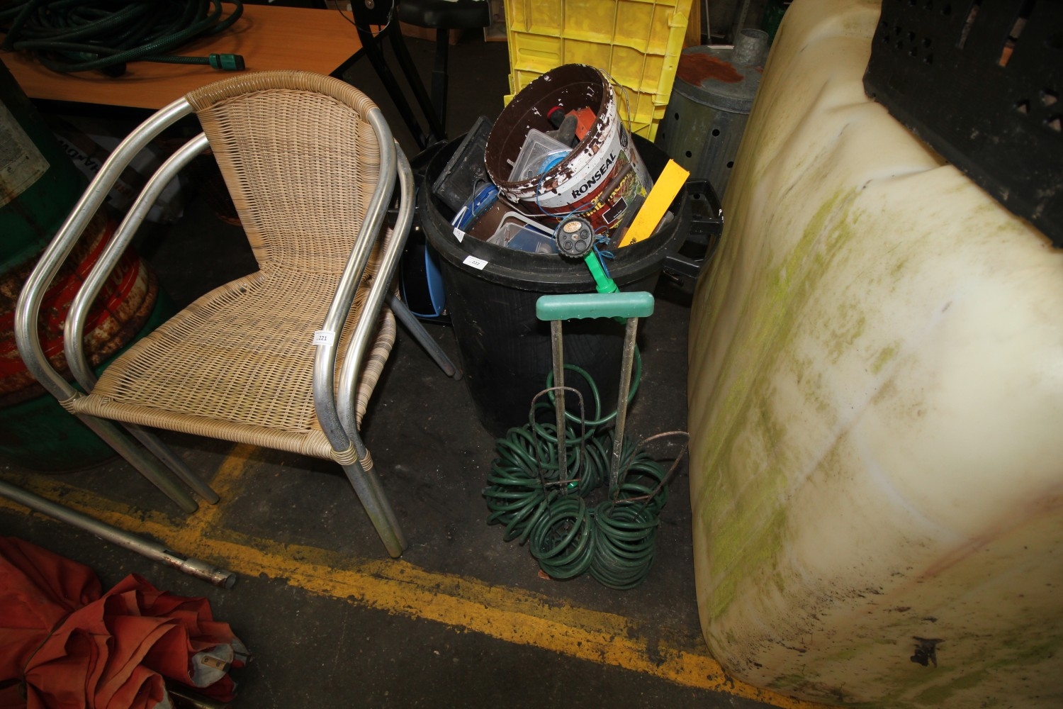 Large black plastic dustbin and contents inc. spacesaver garden hose, fixings, tools, g-clamps etc