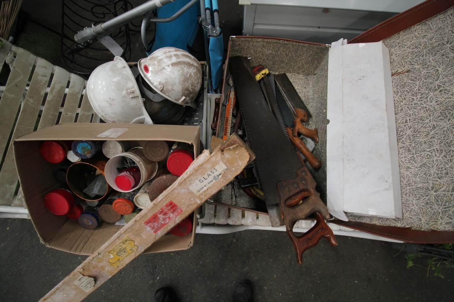 Quantity of vintage handsaws, brass capped wooden spirit level with glass bubble vials still with some of the original packaging by John Rabone and Sons of Birmingham. Two saws by German manufacturer BAIER plus others, and bow saws, tenon saws, collated screws, vintage National Machinery bench grinder and more