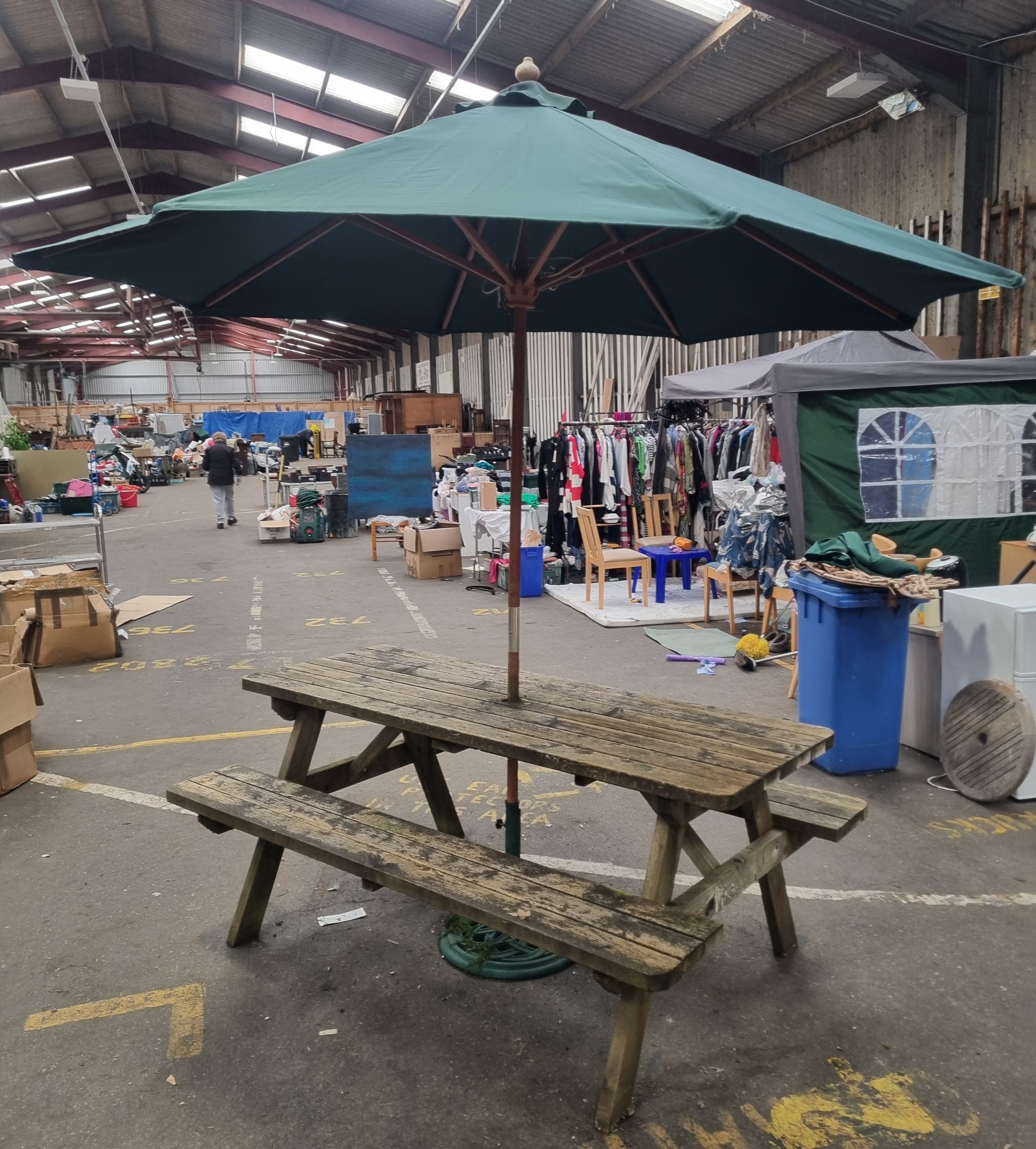 Tanalised pine picnic bench with parasol with cast iron weighted base in very good condition
