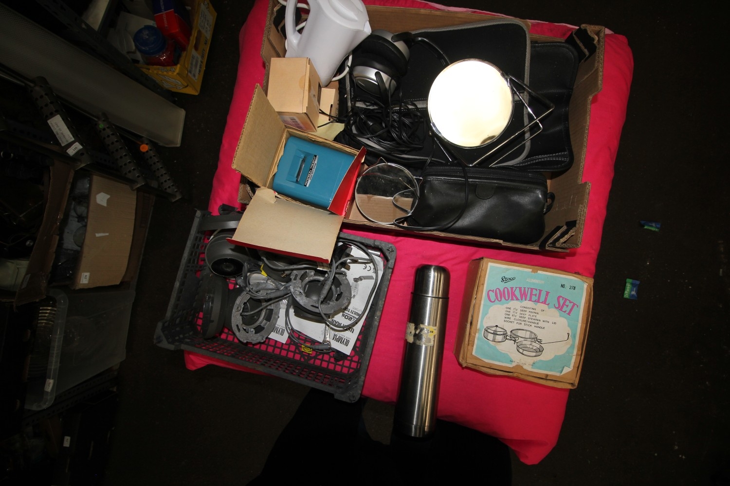Lot 271: box of misc contents inc metal flask, headphones,...