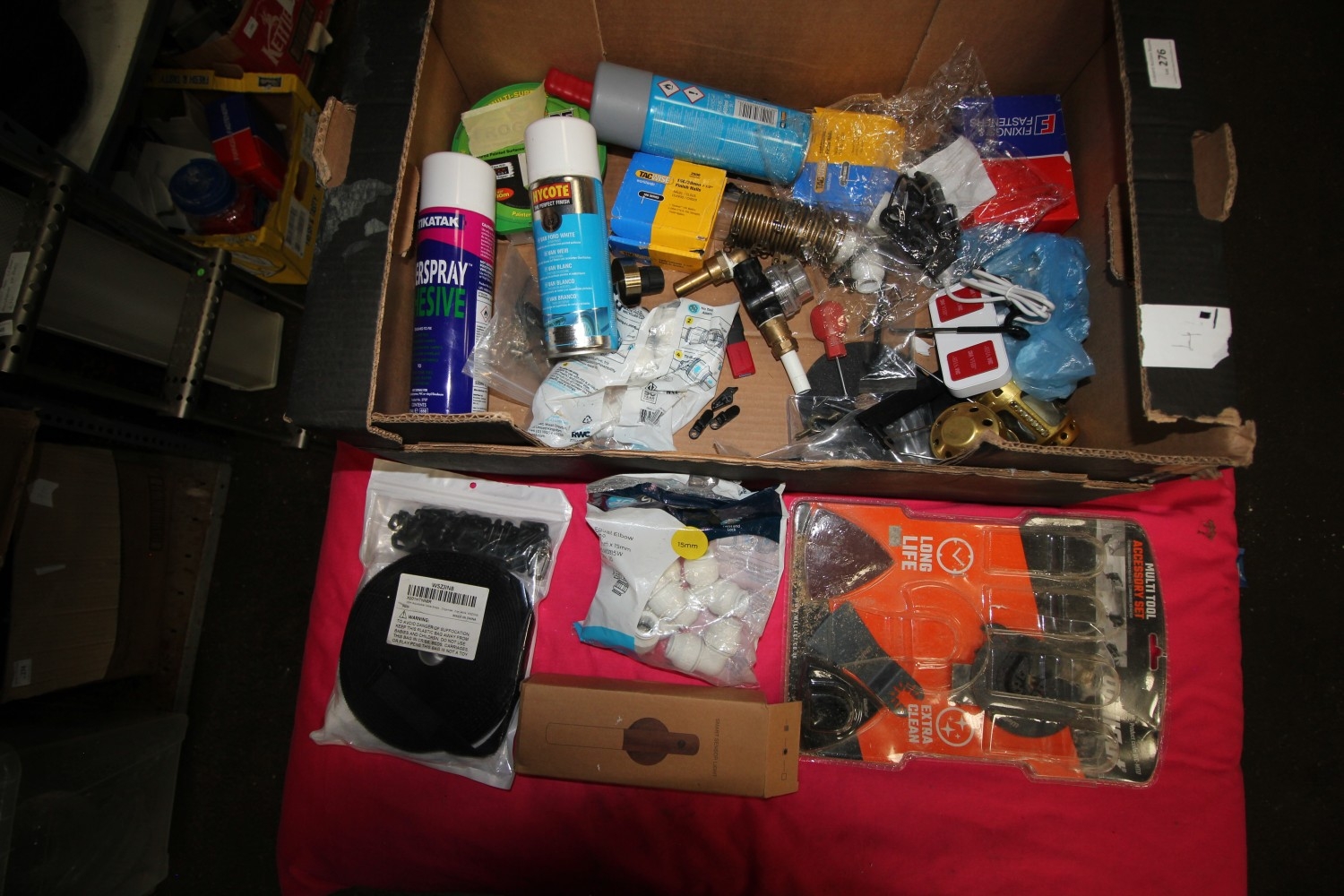 box of misc items inc smart sensor light, multi car charging tool, adhesive sprays, hardware and more