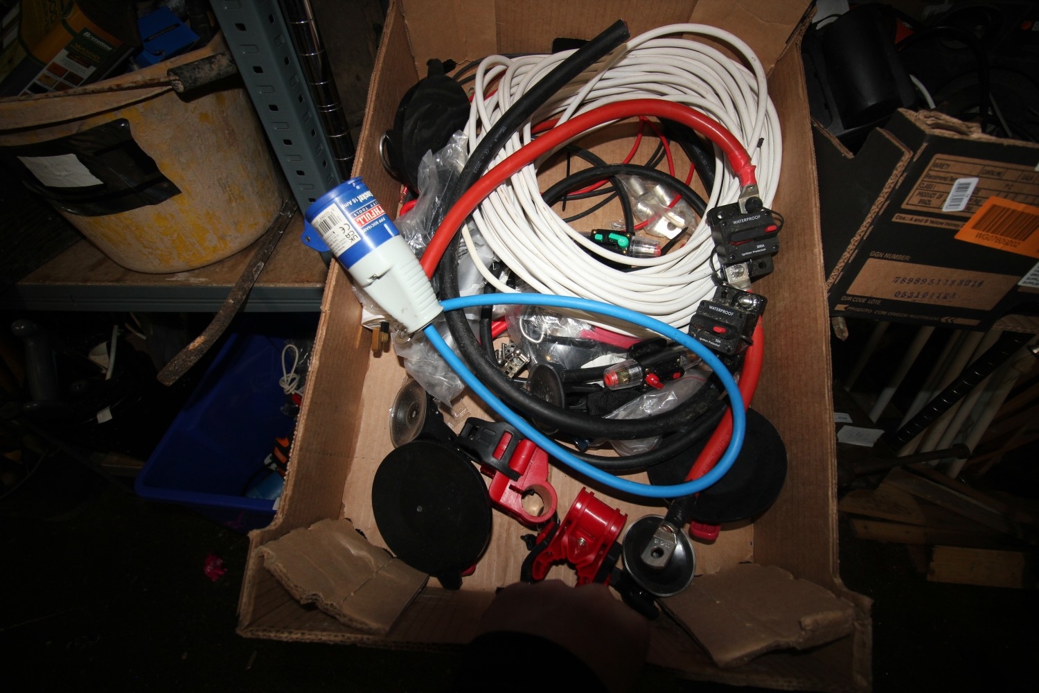 Quantity of electrical wiring equipment inc. large length of round 1.5mm twin electrical cable, section of 95mm2 cable, heavy-duty leisure battery connection lead with terminals and 300A 12v breaker switch, 16A camper / caravan fly-lead, various other inline 12v breaker switches – 30A, 40A, 50A plus various other camper related items