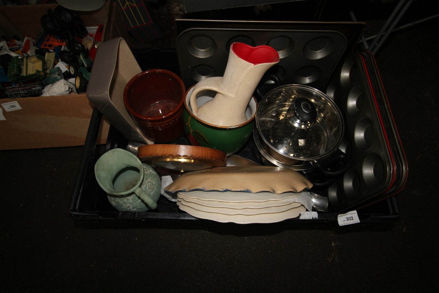 box of misc ceramic ware inc decorative plate with parrot, saucepans, baking trays and more